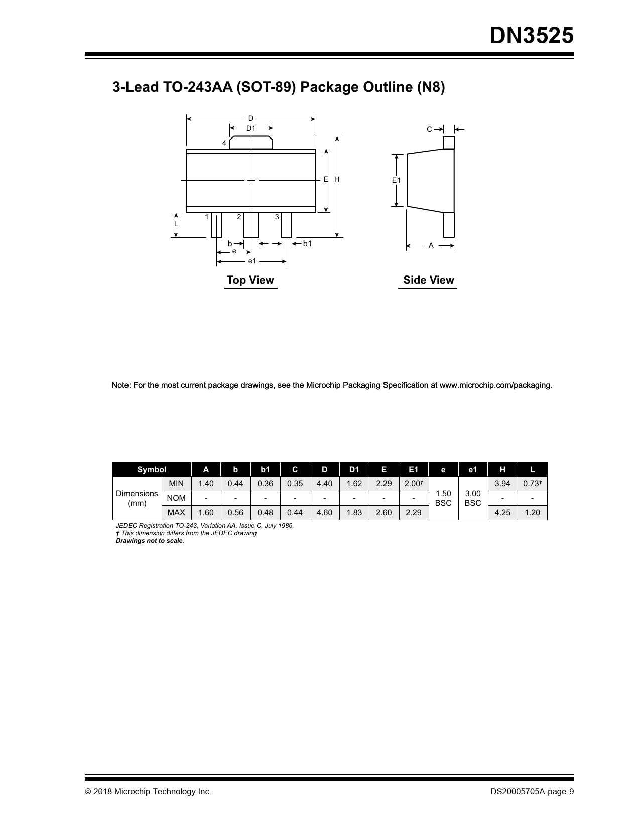 DN3525. 3-Lead TO-243AA (SOT-89) Package Outline (N8). Top View. Side View. Symbol. Drawings not to scale