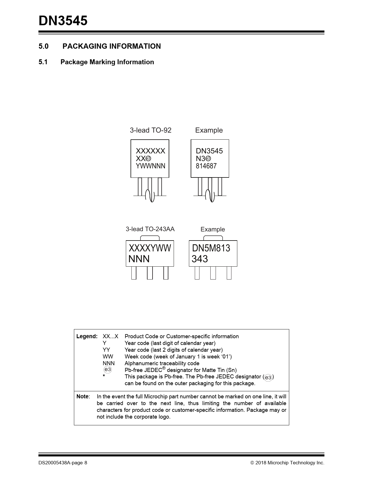 DN35455.0PACKAGING INFORMATION5.1Package Marking Information 3-lead TO-92 Example XXXXXX DN3545 XXe3 N3 e3 YWWNNN 814687 3-lead TO-243AA Example XXXXYWW DN5M813 NNN 343 Legend: XX...X Product Code or Customer-specific information Y Year code (last digit of calendar year) YY Year code (last 2 digits of calendar year) WW Week code (week of January 1 is week ‘01’) NNN Alphanumeric traceability code e3 Pb-free JEDEC® designator for Matte Tin (Sn) * This package is Pb-free. The Pb-free JEDEC designator ( ) e3 can be found on the outer packaging for this package. Note : In the event the full Microchip part number cannot be marked on one line, it will be carried over to the next line, thus limiting the number of available characters for product code or customer-specific information. Package may or not include the corporate logo. DS20005438A-page 8 2018 Microchip Technology Inc. Document Outline 1.0 Electrical Characteristics 2.0 Typical Performance Curves FIGURE 2-1: Output Characteristics. FIGURE 2-2: Transconductance vs. Drain Current. FIGURE 2-3: Maximum Rated Safe Operating Area. FIGURE 2-4: Saturation Characteristics. FIGURE 2-5: Power Dissipation vs. Ambient Temperature. FIGURE 2-6: Thermal Response Characteristics. FIGURE 2-7: BVDSS Variation with Temperature. FIGURE 2-8: Transfer Characteristics. FIGURE 2-9: Capacitance vs. Drain-to- Source Voltage. FIGURE 2-10: On-Resistance vs. Drain Current. FIGURE 2-11: VGS(th) and RDS(ON) Variation with Temperature. FIGURE 2-12: Gate Drive Dynamic Characteristics. 3.0 Pin Description TABLE 3-1: 3-lead TO-92 Pin Function Table TABLE 3-2: 3-lead SOT-89 Pin Function Table 4.0 Functional Description FIGURE 4-1: Switching Waveforms and Test Circuit. TABLE 4-1: Product Summary 5.0 Packaging Information 5.1 Package Marking Information AMERICAS Corporate Office Atlanta Austin, TX Boston Chicago Dallas Detroit Houston, TX Indianapolis Los Angeles Raleigh, NC New York, NY San Jose, CA Canada - Toronto ASIA/PACIFIC Australia - Sydney China - Beijing China - Chengdu China - Chongqing China - Dongguan China - Guangzhou China - Hangzhou China - Hong Kong SAR China - Nanjing China - Qingdao China - Shanghai China - Shenyang China - Shenzhen China - Suzhou China - Wuhan China - Xian China - Xiamen China - Zhuhai ASIA/PACIFIC India - Bangalore India - New Delhi India - Pune Japan - Osaka Japan - Tokyo Korea - Daegu Korea - Seoul Malaysia - Kuala Lumpur Malaysia - Penang Philippines - Manila Singapore Taiwan - Hsin Chu Taiwan - Kaohsiung Taiwan - Taipei Thailand - Bangkok Vietnam - Ho Chi Minh EUROPE Austria - Wels Denmark - Copenhagen Finland - Espoo France - Paris Germany - Garching Germany - Haan Germany - Heilbronn Germany - Karlsruhe Germany - Munich Germany - Rosenheim Israel - Ra’anana Italy - Milan Italy - Padova Netherlands - Drunen Norway - Trondheim Poland - Warsaw Romania - Bucharest Spain - Madrid Sweden - Gothenberg Sweden - Stockholm UK - Wokingham