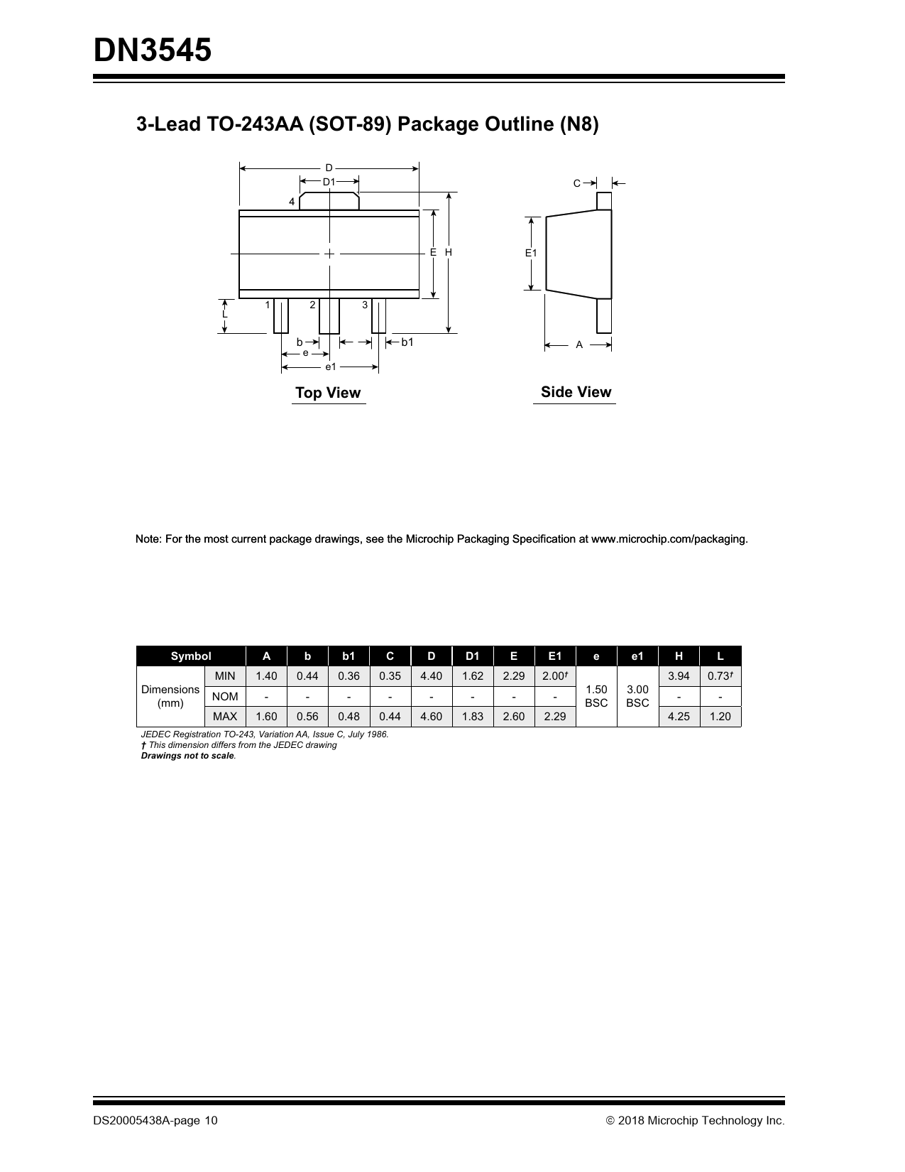 DN3545. 3-Lead TO-243AA (SOT-89) Package Outline (N8). Top View. Side View. Symbol. Drawings not to scale
