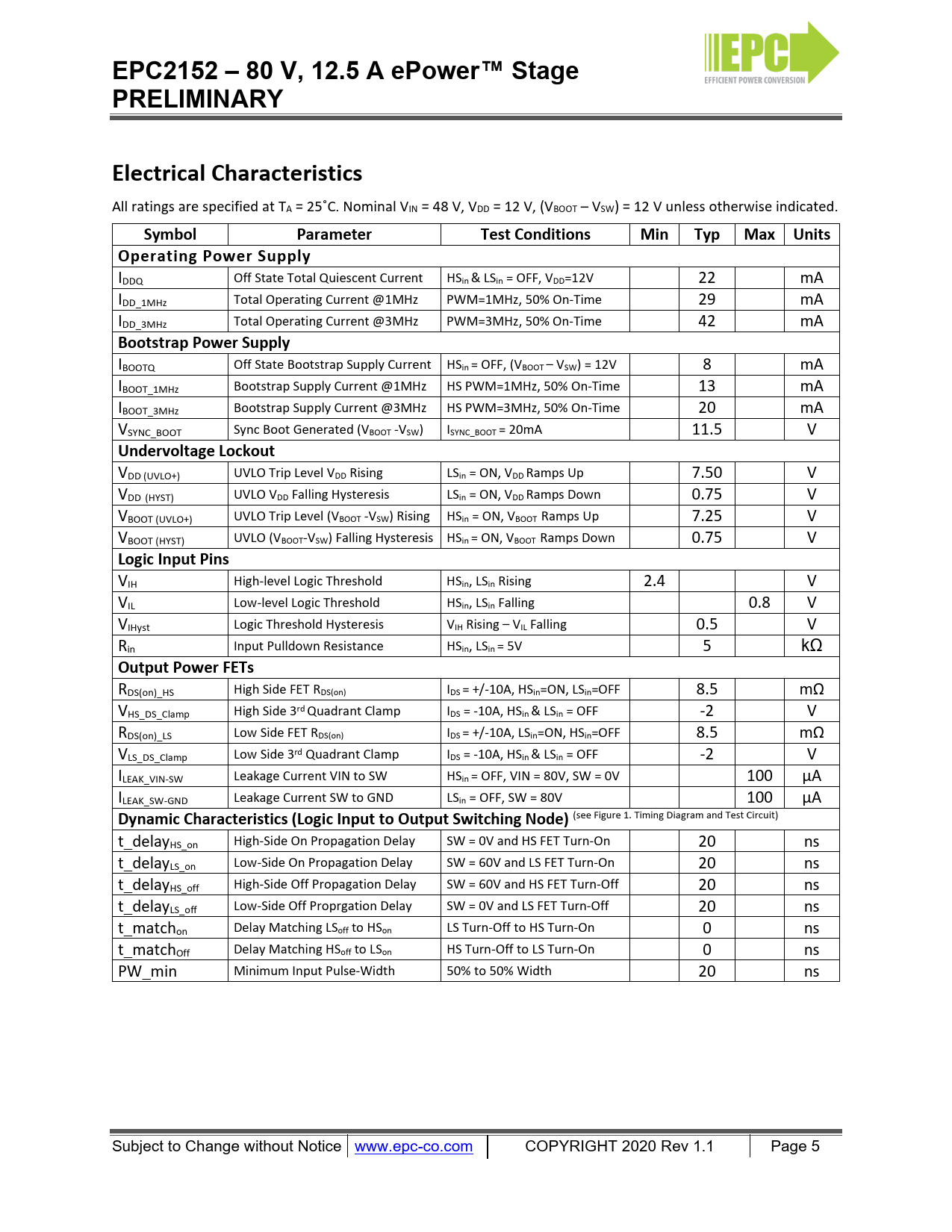 EPC2152 – 80 V, 12.5 A ePower™ Stage. PRELIMINARY. Electrical Characteristics. Symbol. Parameter. Test Conditions