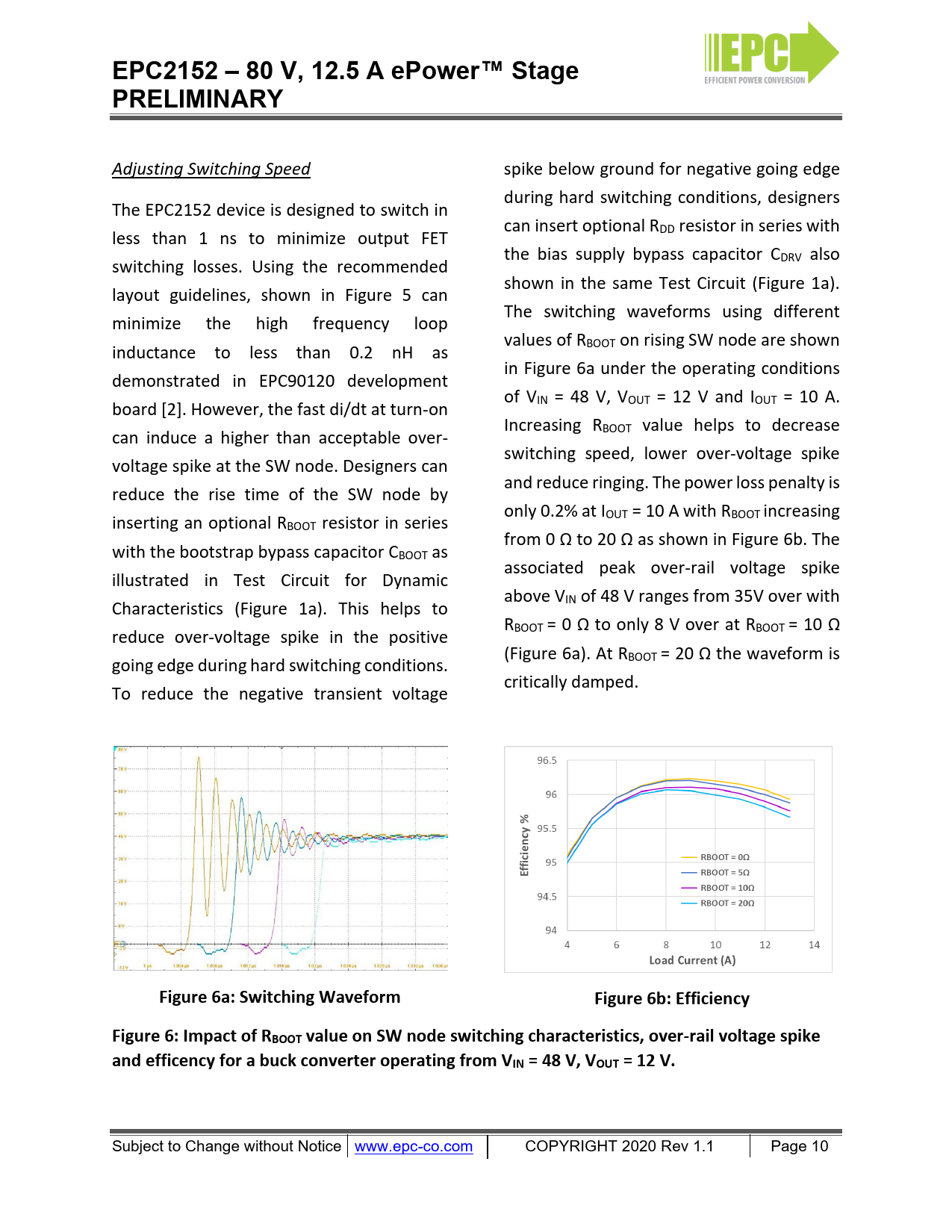 EPC2152 – 80 V, 12.5 A ePower™ StagePRELIMINARY Adjusting Switching Speed spike below ground for negative going edge during hard switching conditions, designers The EPC2152 device is designed to switch in less than 1 ns to minimize output FET can insert optional RDD resistor in series with the bias supply bypass capacitor C switching losses. Using the recommended DRV also shown in the same Test Circuit (Figure 1a). layout guidelines, shown in Figure 5 can The switching waveforms using different minimize the high frequency loop values of R inductance to less than 0.2 nH as BOOT on rising SW node are shown demonstrated in EPC90120 development in Figure 6a under the operating conditions of V board [2]. However, the fast di/dt at turn-on IN = 48 V, VOUT = 12 V and IOUT = 10 A. can induce a higher than acceptable over- Increasing RBOOT value helps to decrease switching speed, lower over-voltage spike voltage spike at the SW node. Designers can and reduce ringing. The power loss penalty is reduce the rise time of the SW node by inserting an optional R only 0.2% at IOUT = 10 A with RBOOT increasing BOOT resistor in series from 0 Ω to 20 Ω as shown in Figure 6b. The with the bootstrap bypass capacitor CBOOT as illustrated in Test Circuit for Dynamic associated peak over-rail voltage spike above V Characteristics (Figure 1a). This helps to IN of 48 V ranges from 35V over with R reduce over-voltage spike in the positive BOOT = 0 Ω to only 8 V over at RBOOT = 10 Ω going edge during hard switching conditions. (Figure 6a). At RBOOT = 20 Ω the waveform is critically damped. To reduce the negative transient voltage Figure 6a: Switching WaveformFigure 6b: EfficiencyFigure 6: Impact of RBOOT value on SW node switching characteristics, over-rail voltage spikeand efficency for a buck converter operating from VIN = 48 V, VOUT = 12 V. Subject to Change without Notice www.epc-co.com COPYRIGHT 2020 Rev 1.1 Page 10