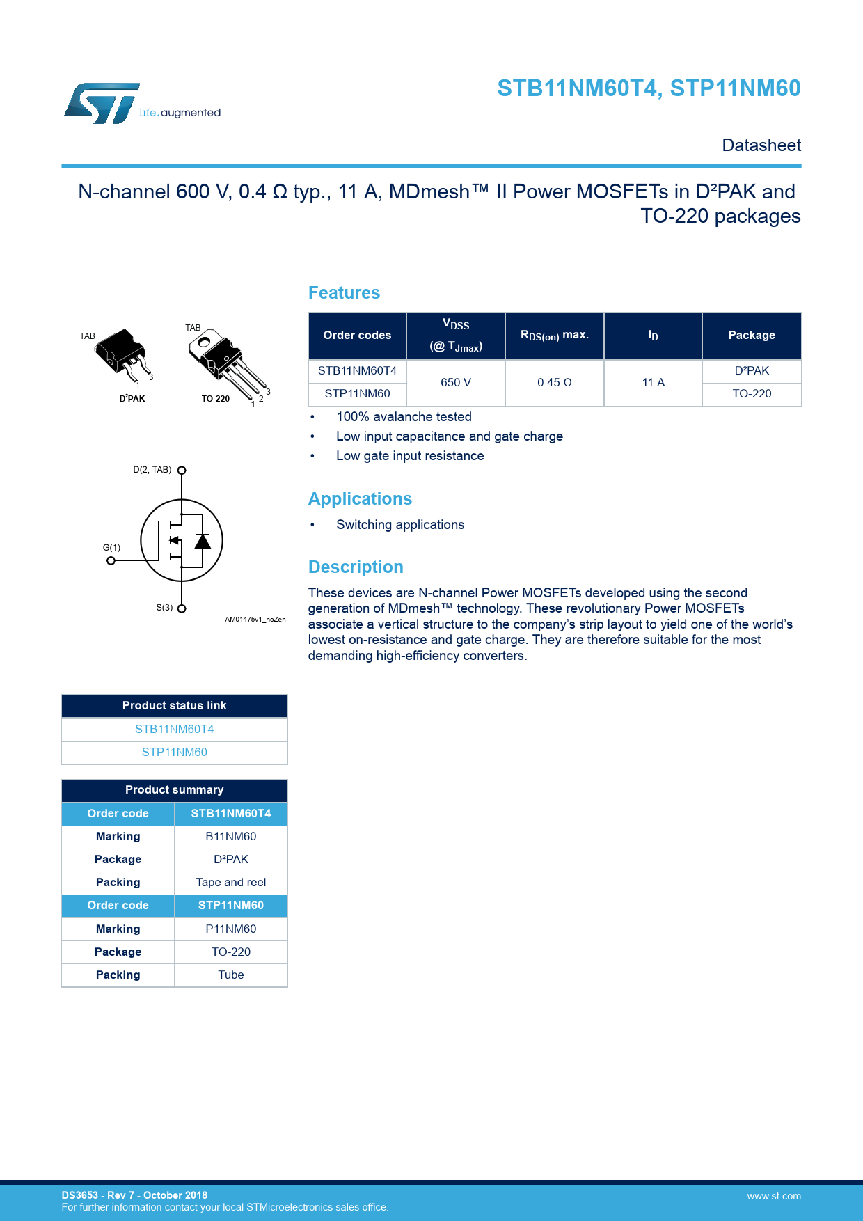 STB11NM60T4, STP11NM60 Datasheet N-channel 600 V, 0.4 Ω typ., 11 A, MDmesh™ II Power MOSFETs in D²PAK and TO-220 packages FeaturesV TAB DSS TAB Order codesRDS(on) max.IDPackage(@ TJmax) STB11NM60T4 D²PAK 3 1 650 V 0.45 Ω 11 A 3 STP11NM60 TO-220 D P2 AKTO-220 2 1 • 100% avalanche tested • Low input capacitance and gate charge • Low gate input resistance D(2, TAB) Applications • Switching applications G(1) Description These devices are N-channel Power MOSFETs developed using the second S(3) generation of MDmesh™ technology. These revolutionary Power MOSFETs AM01475v1_noZen associate a vertical structure to the company’s strip layout to yield one of the world’s lowest on-resistance and gate charge. They are therefore suitable for the most demanding high-efficiency converters. Product status link STB11NM60T4 STP11NM60 Product summaryOrder codeSTB11NM60T4Marking B11NM60 Package D²PAK Packing Tape and reel Order codeSTP11NM60Marking P11NM60 Package TO-220 Packing Tube DS3653 - Rev 7 - October 2018 www.st.com For further information contact your local STMicroelectronics sales office. Document Outline 1 Electrical ratings 2 Electrical characteristics 2.1 Electrical characteristics (curves) 3 Test circuits 4 Package information 4.1 D²PAK (TO-263) type A package information 4.2 D²PAK packing information 4.3 D²PAK (TO-263) type B package information 4.4 D²PAK type B packing information 4.5 TO-220 type A package information Revision history
