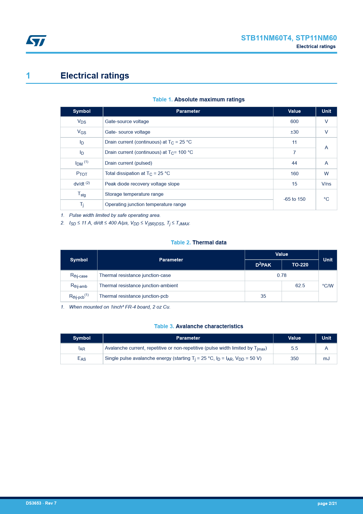 STB11NM60T4, STP11NM60. Electrical ratings. Table 1. Absolute maximum ratings. Symbol. Parameter. Value. Unit. Table 2. Thermal data