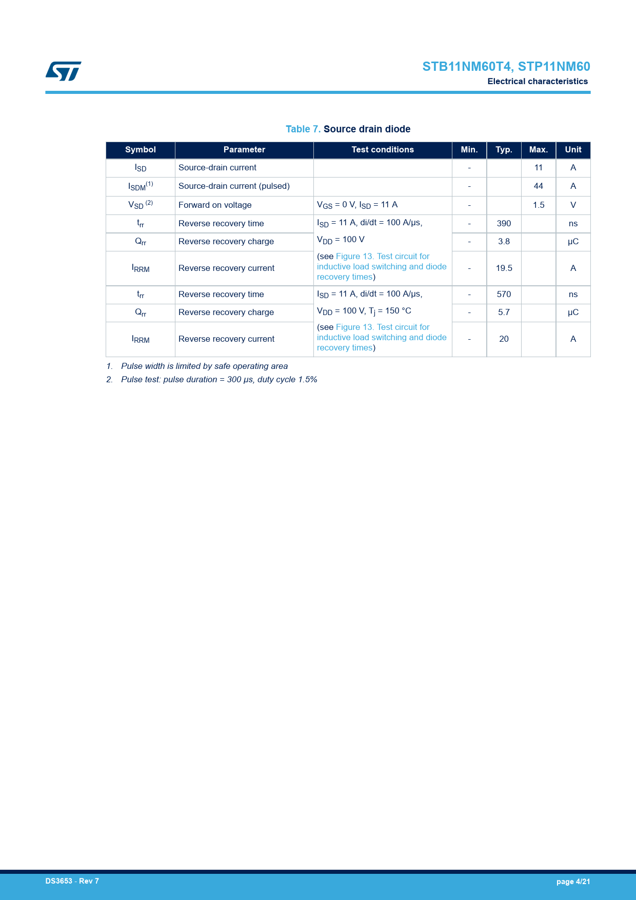Páginas / Página21 / 4 — STB11NM60T4, STP11NM60. Electrical characteristics. Table 7. Source drain …