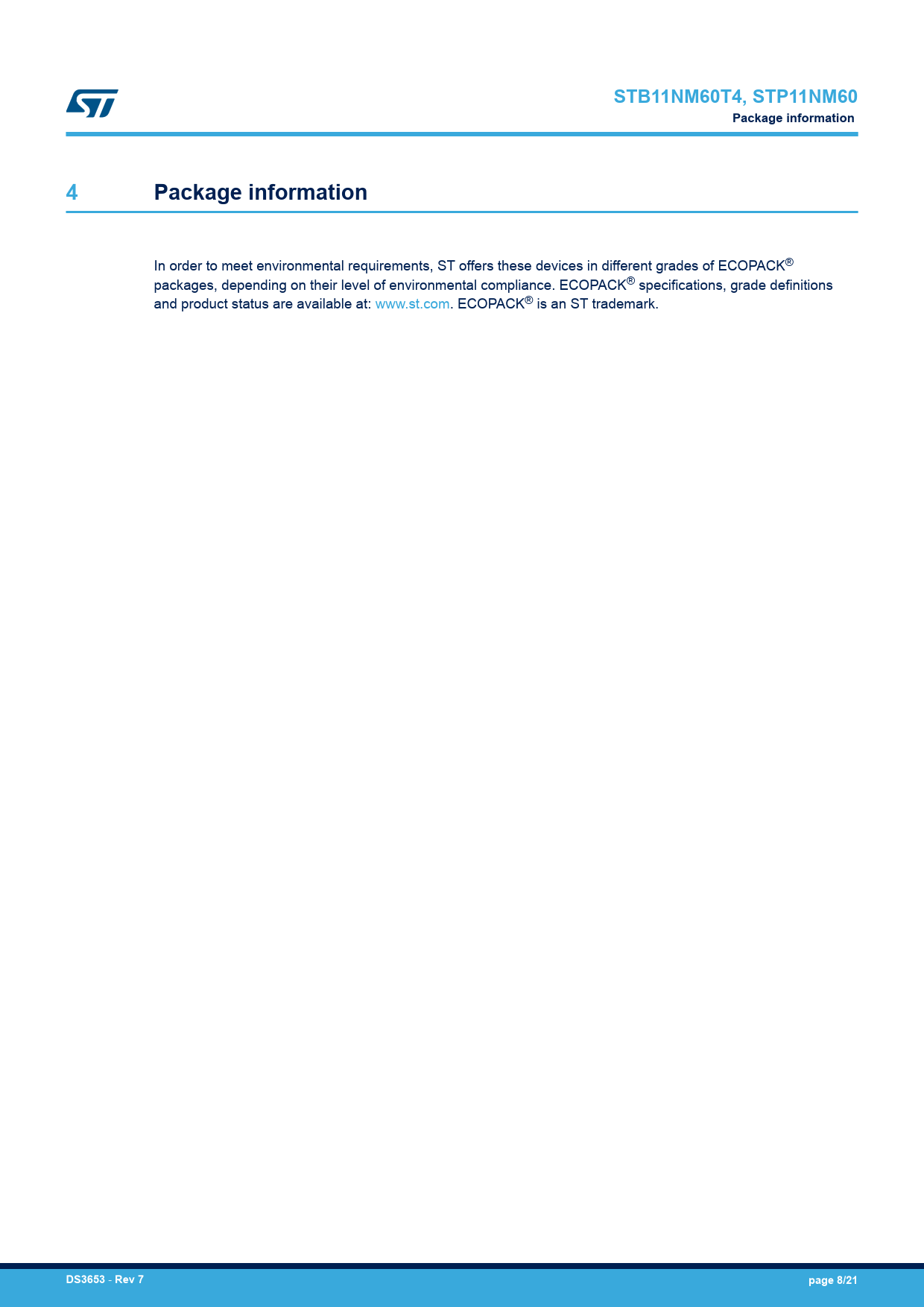 Páginas / Página21 / 8 — STB11NM60T4, STP11NM60. Package information. DS3653. Rev 7. page 8/21