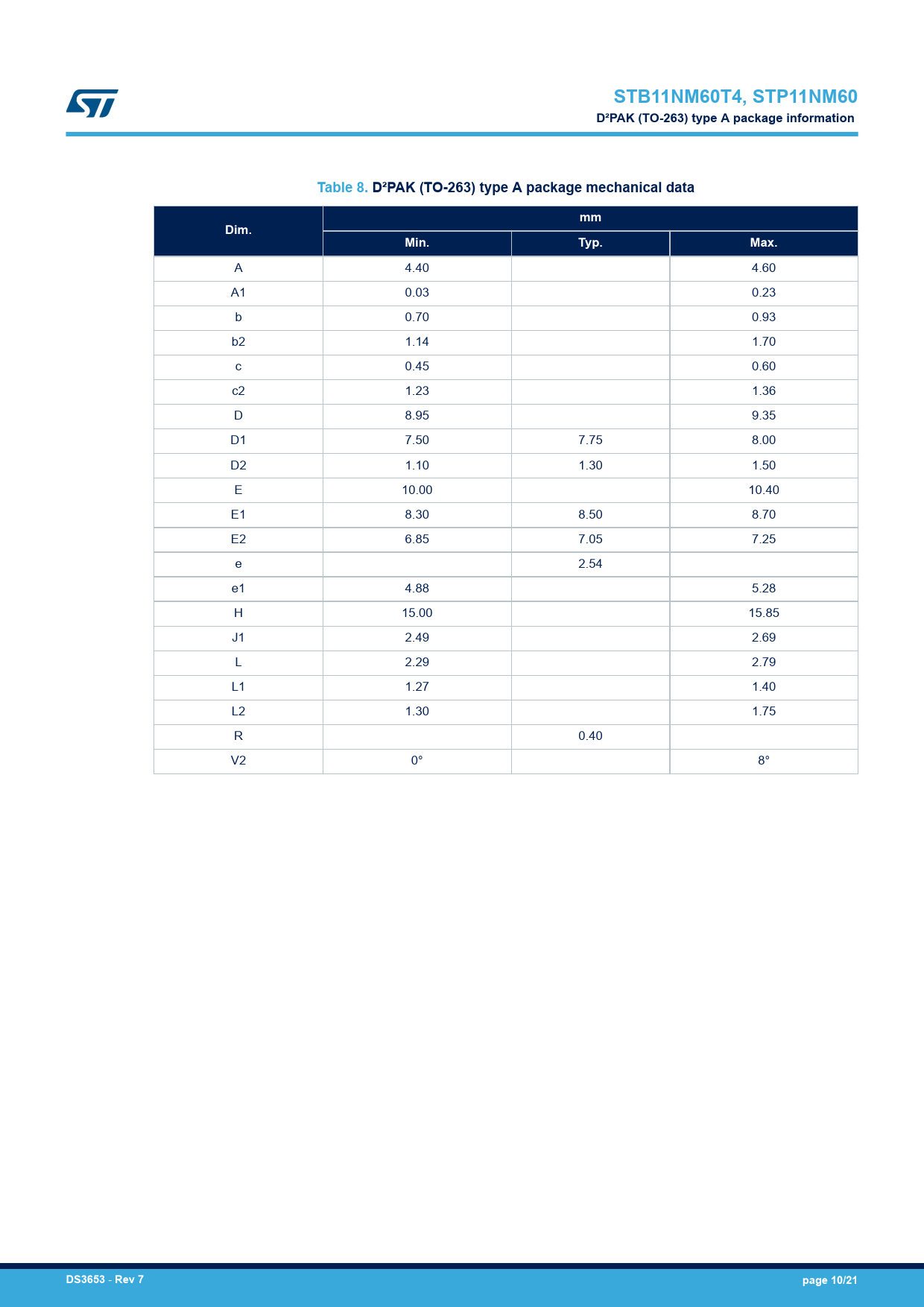 STB11NM60T4, STP11NM60D²PAK (TO-263) type A package informationTable 8. D²PAK (TO-263) type A package mechanical datammDim.Min.Typ.Max. A 4.40 4.60 A1 0.03 0.23 b 0.70 0.93 b2 1.14 1.70 c 0.45 0.60 c2 1.23 1.36 D 8.95 9.35 D1 7.50 7.75 8.00 D2 1.10 1.30 1.50 E 10.00 10.40 E1 8.30 8.50 8.70 E2 6.85 7.05 7.25 e 2.54 e1 4.88 5.28 H 15.00 15.85 J1 2.49 2.69 L 2.29 2.79 L1 1.27 1.40 L2 1.30 1.75 R 0.40 V2 0° 8° DS3653 - Rev 7page 10/21 Document Outline 1 Electrical ratings 2 Electrical characteristics 2.1 Electrical characteristics (curves) 3 Test circuits 4 Package information 4.1 D²PAK (TO-263) type A package information 4.2 D²PAK packing information 4.3 D²PAK (TO-263) type B package information 4.4 D²PAK type B packing information 4.5 TO-220 type A package information Revision history
