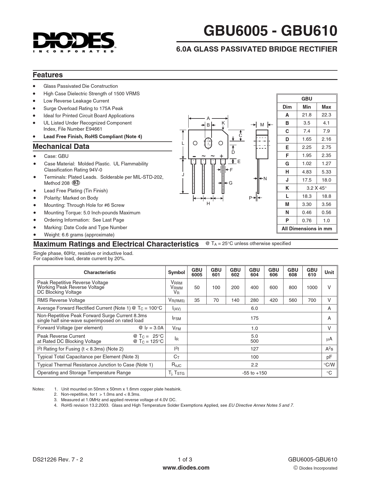 GBU6005 - GBU610. 6.0A GLASS PASSIVATED BRIDGE RECTIFIER. Features. GBU. Dim. Min. Max. Lead Free Finish, RoHS Compliant (Note 4)