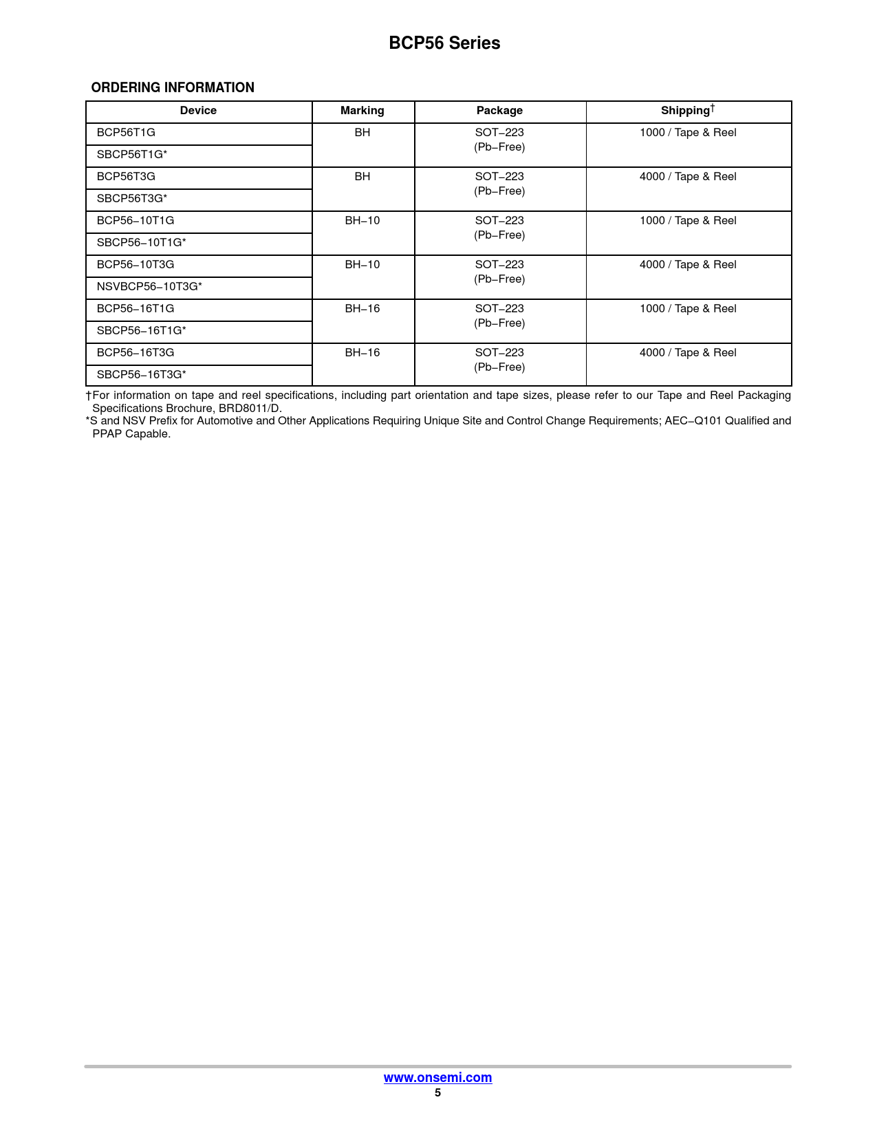 † BCP56T1G BH SOT−223 1000 / Tape & Reel (Pb−Free) SBCP56T1G* BCP56T3G BH SOT−223 4000 / Tape & Reel (Pb−Free) SBCP56T3G* BCP56−10T1G BH−10 SOT−223 1000 / Tape & Reel (Pb−Free) SBCP56−10T1G* BCP56−10T3G BH−10 SOT−223 4000 / Tape & Reel (Pb−Free) NSVBCP56−10T3G* BCP56−16T1G BH−16 SOT−223 1000 / Tape & Reel (Pb−Free) SBCP56−16T1G* BCP56−16T3G BH−16 SOT−223 4000 / Tape & Reel (Pb−Free) SBCP56−16T3G* †For information on tape and reel specifications, including part orientation and tape sizes, please refer to our Tape and Reel Packaging Specifications Brochure, BRD8011/D. *S and NSV Prefix for Automotive and Other Applications Requiring Unique Site and Control Change Requirements; AEC−Q101 Qualified and PPAP Capable.