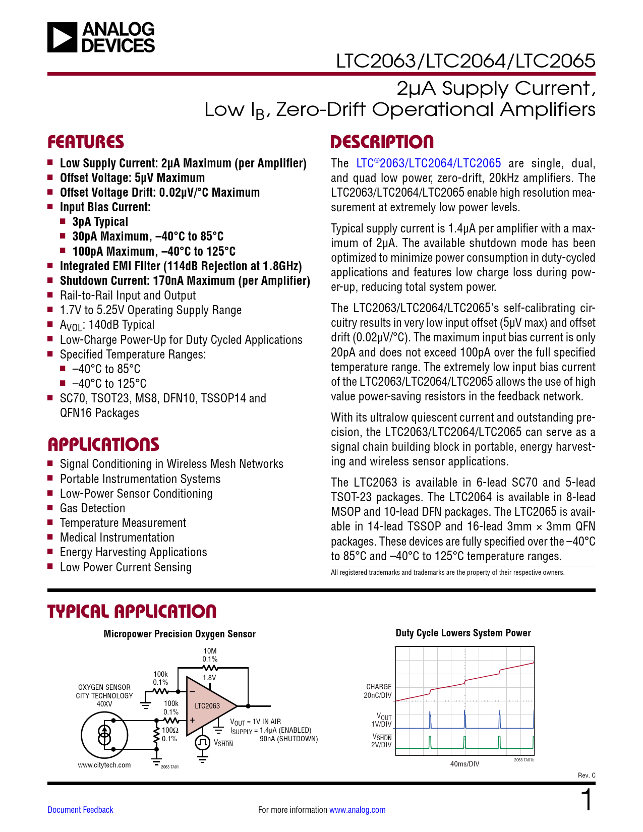 er-up, reducing total system power. n Rail-to-Rail Input and Output n 1.7V to 5.25V Operating Supply Range The LTC2063/LTC2064/LTC2065’s self-calibrating cir- n A cuitry results in very low input offset (5µV max) and offset VOL: 140dB Typical n Low-Charge Power-Up for Duty Cycled Applications drift (0.02µV/°C). The maximum input bias current is only n Specified Temperature Ranges: 20pA and does not exceed 100pA over the full specified n –40°C to 85°C temperature range. The extremely low input bias current n –40°C to 125°C of the LTC2063/LTC2064/LTC2065 allows the use of high n SC70, TSOT23, MS8, DFN10, TSSOP14 and value power-saving resistors in the feedback network. QFN16 Packages With its ultralow quiescent current and outstanding pre- cision, the LTC2063/LTC2064/LTC2065 can serve as a