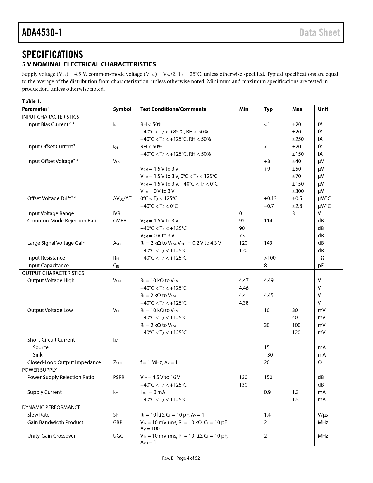 link to page 5 link to page 5 link to page 5 link to page 5 link to page 5 link to page 5 link to page 5 link to page 5 ADA4530-1Data SheetSPECIFICATIONS 5 V NOMINAL ELECTRICAL CHARACTERISTICS Supply voltage (VSY) = 4.5 V, common-mode voltage (VCM) = VSY/2, TA = 25°C, unless otherwise specified. Typical specifications are equal to the average of the distribution from characterization, unless otherwise noted. Minimum and maximum specifications are tested in production, unless otherwise noted. Table 1. Parameter1SymbolTest Conditions/CommentsMinTypMaxUnit INPUT CHARACTERISTICS Input Bias Current2, 3 IB RH < 50% <1 ±20 fA −40°C < TA < +85°C, RH < 50% ±20 fA −40°C < TA < +125°C, RH < 50% ±250 fA Input Offset Current3 IOS RH < 50% <1 ±20 fA −40°C < TA < +125°C, RH < 50% ±150 fA Input Offset Voltage2, 4 VOS +8 ±40 µV VCM = 1.5 V to 3 V +9 ±50 µV VCM = 1.5 V to 3 V, 0°C < TA < 125°C ±70 µV VCM = 1.5 V to 3 V, −40°C < TA < 0°C ±150 µV VCM = 0 V to 3 V ±300 µV Offset Voltage Drift2, 4 ΔVOS/ΔT 0°C < TA < 125°C +0.13 ±0.5 µV/°C −40°C < TA < 0°C −0.7 ±2.8 µV/°C Input Voltage Range IVR 0 3 V Common-Mode Rejection Ratio CMRR VCM = 1.5 V to 3 V 92 114 dB −40°C < TA < +125°C 90 dB VCM = 0 V to 3 V 73 dB Large Signal Voltage Gain AVO RL = 2 kΩ to VCM, VOUT = 0.2 V to 4.3 V 120 143 dB −40°C < TA < +125°C 120 dB Input Resistance RIN −40°C < TA < +125°C >100 TΩ Input Capacitance CIN 8 pF OUTPUT CHARACTERISTICS Output Voltage High VOH RL = 10 kΩ to VCM 4.47 4.49 V −40°C < TA < +125°C 4.46 V RL = 2 kΩ to VCM 4.4 4.45 V −40°C < TA < +125°C 4.38 V Output Voltage Low VOL RL = 10 kΩ to VCM 10 30 mV −40°C < TA < +125°C 40 mV RL = 2 kΩ to VCM 30 100 mV −40°C < TA < +125°C 120 mV Short-Circuit Current ISC Source 15 mA Sink −30 mA Closed-Loop Output Impedance ZOUT f = 1 MHz, AV = 1 20 Ω POWER SUPPLY Power Supply Rejection Ratio PSRR VSY = 4.5 V to 16 V 130 150 dB −40°C < TA < +125°C 130 dB Supply Current ISY IOUT = 0 mA 0.9 1.3 mA −40°C < TA < +125°C 1.5 mA DYNAMIC PERFORMANCE Slew Rate SR RL = 10 kΩ, CL = 10 pF, AV = 1 1.4 V/µs Gain Bandwidth Product GBP VIN = 10 mV rms, RL = 10 kΩ, CL = 10 pF, 2 MHz AV = 100 Unity-Gain Crossover UGC VIN = 10 mV rms, RL = 10 kΩ, CL = 10 pF, 2 MHz AVO = 1 Rev. B | Page 4 of 52 Document Outline FEATURES APPLICATIONS PIN CONNECTION DIAGRAM GENERAL DESCRIPTION TABLE OF CONTENTS REVISION HISTORY SPECIFICATIONS 5 V NOMINAL ELECTRICAL CHARACTERISTICS 10 V NOMINAL ELECTRICAL CHARACTERISTICS 15 V NOMINAL ELECTRICAL CHARACTERISTICS ABSOLUTE MAXIMUM RATINGS THERMAL RESISTANCE ESD CAUTION PIN CONFIGURATION AND FUNCTION DESCRIPTIONS TYPICAL PERFORMANCE CHARACTERISTICS MAIN AMPLIFIER, DC PERFORMANCE MAIN AMPLIFIER, AC PERFORMANCE GUARD AMPLIFIER THEORY OF OPERATION ESD STRUCTURE INPUT STAGE GAIN STAGE OUTPUT STAGE GUARD BUFFER APPLICATIONS INFORMATION INPUT PROTECTION SINGLE-SUPPLY AND RAIL-TO-RAIL OUTPUT CAPACITIVE LOAD STABILITY EMI REJECTION RATIO HIGH IMPEDANCE MEASUREMENTS INPUT BIAS CURRENT INPUT RESISTANCE INPUT OFFSET VOLTAGE INSULATION RESISTANCE GUARDING DIELECTRIC RELAXATION HUMIDITY EFFECTS CONTAMINATION CLEANING AND HANDLING SOLDER PASTE SELECTION CURRENT NOISE CONSIDERATIONS LAYOUT GUIDELINES PHYSICAL IMPLEMENTATION OF GUARDING TECHNIQUES GUARD RING GUARD PLANE VIA FENCE CABLES AND CONNECTORS ELECTROSTATIC INTERFERANCE PHOTODIODE INTERFACE DC ERROR ANALYSIS AC ERROR ANALYSIS NOISE ANALYSIS DESIGN RECOMMENDATIONS DESIGN EXAMPLE POWER SUPPLY RECOMMENDATIONS POWER SUPPLY CONSIDERATIONS LONG-TERM DRIFT TEMPERATURE HYSTERESIS OUTLINE DIMENSIONS ORDERING GUIDE