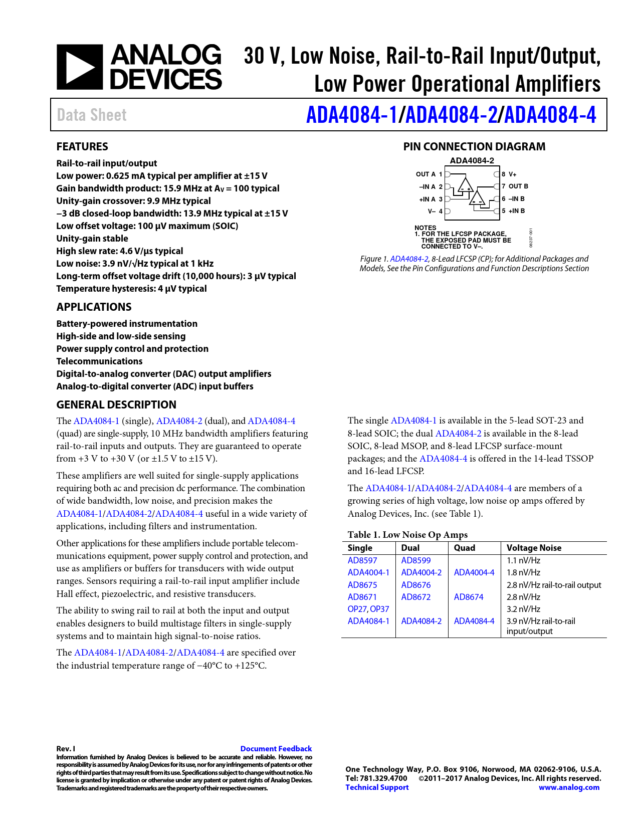 30 V, Low Noise, Rail-to-Rail Input/Output,. Low Power Operational Amplifiers. Data Sheet. ADA4084-1/. ADA4084-2/. ADA4084-4