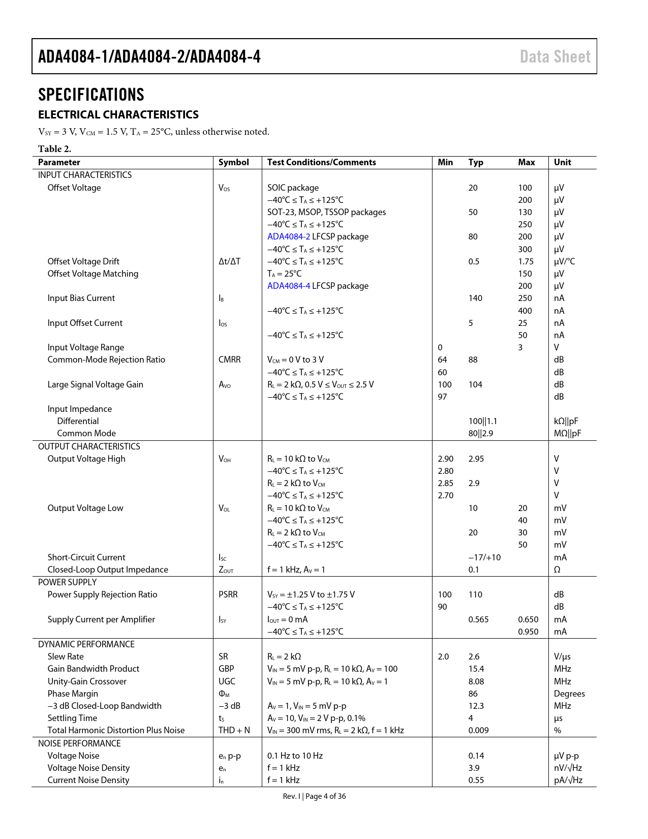ADA4084-1/ADA4084-2/ADA4084-4. Data Sheet. SPECIFICATIONS ELECTRICAL CHARACTERISTICS. Table 2. Parameter. Symbol