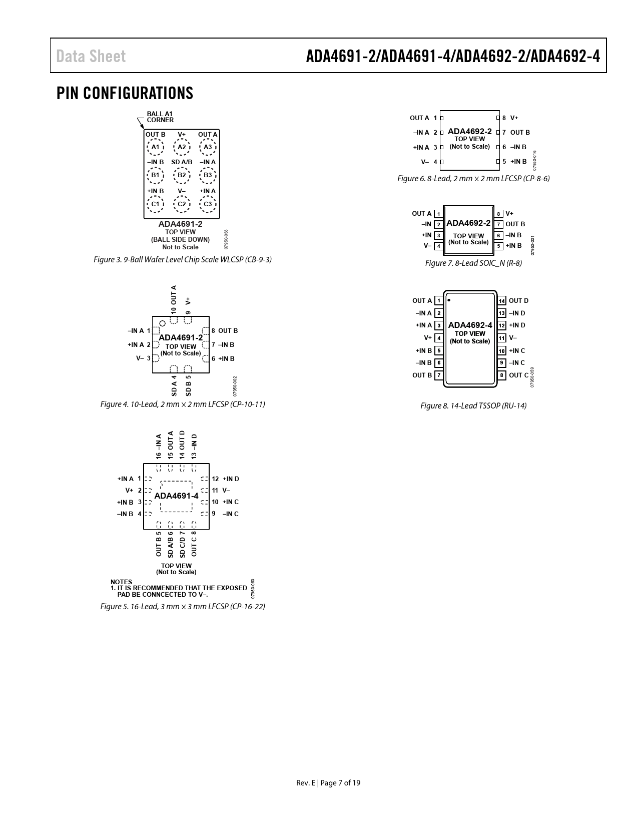 Data SheetADA4691-2/ADA4691-4/ADA4692-2/ADA4692-4PIN CONFIGURATIONSBALL A1CORNEROUT A 18 V+OUT BV+OUT A–IN A 2ADA4692-27 OUT BTOP VIEWA1A2A3+IN A 3(Not to Scale)6 –IN B 16 -0 –IN BSD A/B–IN AV– 45 +IN B 950 07 B1B2B3 Figure 6. 8-Lead, 2 mm × 2 mm LFCSP (CP-8-6) +IN BV–+IN AC1C2C3OUT A 18 V+ADA4691-2–IN 2 ADA4692-2 7 OUT BTOP VIEW 58 -0 +IN 3TOP VIEW6 –IN B(BALL SIDE DOWN) 50 (Not to Scale) 001 Not to Scale 079 V–5 +IN B4 50- 079 Figure 3. 9-Ball Wafer Level Chip Scale WLCSP (CB-9-3) Figure 7. 8-Lead SOIC_N (R-8) A TU +OVOUT A 114 OUT D019–IN A 213 –IN D+IN A 3ADA4692-4 12 +IN D–IN A 18 OUT BADA4691-2TOP VIV EI WEV+ 411 V–(Not(Ntot ScS ac le)+IN A 27 –IN BTOP VIEW(Not to Scale)+IN B 510 +IN CV– 36 +IN B–IN B 69–IN C 9 05 45 2 OUT B 78OUT C 00 AB 950- 0- 07 DD 95 SS 07 Figure 4. 10-Lead, 2 mm × 2 mm LFCSP (CP-10-11) Figure 8. 14-Lead TSSOP (RU-14) AADTTDNIUUN–OOI–61514131+IN A 112 +IN DV+ 211 V–ADA4691-4+IN B 310 +IN C–IN B 49–IN C5678BB/D/CTACTUDUODSSOTOP VIEW(Not to Scale) 0 NOTES 06 0- 1. IT IS RECOMMENDED THAT THE EXPOSED 95 PAD BE CONNCECTED TO V–. 07 Figure 5. 16-Lead, 3 mm × 3 mm LFCSP (CP-16-22) Rev. E | Page 7 of 19 Document Outline Features Applications General Description Revision History Specifications Electrical Characteristics—2.7 V Operation Electrical Characteristics—5 V Operation Absolute Maximum Ratings Thermal Resistance ESD Caution Pin Configurations Typical Performance Characteristics Shutdown Operation Input Pin Characteristics Input Threshold Outline Dimensions Ordering Guide