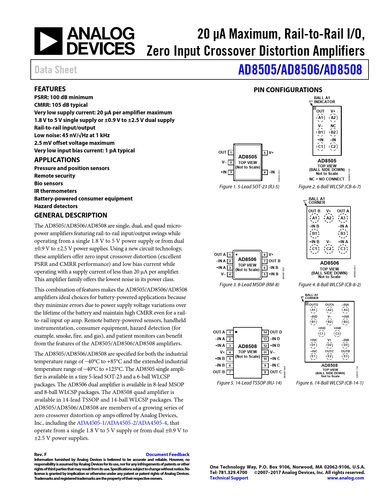 20 μA Maximum, Rail-to-Rail I/O,. Zero Input Crossover Distortion Amplifiers. Data Sheet. AD8505/. AD8506/. AD8508. FEATURES