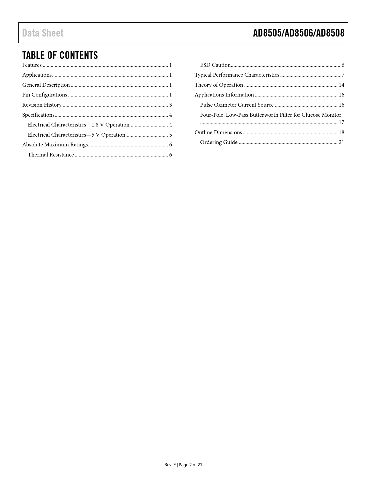link to page 1 link to page 1 link to page 1 link to page 1 link to page 3 link to page 4 link to page 4 link to page 5 link to page 6 link to page 6 link to page 6 link to page 7 link to page 14 link to page 16 link to page 16 link to page 17 link to page 17 link to page 18 link to page 21 Data SheetAD8505/AD8506/AD8508TABLE OF CONTENTS Features .. 1 ESD Caution...6 Applications ... 1 Typical Performance Characteristics ..7 General Description ... 1 Theory of Operation .. 14 Pin Configurations ... 1 Applications Information .. 16 Revision History ... 3 Pulse Oximeter Current Source ... 16 Specifications ... 4 Four-Pole, Low-Pass Butterworth Filter for Glucose Monitor Electrical Characteristics—1.8 V Operation .. 4 ... 17 Electrical Characteristics—5 V Operation.. 5 Outline Dimensions ... 18 Absolute Maximum Ratings .. 6 Ordering Guide .. 21 Thermal Resistance .. 6 Rev. F | Page 2 of 21 Document Outline Features Applications General Description Pin Configurations Revision History Specifications Electrical Characteristics—1.8 V Operation Electrical Characteristics—5 V Operation Absolute Maximum Ratings Thermal Resistance ESD Caution Typical Performance Characteristics Theory of Operation Applications Information Pulse Oximeter Current Source Four-Pole, Low-Pass Butterworth Filter for Glucose Monitor Outline Dimensions Ordering Guide