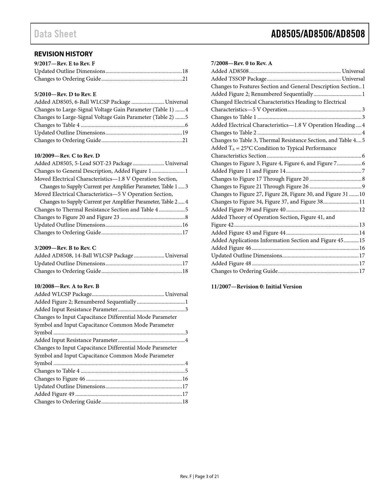 | Páginas / Página | 21 / 3 — Data Sheet. AD8505/AD8506/AD8508. REVISION HISTORY. 9/2017—Rev. E to Rev. … |