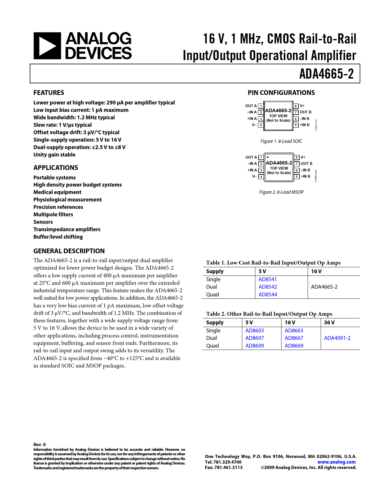 16 V, 1 MHz, CMOS Rail-to-Rail. Input/Output Operational Amplifier. ADA4665-2. FEATURES. PIN CONFIGURATIONS