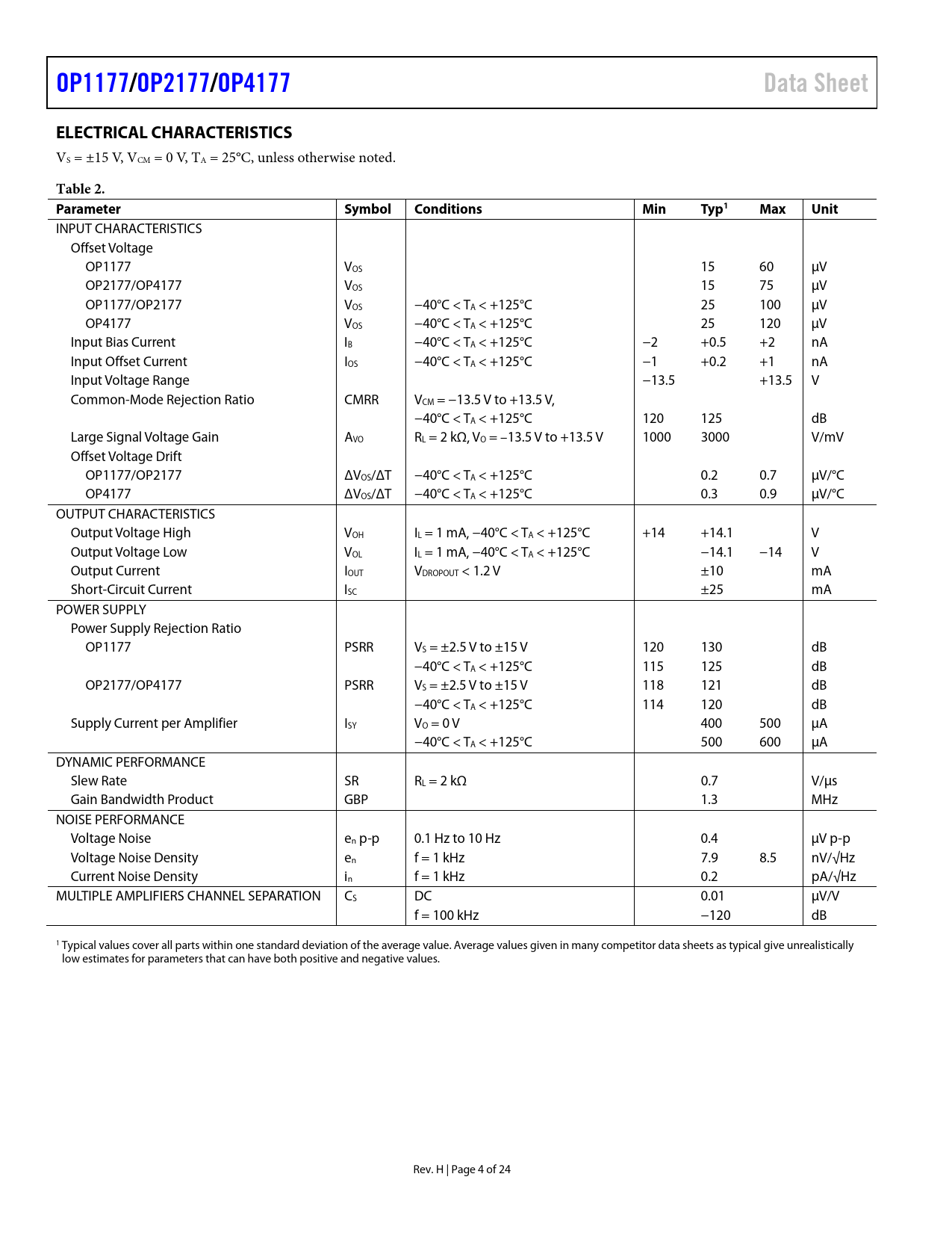 OP1177/ OP2177 /OP4177 Data Sheet ELECTRICAL CHARACTERISTICS Table 2 Parameter Symbol Conditions Min Typ1 Max Unit