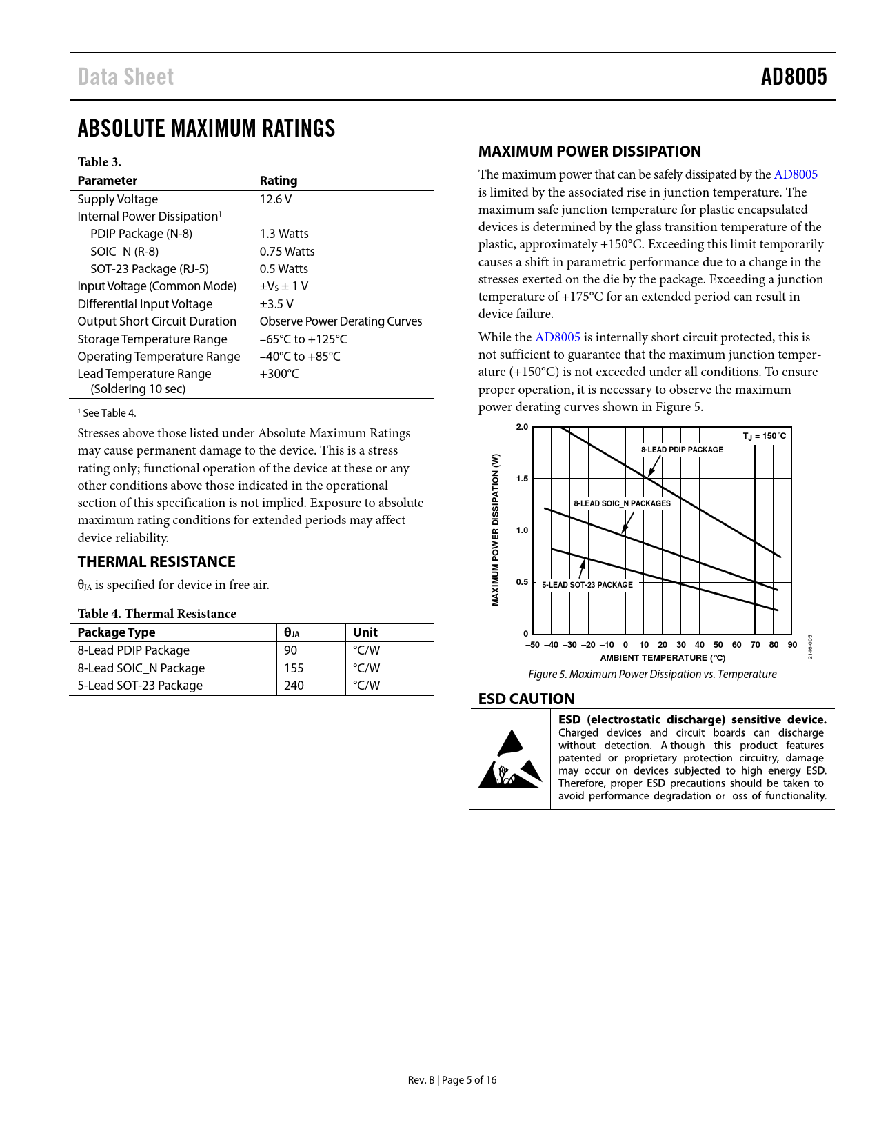 Páginas / Página16 / 5 — Data Sheet. AD8005. ABSOLUTE MAXIMUM RATINGS. MAXIMUM POWER DISSIPATION. …