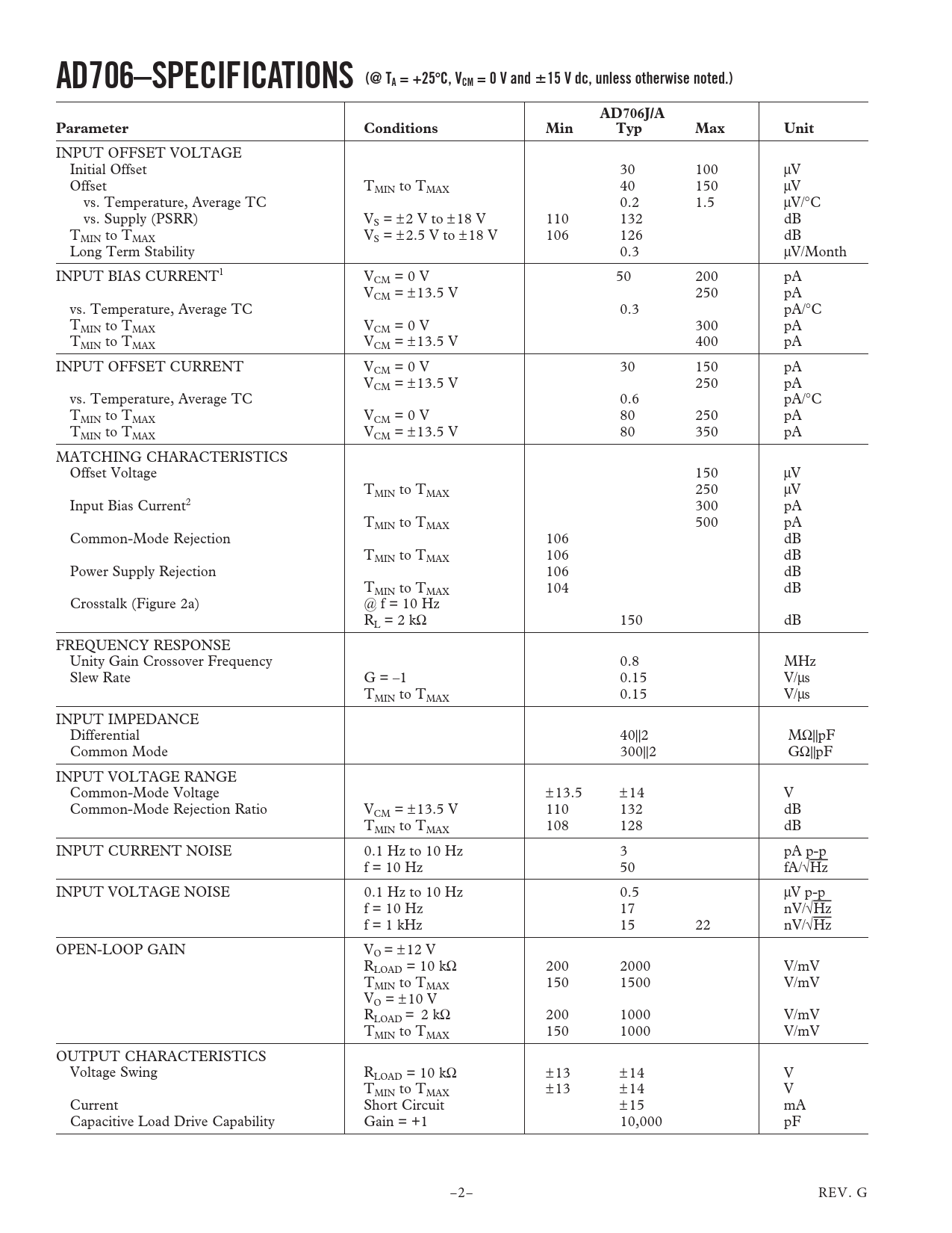 link to page 3 link to page 3 link to page 6 AD706–SPECIFICATIONS (@ TA = +25C, VCM = 0 V and15 V dc, unless otherwise noted.)AD706J/AParameterConditionsMinTypMaxUnit INPUT OFFSET VOLTAGE Initial Offset 30 100 µV Offset TMIN to TMAX 40 150 µV vs. Temperature, Average TC 0.2 1.5 µV/°C vs. Supply (PSRR) VS = ± 2 V to ± 18 V 110 132 dB TMIN to TMAX VS = ± 2.5 V to ± 18 V 106 126 dB Long Term Stability 0.3 µV/Month INPUT BIAS CURRENT1 VCM = 0 V 50 200 pA VCM = ± 13.5 V 250 pA vs. Temperature, Average TC 0.3 pA/°C TMIN to TMAX VCM = 0 V 300 pA TMIN to TMAX VCM = ± 13.5 V 400 pA INPUT OFFSET CURRENT VCM = 0 V 30 150 pA VCM = ± 13.5 V 250 pA vs. Temperature, Average TC 0.6 pA/°C TMIN to TMAX VCM = 0 V 80 250 pA TMIN to TMAX VCM = ± 13.5 V 80 350 pA MATCHING CHARACTERISTICS Offset Voltage 150 µV TMIN to TMAX 250 µV Input Bias Current2 300 pA TMIN to TMAX 500 pA Common-Mode Rejection 106 dB TMIN to TMAX 106 dB Power Supply Rejection 106 dB TMIN to TMAX 104 dB Crosstalk (Figure 2a) @ f = 10 Hz RL = 2 kΩ 150 dB FREQUENCY RESPONSE Unity Gain Crossover Frequency 0.8 MHz Slew Rate G = –1 0.15 V/µs TMIN to TMAX 0.15 V/µs INPUT IMPEDANCE Differential 40||2 MΩ||pF Common Mode 300||2 GΩ||pF INPUT VOLTAGE RANGE Common-Mode Voltage ±13.5 ± 14 V Common-Mode Rejection Ratio VCM = ± 13.5 V 110 132 dB TMIN to TMAX 108 128 dB INPUT CURRENT NOISE 0.1 Hz to 10 Hz 3 pA p-p f = 10 Hz 50 fA/√Hz INPUT VOLTAGE NOISE 0.1 Hz to 10 Hz 0.5 µV p-p f = 10 Hz 17 nV/√Hz f = 1 kHz 15 22 nV/√Hz OPEN-LOOP GAIN VO = ± 12 V RLOAD = 10 kΩ 200 2000 V/mV TMIN to TMAX 150 1500 V/mV VO = ± 10 V RLOAD = 2 kΩ 200 1000 V/mV TMIN to TMAX 150 1000 V/mV OUTPUT CHARACTERISTICS Voltage Swing RLOAD = 10 kΩ ±13 ± 14 V TMIN to TMAX ±13 ± 14 V Current Short Circuit ± 15 mA Capacitive Load Drive Capability Gain = +1 10,000 pF –2– REV. G Document Outline FEATURES APPLICATIONS CONNECTION DIAGRAM GENERAL DESCRIPTION PRODUCT HIGHLIGHTS SPECIFICATIONS ABSOLUTE MAXIMUM RATINGS METALIZATION PHOTOGRAPH TYPICAL PERFORMANCE CHARACTERISTICS 1 HZ, 4-POLE, ACTIVE FILTER OUTLINE DIMENSIONS ORDERING GUIDE REVISION HISTORY