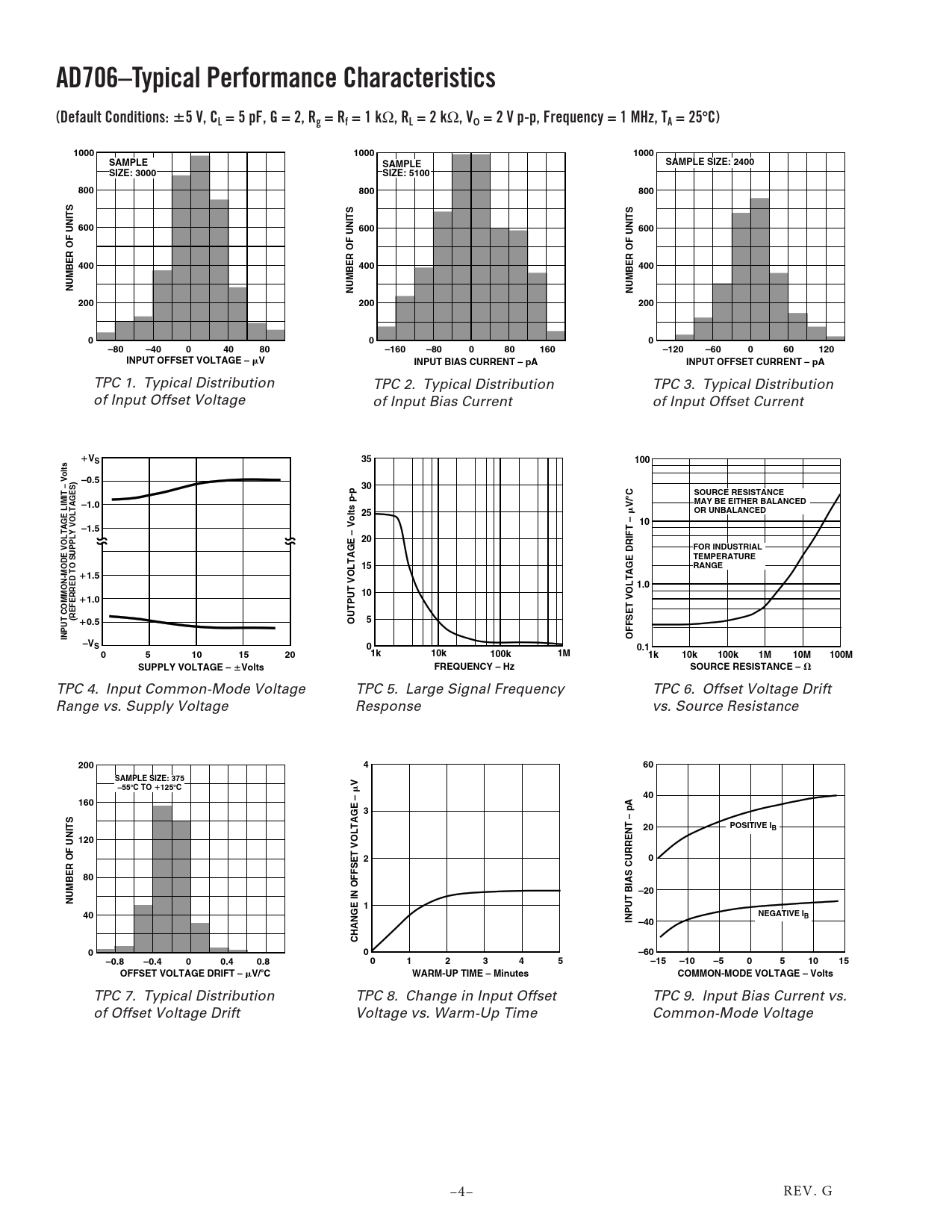 , VO = 2 V p-p, Frequency = 1 MHz, TA = 25 C) 1000 1000 1000 SAMPLE SAMPLE SAMPLE SIZE: 2400 SIZE: 3000 SIZE: 5100 800 800 800 600 600 600 400 400 400 NUMBER OF UNITS NUMBER OF UNITS NUMBER OF UNITS 200 200 200 0 0 0 –80 –40 0 40 80 –160 –80 0 80 160 –120 –60 0 60 120 INPUT OFFSET VOLTAGE – V INPUT BIAS CURRENT – pA INPUT OFFSET CURRENT – pA