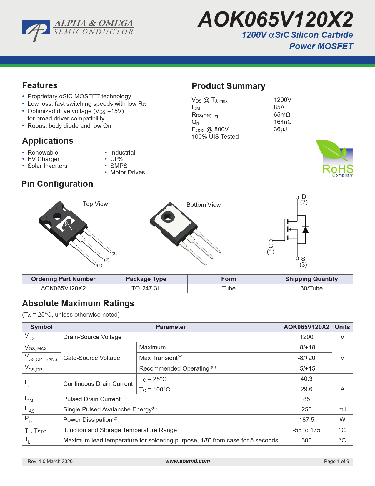 ALPHA & OMEGA. AOK065V120X2. 1200V. SiC Silicon Carbide. Power MOSFET. Features. Product Summary. Applications. Pin Configuration