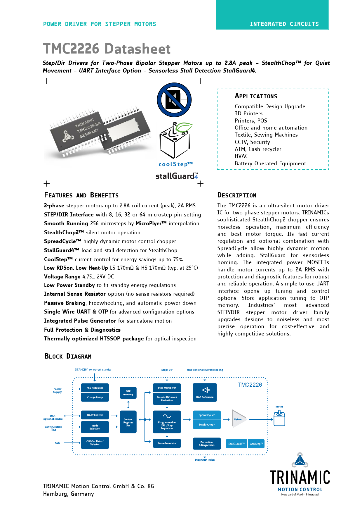 POWER DRIVER FOR STEPPER MOTORSINTEGRATED CIRCUITSTMC2226 DatasheetStep/Dir Drivers for Two-Phase Bipolar Stepper Motors up to 2.8A peak – StealthChop™ forQuietMovement – UART Interface Option – Sensorless Stall Detection StallGuard4.APPLICATIONS Compatible Design Upgrade 3D Printers Printers, POS Office and home automation Textile, Sewing Machines CCTV, Security ATM, Cash recycler HVAC Battery Operated Equipment 4FEATURES AND BENEFITSDESCRIPTION2-phase stepper motors up to 2.8A coil current (peak), 2A RMS The TMC2226 is an ultra-silent motor driver STEP/DIR Interface with 8, 16, 32 or 64 microstep pin setting IC for two phase stepper motors. TRINAMICs sophisticated StealthChop2 chopper ensures Smooth Running 256 microsteps by MicroPlyer™ interpolation noiseless operation, maximum efficiency StealthChop2™ silent motor operation and best motor torque. Its fast current SpreadCycle™ highly dynamic motor control chopper regulation and optional combination with StallGuard4™ load and stall detection for StealthChop SpreadCycle allow highly dynamic motion while adding. StallGuard for sensorless CoolStep™ current control for energy savings up to 75% homing. The integrated power MOSFETs Low RDSon, Low Heat-Up LS 170mΩ & HS 170mΩ (typ. at 25°C) handle motor currents up to 2A RMS with Voltage Range 4.75… 29V DC protection and diagnostic features for robust and reliable operation. A simple to use UART Low Power Standby to fit standby energy regulations Internal Sense Resistor option interface opens up tuning and control (no sense resistors required) options. Store application tuning to OTP Passive Braking , Freewheeling, and automatic power down memory. Industries’ most advanced Single Wire UART & OTP for advanced configuration options STEP/DIR stepper motor driver family Integrated Pulse Generator for standalone motion upgrades designs to noiseless and most precise operation for cost-effective and Full Protection & Diagnostics highly competitive solutions. Thermally optimized HTSSOP package for optical inspection BLOCK DIAGRAM TRINAMIC Motion Control GmbH & Co. KG Hamburg, Germany