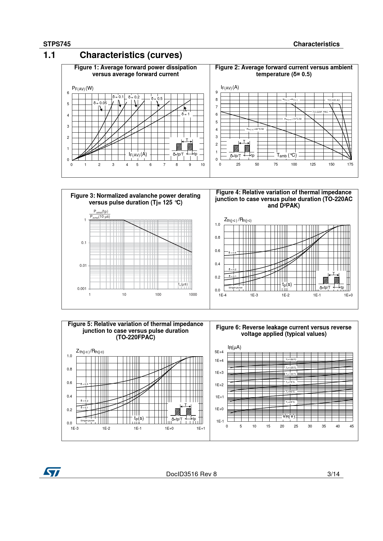 I ( R µA) Z th(j-c )/Rth(j-c) 5E+4 1.0 1E+4 Tj=150°C Tj=125°C 0.8 1E+3 Tj=100°C 0.6 Tj=75°C δ = 0.5 1E+2 Tj=50°C 0.4 1E+1 δ = 0.2 Tj=25°C T δ = 0.1 0.2 1E+0 t V ( R V) p(s) Single pulse δ=tp/T tp 1E-1 0.0 0 5 10 15 20 25 30 35 40 45 1E-3 1E-2 1E-1 1E+0 1E+1 DocID3516 Rev 8 3/14