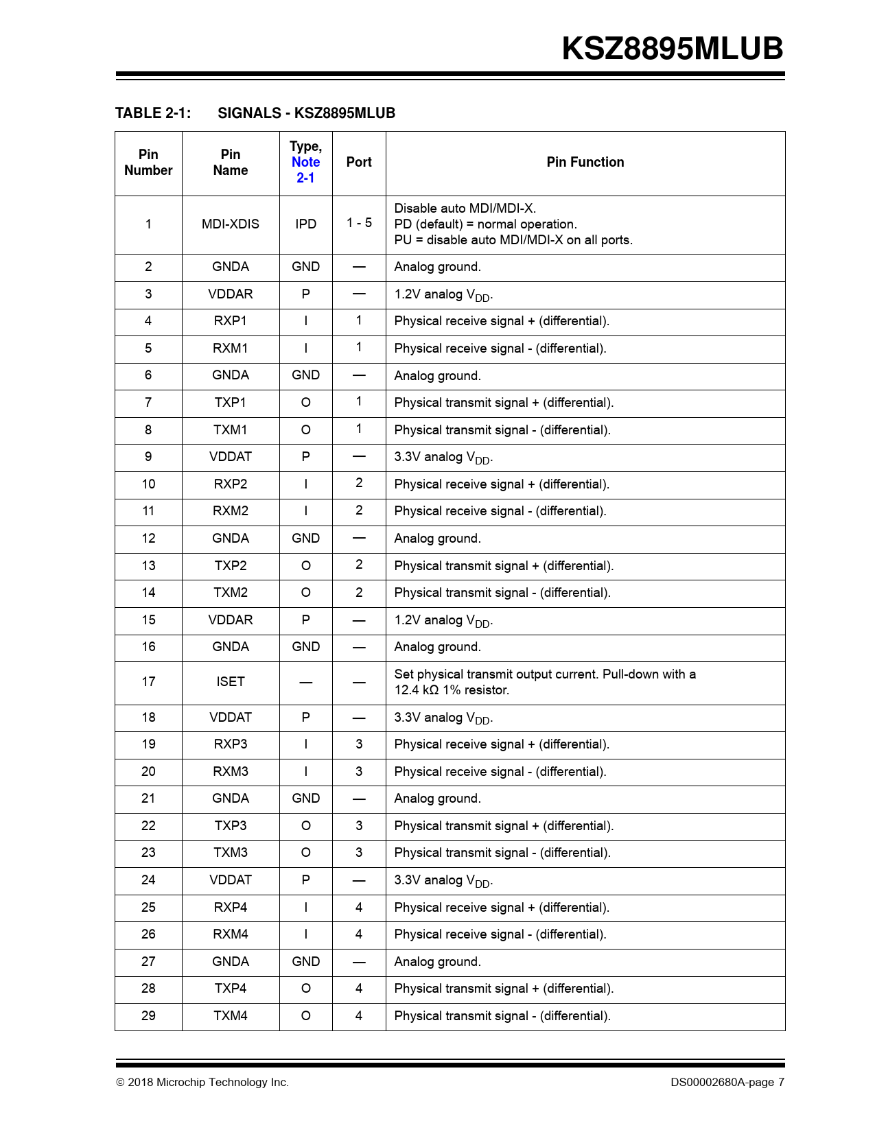 KSZ8895MLUB TABLE 2-1: SIGNALS - KSZ8895MLUB Type, Pin Note Port Pin Function Number Name 2-1