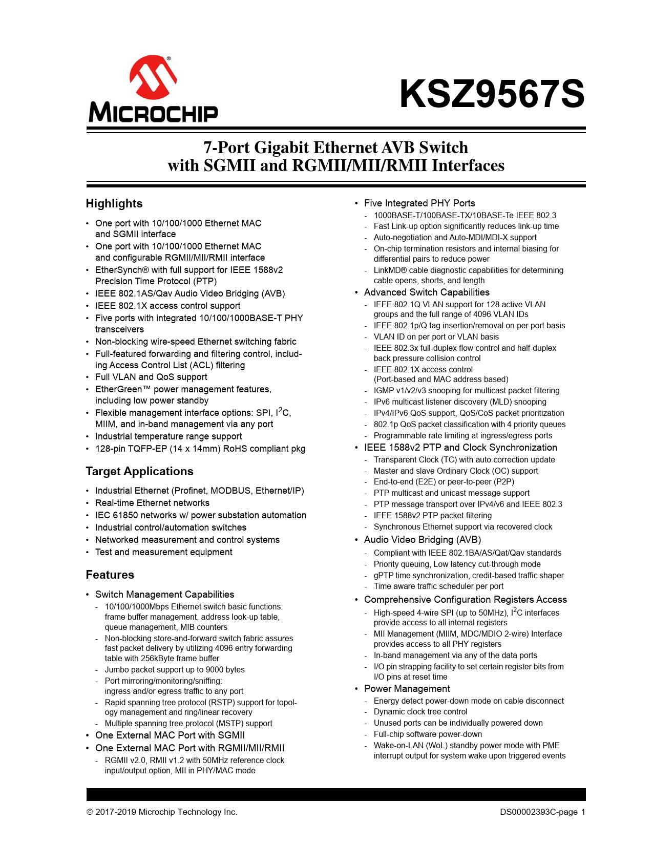 KSZ9567S 7-Port Gigabit Ethernet AVB Switch with SGMII and RGMII/MII/RMII Interfaces Highlights