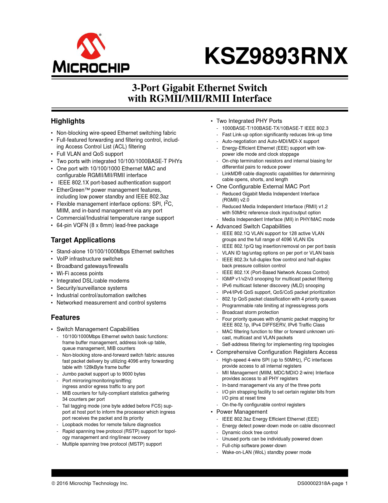 KSZ9893RNX. 3-Port Gigabit Ethernet Switch. with RGMII/MII/RMII Interface. Highlights. Target Applications. Features