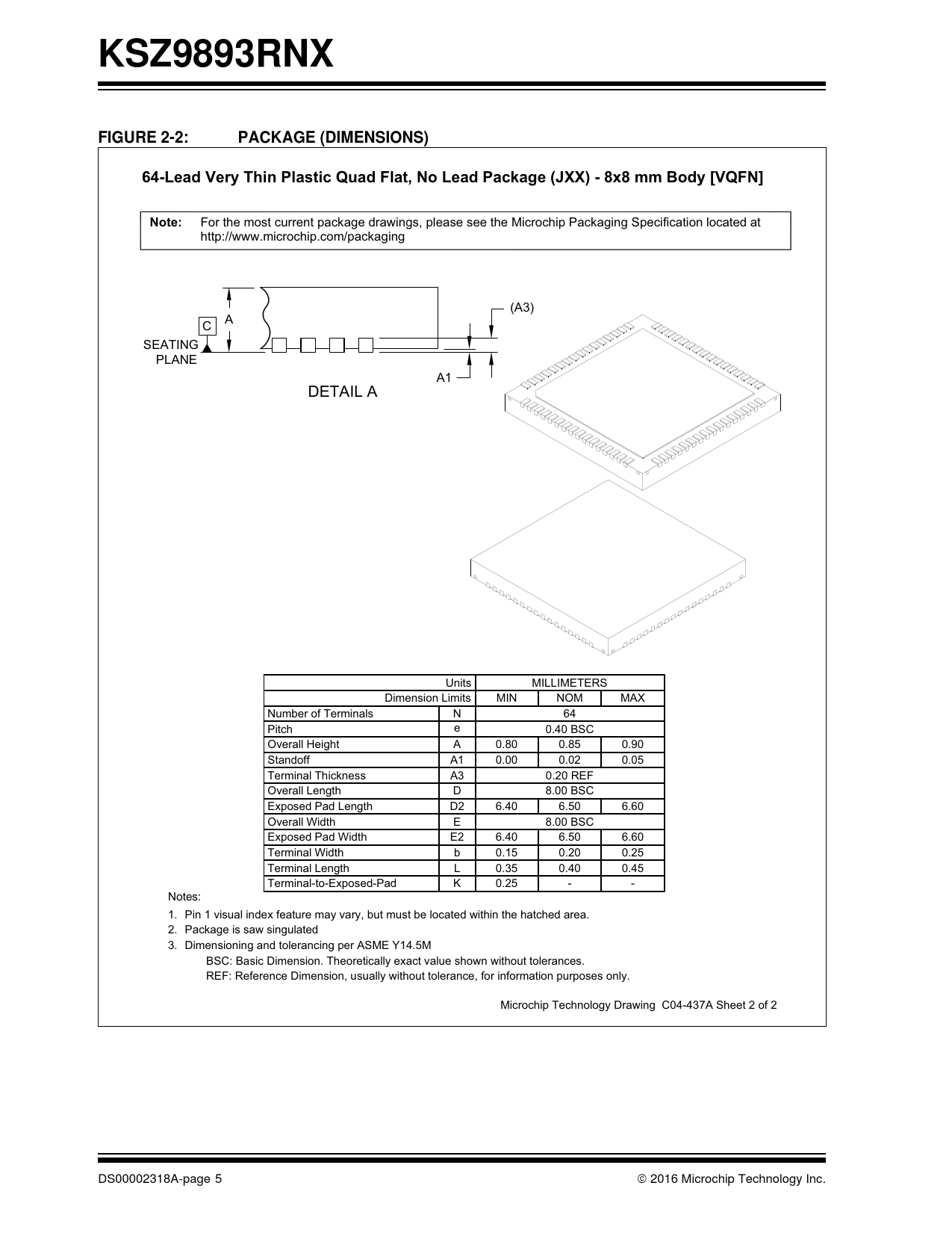 For the most current package drawings, please see the Microchip Packaging Specification located at http://www.microchip.com/packaging (A3) A C SEATING PLANE A1 DETAIL A Units MILLIMETERS Dimension Limits MIN NOM MAX Number of Terminals N 64 Pitch e 0.40 BSC Overall Height A 0.80 0.85 0.90 Standoff A1 0.00 0.02 0.05 Terminal Thickness A3 0.20 REF Overall Length D 8.00 BSC Exposed Pad Length D2 6.40 6.50 6.60 Overall Width E 8.00 BSC Exposed Pad Width E2 6.40 6.50 6.60 Terminal Width b 0.15 0.20 0.25 Terminal Length L 0.35 0.40 0.45 Terminal-to-Exposed-Pad K 0.25 - - Notes: 1. Pin 1 visual index feature may vary, but must be located within the hatched area. 2. Package is saw singulated 3. Dimensioning and tolerancing per ASME Y14.5M BSC: Basic Dimension. Theoretically exact value shown without tolerances. REF: Reference Dimension, usually without tolerance, for information purposes only. Microchip Technology Drawing C04-437A Sheet 2 of 2 DS00002318A-page 5  2016 Microchip Technology Inc. Document Outline Highlights Target Applications Features 1.0 Introduction 1.1 General Description FIGURE 1-1: Internal Block Diagram 2.0 Package Information 2.1 Package Drawings FIGURE 2-1: Package (Drawing) FIGURE 2-2: Package (Dimensions) FIGURE 2-3: Package (Land Pattern) Appendix A: PRODUCT BRIEF Revision History The Microchip Web Site Product Identification System Worldwide Sales and Service