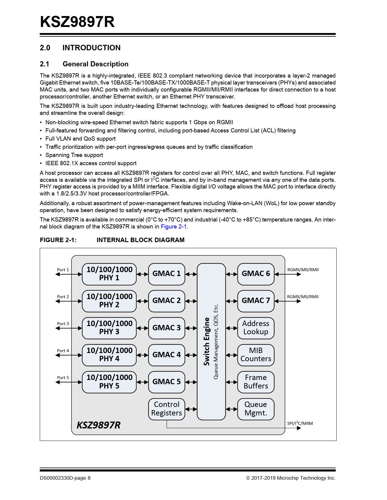link to page 8 KSZ9897R2.0INTRODUCTION2.1General Description The KSZ9897R is a highly-integrated, IEEE 802.3 compliant networking device that incorporates a layer-2 managed Gigabit Ethernet switch, five 10BASE-Te/100BASE-TX/1000BASE-T physical layer transceivers (PHYs) and associated MAC units, and two MAC ports with individually configurable RGMII/MII/RMII interfaces for direct connection to a host processor/controller, another Ethernet switch, or an Ethernet PHY transceiver. The KSZ9897R is built upon industry-leading Ethernet technology, with features designed to offload host processing and streamline the overall design: • Non-blocking wire-speed Ethernet switch fabric supports 1 Gbps on RGMII • Full-featured forwarding and filtering control, including port-based Access Control List (ACL) filtering • Full VLAN and QoS support • Traffic prioritization with per-port ingress/egress queues and by traffic classification • Spanning Tree support • IEEE 802.1X access control support A host processor can access all KSZ9897R registers for control over all PHY, MAC, and switch functions. Full register access is available via the integrated SPI or I2C interfaces, and by in-band management via any one of the data ports. PHY register access is provided by a MIIM interface. Flexible digital I/O voltage allows the MAC port to interface directly with a 1.8/2.5/3.3V host processor/controller/FPGA. Additionally, a robust assortment of power-management features including Wake-on-LAN (WoL) for low power standby operation, have been designed to satisfy energy-efficient system requirements. The KSZ9897R is available in commercial (0°C to +70°C) and industrial (-40°C to +85°C) temperature ranges. An inter- nal block diagram of the KSZ9897R is shown in Figure 2-1. FIGURE 2-1:INTERNAL BLOCK DIAGRAM Port 1 10/100/1000 RGMII/MII/RMII PHY 1GMAC 1GMAC 6 Port 2 10/100/1000GMAC 2GMAC 7 RGMII/MII/RMII PHY 2 . e S, Etc Port 3 10/100/1000 Address , QO PHY 3GMAC 3gin Lookup En ment ge Port 4 10/100/1000itch MIB PHY 4GMAC 4 ana Counters Sw M e u e Port 5 10/100/1000GMAC 5 Qu Frame PHY 5 Buffers Control Queue Registers Mgmt. KSZ9897R SPI/I2C/MIIM DS00002330D-page 8 2017-2019 Microchip Technology Inc. Document Outline 1.0 Preface 1.1 Glossary of Terms TABLE 1-1: General Terms 1.2 Buffer Types TABLE 1-2: Buffer Types 1.3 Register Nomenclature TABLE 1-3: Register Nomenclature 1.4 References 2.0 Introduction 2.1 General Description FIGURE 2-1: Internal Block Diagram 3.0 Pin Descriptions and Configuration 3.1 Pin Assignments FIGURE 3-1: Pin Assignments (Top View) TABLE 3-1: Pin Assignments 3.2 Pin Descriptions TABLE 3-2: Pin Descriptions 3.2.1 Configuration Straps TABLE 3-3: Configuration Strap Descriptions 4.0 Functional Description 4.1 Physical Layer Transceiver (PHY) 4.1.1 1000BASE-T Transceiver 4.1.2 100BASE-TX Transceiver 4.1.3 10BASE-Te Transceiver 4.1.4 Auto MDI/MDI-X TABLE 4-1: MDI/MDI-X Pin Definitions 4.1.5 Pair-Swap, Alignment, and Polarity Check 4.1.6 Wave Shaping, Slew-Rate Control, and Partial Response 4.1.7 Auto-Negotiation FIGURE 4-1: Auto-Negotiation and Parallel Operation 4.1.8 Fast Link-Up 4.1.9 LinkMD® Cable Diagnostics 4.1.10 Remote PHY Loopback FIGURE 4-2: Remote PHY Loopback 4.2 LEDs 4.2.1 Single-LED Mode TABLE 4-2: Single-LED Mode Pin Definition 4.2.2 Tri-Color Dual-LED Mode TABLE 4-3: Tri-Color Dual-LED Mode Pin Definition 4.3 Media Access Controller (MAC) 4.3.1 MAC Operation 4.3.2 Inter-Packet Gap (IPG) 4.3.3 Back-Off Algorithm 4.3.4 Late Collision 4.3.5 Legal Packet Size 4.3.6 Flow Control 4.3.7 Half-Duplex Back Pressure 4.3.8 Flow Control and Back Pressure Registers TABLE 4-4: Flow Control and back Pressure Registers 4.3.9 Broadcast Storm Protection 4.3.10 Self-Address Filtering 4.4 Switch 4.4.1 Switching Engine 4.4.2 Address Lookup TABLE 4-5: Address Lookup Table Hashing Options TABLE 4-6: Reserved Multicast Address Table FIGURE 4-3: Packet Forwarding Process Flowchart TABLE 4-7: Lookup Engine Registers 4.4.3 IEEE 802.1Q VLAN TABLE 4-8: VLAN Forwarding TABLE 4-9: Hashed(DA) + FID Lookup in VLAN Mode TABLE 4-10: Hashed(SA) + FID Lookup in VLAN Mode TABLE 4-11: VLAN Registers 4.4.4 Quality-of-Service (QoS) Priority Support FIGURE 4-4: 802.p Priority Field Format 4.4.5 Traffic Conditioning & Policing 4.4.6 Spanning Tree Support TABLE 4-12: Spanning Tree States 4.4.7 Rapid Spanning Tree Support 4.4.8 Multiple Spanning Tree Support 4.4.9 Tail Tagging Mode FIGURE 4-5: Tail Tag Frame Format TABLE 4-13: Receive Tail Tag Format (from Switch to Host) TABLE 4-14: Transmit Tail Tag Format (from Host to Switch) 4.4.10 IGMP Support 4.4.11 IPv6 MLD Snooping 4.4.12 Port Mirroring 4.4.13 Scheduling and Rate Limiting 4.4.14 Ingress MAC Address Filtering Function 4.4.15 802.1X Access Control 4.4.16 Access Control List (ACL) Filtering TABLE 4-15: ACL Processing Entry Parameters FIGURE 4-6: ACL Structure and Example Rule Values TABLE 4-16: Matching Rule Options TABLE 4-17: ACL Matching Rule Parameters for MD = 01 TABLE 4-18: ACL Matching Rule Parameters for MD = 10 TABLE 4-19: ACL Matching Rule Parameters for MD = 11 TABLE 4-20: ACL Action Rule Parameters for Non-count Modes (MD ≠ 01 or ENB ≠ 00) TABLE 4-21: ACL Action Rule Parameters for count Mode (MD = 01 or ENB = 00) FIGURE 4-7: ACL Table Format TABLE 4-22: ACL Registers 4.5 NAND Tree Support TABLE 4-23: NAND Tree Test Pin Order 4.6 Clocking 4.6.1 Primary Clock 4.6.2 MAC Interface Clocks 4.6.3 Serial Management Interface Clock 4.6.4 CLKO_25_125 4.7 Power FIGURE 4-8: Power Connection Diagram 4.8 Power Management TABLE 4-24: MDI/MDI-X Pin Definitions 4.8.1 Normal Operation Mode 4.8.2 Energy-Detect Mode 4.8.3 Global Soft Power-Down Mode 4.8.4 Port-Based Power Down 4.8.5 Wake on LAN (WoL) 4.9 Management Interface 4.9.1 SPI Slave Bus TABLE 4-25: Register Access using the SPI Interface FIGURE 4-9: SPI Register Read Operation FIGURE 4-10: SPI Register Write Operation 4.9.2 I2C Bus FIGURE 4-11: Single Byte Register Write FIGURE 4-12: Single Byte Regist