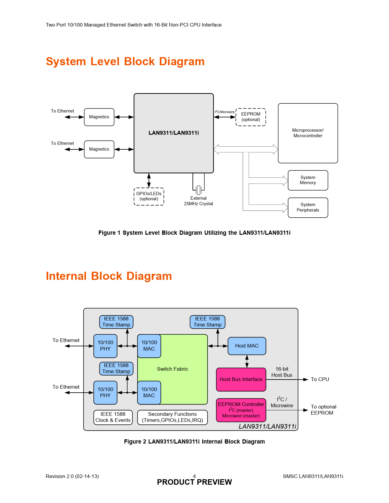 Two Port 10/100 Managed Ethernet Switch with 16-Bit Non-PCI CPU Interface System Level Block Diagram To Ethernet I2C/Microwire Magnetics EEPROM (optional) Microprocessor/ Microcontroller LAN9311/LAN9311i To Ethernet Magnetics System Memory GPIOs/LEDs (optional) External 25MHz Crystal System Peripherals Figure 1 System Level Block Diagram Utilizing the LAN9311/LAN9311i Internal Block Diagram IEEE 1588 Time Stamp To Ethernet 10/100 PHY 10/100 MAC IEEE 1588 Time Stamp To Ethernet IEEE 1588 Time Stamp 10/100 PHY Host MAC Switch Fabric Host Bus Host Bus Interface Interface 10/100 MAC EEPROM Controller IEEE 1588 Clock & Events Secondary Functions (Timers,GPIOs,LEDs,IRQ) I2C (master) Microwire (master) 16-bit Host Bus I2 C / Microwire To CPU To optional EEPROM LAN9311/LAN9311i Figure 2 LAN9311/LAN9311i Internal Block Diagram Revision 2.0 (02-14-13) 4 PRODUCT PREVIEW SMSC LAN9311/LAN9311i