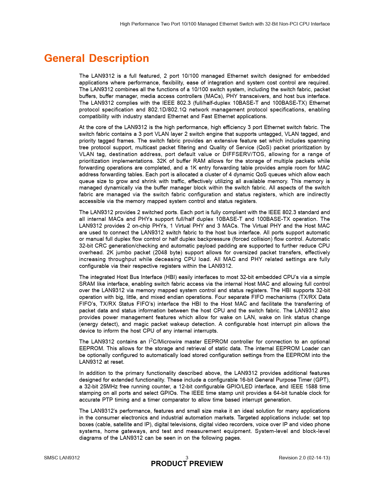 High Performance Two Port 10/100 Managed Ethernet Switch with 32-Bit Non-PCI CPU Interface General Description The LAN9312 is a full featured, 2 port 10/100 managed Ethernet switch designed for embedded applications where performance, flexibility, ease of integration and system cost control are required. The LAN9312 combines all the functions of a 10/100 switch system, including the switch fabric, packet buffers, buffer manager, media access controllers (MACs), PHY transceivers, and host bus interface. The LAN9312 complies with the IEEE 802.3 (full/half-duplex 10BASE-T and 100BASE-TX) Ethernet protocol specification and 802.1D/802.1Q network management protocol specifications, enabling compatibility with industry standard Ethernet and Fast Ethernet applications. At the core of the LAN9312 is the high performance, high efficiency 3 port Ethernet switch fabric. The switch fabric contains a 3 port VLAN layer 2 switch engine that supports untagged, VLAN tagged, and priority tagged frames. The switch fabric provides an extensive feature set which includes spanning tree protocol support, multicast packet filtering and Quality of Service (QoS) packet prioritization by VLAN tag, destination address, port default value or DIFFSERV/TOS, allowing for a range of prioritization implementations. 32K of buffer RAM allows for the storage of multiple packets while forwarding operations are completed, and a 1K entry forwarding table provides ample room for MAC address forwarding tables. Each port is allocated a cluster of 4 dynamic QoS queues which allow each queue size to grow and shrink with traffic, effectively utilizing all available memory. This memory is managed dynamically via the buffer manager block within the switch fabric. All aspects of the switch fabric are managed via the switch fabric configuration and status registers, which are indirectly accessible via the memory mapped system control and status registers. The LAN9312 provides 2 switched ports. Each port is fully compliant with the IEEE 802.3 standard and all internal MACs and PHYs support full/half duplex 10BASE-T and 100BASE-TX operation. The LAN9312 provides 2 on-chip PHYs, 1 Virtual PHY and 3 MACs. The Virtual PHY and the Host MAC are used to connect the LAN9312 switch fabric to the host bus interface. All ports support automatic or manual full duplex flow control or half duplex backpressure (forced collision) flow control. Automatic 32-bit CRC generation/checking and automatic payload padding are supported to further reduce CPU overhead. 2K jumbo packet (2048 byte) support allows for oversized packet transfers, effectively increasing throughput while deceasing CPU load. All MAC and PHY related settings are fully configurable via their respective registers within the LAN9312. The integrated Host Bus Interface (HBI) easily interfaces to most 32-bit embedded CPU’s via a simple SRAM like interface, enabling switch fabric access via the internal Host MAC and allowing full control over the LAN9312 via memory mapped system control and status registers. The HBI supports 32-bit operation with big, little, and mixed endian operations. Four separate FIFO mechanisms (TX/RX Data FIFO’s, TX/RX Status FIFO’s) interface the HBI to the Host MAC and facilitate the transferring of packet data and status information between the host CPU and the switch fabric. The LAN9312 also provides power management features which allow for wake on LAN, wake on link status change (energy detect), and magic packet wakeup detection. A configurable host interrupt pin allows the device to inform the host CPU of any internal interrupts. The LAN9312 contains an I2C/Microwire master EEPROM controller for connection to an optional EEPROM. This allows for the storage and retrieval of static data. The internal EEPROM Loader can be optionally configured to automatically load stored configuration settings from the EEPROM into the LAN9312 at reset. In addition to the primary functionality described above, the LAN9312 provides additional features designed for extended functionality. These include a configurable 16-bit General Purpose Timer (GPT), a 32-bit 25MHz free running counter, a 12-bit configurable GPIO/LED interface, and IEEE 1588 time stamping on all ports and select GPIOs. The IEEE time stamp unit provides a 64-bit tunable clock for accurate PTP timing and a timer comparator to allow time based interrupt generation. The LAN9312’s performance, features and small size make it an ideal solution for many applications in the consumer electronics and industrial automation markets. Targeted applications include: set top boxes (cable, satellite and IP), digital televisions, digital video recorders, voice over IP and video phone systems, home gateways, and test and measurement equipment. System-level and block-level diagrams of the LAN9312 can be seen in on the following pages. SMSC LAN9312 3 PRODUCT PREVIEW Revision 2.0 (02-14-13)