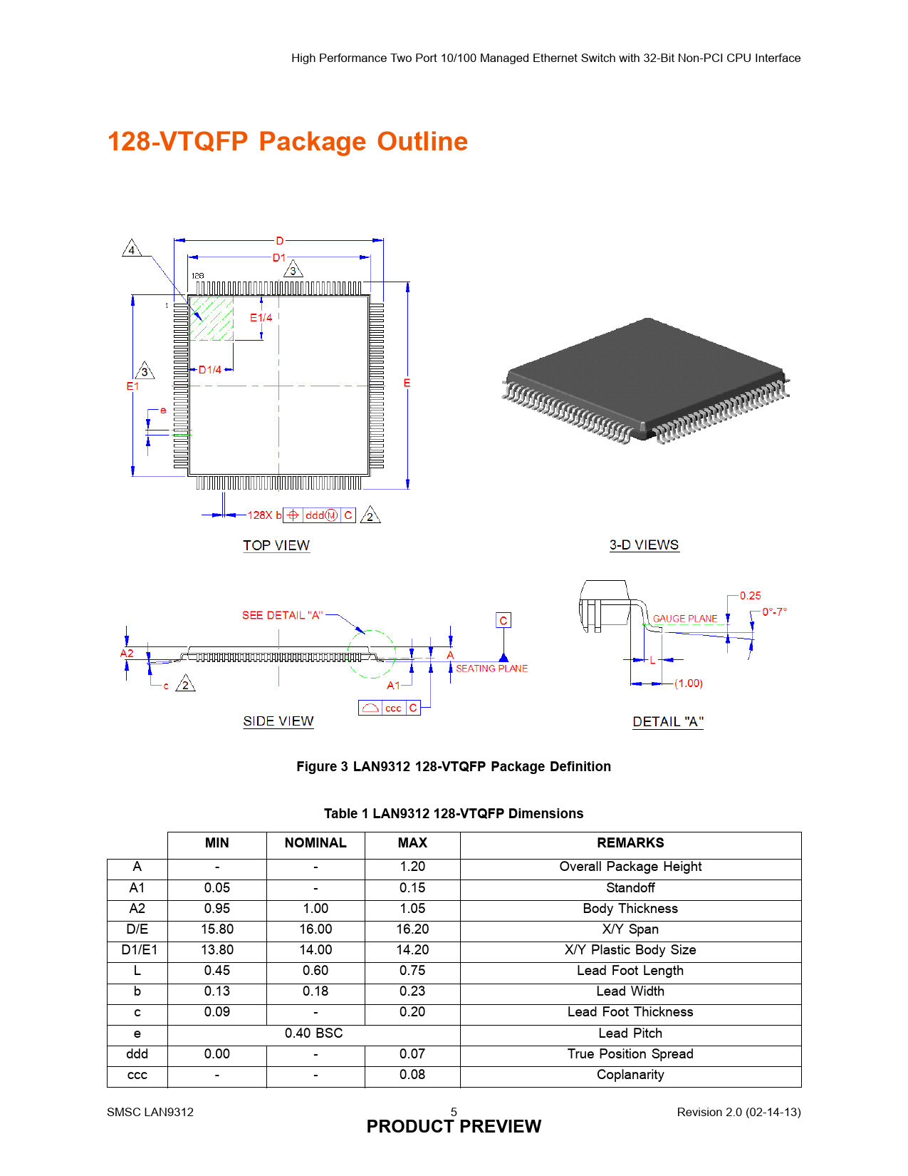 High Performance Two Port 10/100 Managed Ethernet Switch with 32-Bit Non-PCI CPU Interface 128-VTQFP Package Outline Figure 3 LAN9312 128-VTQFP Package Definition
