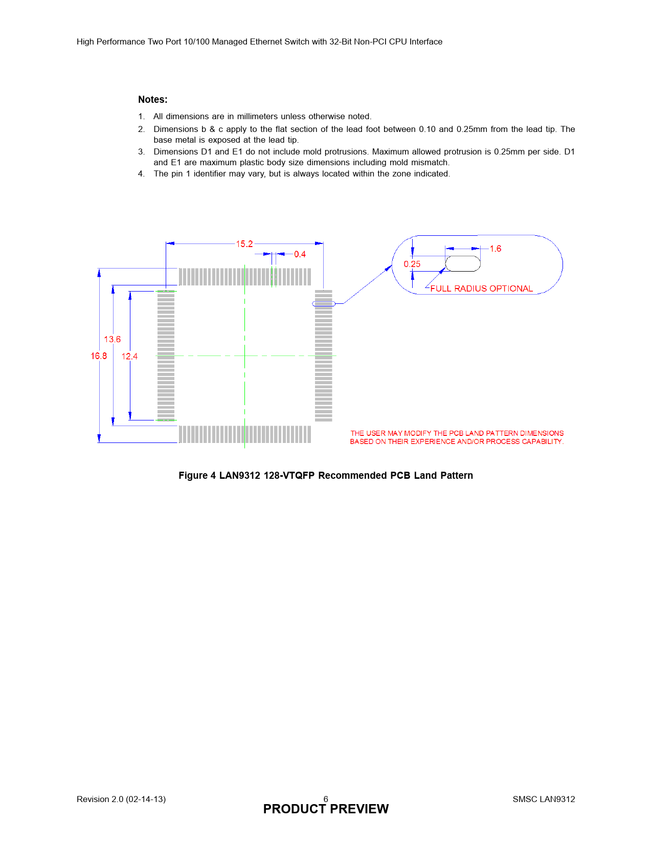 High Performance Two Port 10/100 Managed Ethernet Switch with 32-Bit Non-PCI CPU Interface Notes: 1. All dimensions are in millimeters unless otherwise noted. 2. 3. 4. Dimensions b & c apply to the flat section of the lead foot between 0.10 and 0.25mm from the lead tip. The base metal is exposed at the lead tip. Dimensions D1 and E1 do not include mold protrusions. Maximum allowed protrusion is 0.25mm per side. D1 and E1 are maximum plastic body size dimensions including mold mismatch. The pin 1 identifier may vary, but is always located within the zone indicated. Figure 4 LAN9312 128-VTQFP Recommended PCB Land Pattern Revision 2.0 (02-14-13) 6 PRODUCT PREVIEW SMSC LAN9312
