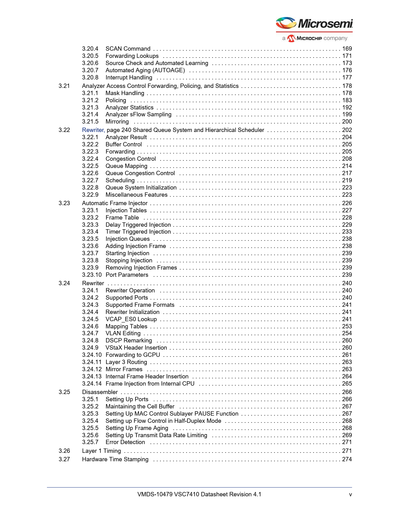 Línea de modelo para esta hoja de datos Versión de texto del documento link to page 186 link to page 188 link to page 190 link to page 193 link to page 194 link to page 195 link to page 195 link to page 200 link to page 209 link to page 216 link to page 217 link to page 219 link to page 221 link to page 222 link to page 222 link to page 225 link to page 231 link to page 234 link to page 236 link to page 240 link to page 240 link to page 243 link to page 244 link to page 245 link to page 246 link to page 250 link to page 255 link to page 255 link to page 256 link to page 256 link to page 256 link to page 256 link to page 257 link to page 257 link to page 257 link to page 258 link to page 258 link to page 258 link to page 270 link to page 271 link to page 277 link to page 277 link to page 278 link to page 280 link to page 280 link to page 281 link to page 282 link to page 283 link to page 283 link to page 284 link to page 284 link to page 285 link to page 285 link to page 286 link to page 288 link to page 288 link to page 291 3.20.4 SCAN Command . 169 3.20.5 Forwarding Lookups . 171 3.20.6 Source Check and Automated Learning . 173 3.20.7 Automated Aging (AUTOAGE) . 176 3.20.8 Interrupt Handling . 177 3.21 Analyzer Access Control Forwarding, Policing, and Statistics . 178 3.21.1 Mask Handling . 178 3.21.2 Policing . 183 3.21.3 Analyzer Statistics . 192 3.21.4 Analyzer sFlow Sampling . 199 3.21.5 Mirroring . 200 3.22 Rewriter, page 240 Shared Queue System and Hierarchical Scheduler . 202 3.22.1 Analyzer Result . 204 3.22.2 Buffer Control . 205 3.22.3 Forwarding . 205 3.22.4 Congestion Control . 208 3.22.5 Queue Mapping . 214 3.22.6 Queue Congestion Control . 217 3.22.7 Scheduling . 219 3.22.8 Queue System Initialization . 223 3.22.9 Miscellaneous Features . 223 3.23 Automatic Frame Injector . 226 3.23.1 Injection Tables . 227 3.23.2 Frame Table . 228 3.23.3 Delay Triggered Injection . 229 3.23.4 Timer Triggered Injection . 233 3.23.5 Injection Queues . 238 3.23.6 Adding Injection Frame . 238 3.23.7 Starting Injection . 239 3.23.8 Stopping Injection . 239 3.23.9 Removing Injection Frames . 239 3.23.10 Port Parameters . 239 3.24 Rewriter . 240 3.24.1 Rewriter Operation . 240 3.24.2 Supported Ports . 240 3.24.3 Supported Frame Formats . 241 3.24.4 Rewriter Initialization . 241 3.24.5 VCAP_ES0 Lookup . 241 3.24.6 Mapping Tables . 253 3.24.7 VLAN Editing . 254 3.24.8 DSCP Remarking . 260 3.24.9 VStaX Header Insertion . 260 3.24.10 Forwarding to GCPU . 261 3.24.11 Layer 3 Routing . 263 3.24.12 Mirror Frames . 263 3.24.13 Internal Frame Header Insertion . 264 3.24.14 Frame Injection from Internal CPU . 265 3.25 Disassembler . 266 3.25.1 Setting Up Ports . 266 3.25.2 Maintaining the Cell Buffer . 267 3.25.3 Setting Up MAC Control Sublayer PAUSE Function . 267 3.25.4 Setting up Flow Control in Half-Duplex Mode . 268 3.25.5 Setting Up Frame Aging . 268 3.25.6 Setting Up Transmit Data Rate Limiting . 269 3.25.7 Error Detection . 271 3.26 Layer 1 Timing . 271 3.27 Hardware Time Stamping . 274 VMDS-10479 VSC7410 Datasheet Revision 4.1 v Document Outline 1 Revision History 1.1 Revision 4.1 1.2 Revision 4.0 2 Product Overview 2.1 General Features 2.1.1 Layer 2 and Layer 3 Forwarding 2.1.2 Timing and Synchronization 2.1.3 Quality of Service (QoS) 2.1.4 Security 2.1.5 Management 2.1.6 Product Parameters 2.2 Applications 2.2.1 Wireless Backhaul 2.2.2 Small Cell Application 3 Functional Descriptions 3.1 Register Notations 3.2 Functional Overview 3.2.1 Frame Arrival in Ports and Port Modules 3.2.2 Basic Classification 3.2.3 Security and Control Protocol Classification 3.2.4 Policing 3.2.5 Layer 2 Forwarding 3.2.6 Layer 3 Forwarding 3.2.7 Shared Queue System and Hierarchical Scheduler 3.2.8 Rewriter and Frame Departure 3.2.9 CPU Port Module 3.2.10 Synchronous Ethernet and Precision Time Protocol (PTP) 3.2.11 CPU Subsystem 3.3 Frame Headers 3.3.1 Internal Frame Header Placement 3.3.2 Internal Frame Header Layout 3.3.3 VStaX Header 3.4 Port Numbering and Mappings 3.4.1 Supported SerDes Interfaces 3.4.2 Dual-Media Mode 3.4.3 Logical Port Numbers 3.5 SERDES1G 3.6 SERDES6G 3.7 Copper Transceivers 3.7.1 Register Access 3.7.2 Cat5 Twisted Pair Media Interface 3.7.3 Wake-On-LAN and SecureOn 3.7.4 Ethernet Inline Powered Devices 3.7.5 IEEE 802.3af PoE Support 3.7.6 ActiPHY™ Power Management 3.7.7 Testing Features 3.7.8 VeriPHY™ Cable Diagnostics 3.8 DEV1G and DEV2G5 Port Modules 3.8.1 MAC 3.8.2 Half-Duplex Mode 3.8.3 Physical Coding Sublayer (PCS) 3.8.4 Port Statistics 3.9 Assembler 3.9.1 Setting Up a Port in the Assembler 3.9.2 Setting Up a Port for Frame Injection 3.9.3 Setting Up MAC Control Sublayer PAUSE Frame Detection 3.9.4 Setting Up PFC 3.9.5 Setting Up Assembler Port Statistics 3.9.6 Setting Up the Loopback Path 3.10 Versatile Content-Aware Processor (VCAP) 3.10.1 Configuring VCAP 3.10.2 Wide VCAP Entries and Actions 3.10.3 Individual VCAPs 3.10.4 VCAP Programming Examples 3.11 Pipeline Points 3.11.1 Pipeline Definitions 3.12 Analyzer 3.12.1 Initializing the Analyzer 3.13 VCAP CLM Keys and Actions 3.13.1 Keys Overview 3.13.2 VCAP CLM X1 Key Details 3.13.3 VCAP CLM X2 Key Details 3.13.4 VCAP CLM X4 Key Details 3.13.5 VCAP CLM X8 Key Details 3.13.6 VCAP CLM X16 Key Details 3.13.7 VCAP CLM Actions 3.14 Analyzer Classifier 3.14.1 Basic Classifier 3.14.2 VCAP CLM Processing 3.14.3 QoS Mapping Table 3.14.4 Analyzer Classifier Diagnostics 3.15 VLAN and MSTP 3.15.1 Private VLAN 3.15.2 VLAN Pseudo Code 3.16 VCAP LPM: Keys and Action 3.16.1 VCAP LPM SGL_IP4 Key Details 3.16.2 VCAP LPM DBL_IP4 Key Details 3.16.3 VCAP LPM SGL_IP6 Key Details 3.16.4 VCAP LPM DBL_IP6 Key Details 3.16.5 VCAP LPM Actions 3.17 IP Processing 3.17.1 IP Source/Destination Guard 3.17.2 IP Routing 3.17.3 Statistics 3.17.4 IGMP/MLD Snooping Switch 3.18 VCAP IS2 Keys and Actions 3.18.1 VCAP IS2 Keys 3.18.2 VCAP IS2 Actions 3.19 Analyzer Access Control Lists 3.19.1 VCAP IS2 3.19.2 Analyzer Access Control List Frame Rewriting 3.20 Analyzer Layer 2