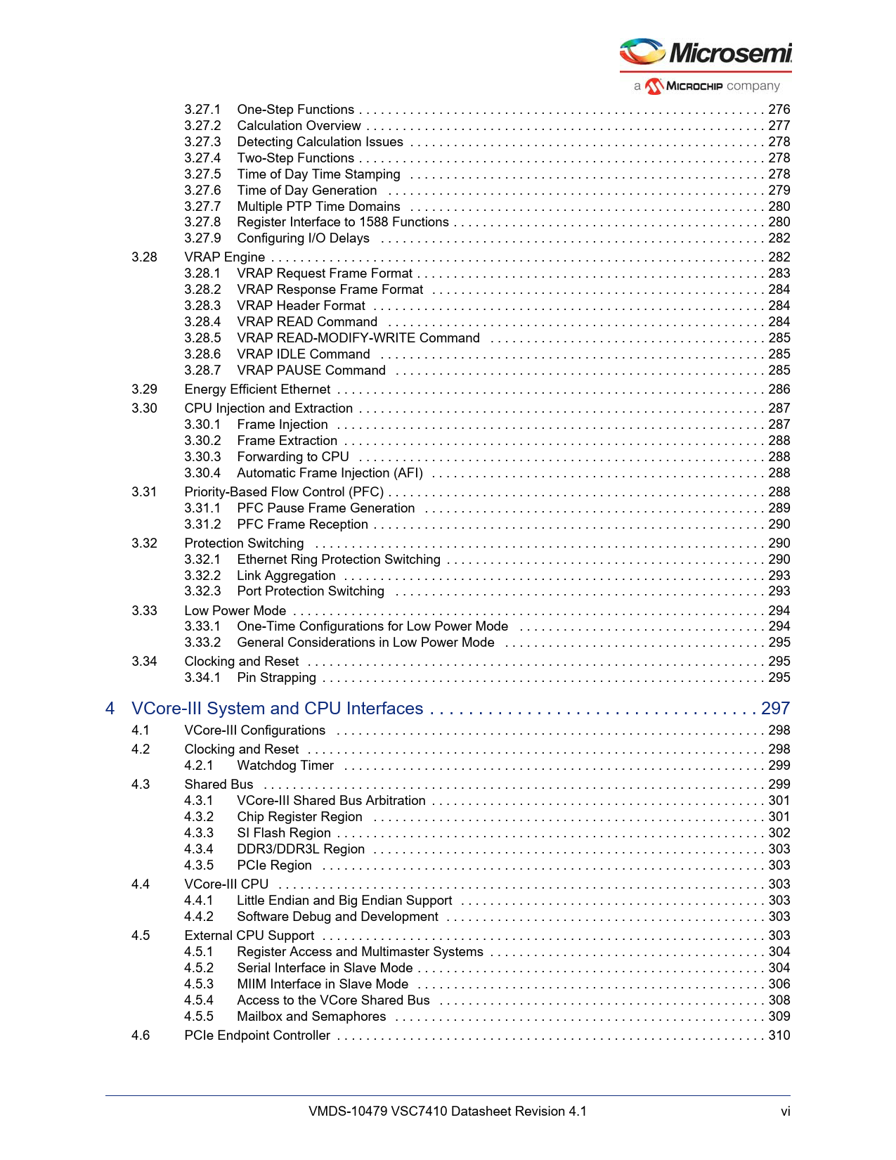link to page 293 link to page 294 link to page 295 link to page 295 link to page 295 link to page 296 link to page 297 link to page 297 link to page 299 link to page 299 link to page 300 link to page 301 link to page 301 link to page 301 link to page 302 link to page 302 link to page 302 link to page 303 link to page 304 link to page 304 link to page 305 link to page 305 link to page 305 link to page 305 link to page 306 link to page 307 link to page 307 link to page 307 link to page 310 link to page 310 link to page 311 link to page 311 link to page 312 link to page 312 link to page 312 link to page 314 link to page 315 link to page 315 link to page 316 link to page 316 link to page 318 link to page 318 link to page 319 link to page 320 link to page 320 link to page 320 link to page 320 link to page 320 link to page 320 link to page 321 link to page 321 link to page 323 link to page 325 link to page 326 link to page 327 3.27.1 One-Step Functions . 276 3.27.2 Calculation Overview . 277 3.27.3 Detecting Calculation Issues . 278 3.27.4 Two-Step Functions . 278 3.27.5 Time of Day Time Stamping . 278 3.27.6 Time of Day Generation . 279 3.27.7 Multiple PTP Time Domains . 280 3.27.8 Register Interface to 1588 Functions . 280 3.27.9 Configuring I/O Delays . 282 3.28 VRAP Engine . 282 3.28.1 VRAP Request Frame Format . 283 3.28.2 VRAP Response Frame Format . 284 3.28.3 VRAP Header Format . 284 3.28.4 VRAP READ Command . 284 3.28.5 VRAP READ-MODIFY-WRITE Command . 285 3.28.6 VRAP IDLE Command . 285 3.28.7 VRAP PAUSE Command . 285 3.29 Energy Efficient Ethernet . 286 3.30 CPU Injection and Extraction . 287 3.30.1 Frame Injection . 287 3.30.2 Frame Extraction . 288 3.30.3 Forwarding to CPU . 288 3.30.4 Automatic Frame Injection (AFI) . 288 3.31 Priority-Based Flow Control (PFC) . 288 3.31.1 PFC Pause Frame Generation . 289 3.31.2 PFC Frame Reception . 290 3.32 Protection Switching . 290 3.32.1 Ethernet Ring Protection Switching . 290 3.32.2 Link Aggregation . 293 3.32.3 Port Protection Switching . 293 3.33 Low Power Mode . 294 3.33.1 One-Time Configurations for Low Power Mode . 294 3.33.2 General Considerations in Low Power Mode . 295 3.34 Clocking and Reset . 295 3.34.1 Pin Strapping . 295 4 VCore-III System and CPU Interfaces . 297 4.1 VCore-III Configurations . 298 4.2 Clocking and Reset . 298 4.2.1 Watchdog Timer . 299 4.3 Shared Bus . 299 4.3.1 VCore-III Shared Bus Arbitration . 301 4.3.2 Chip Register Region . 301 4.3.3 SI Flash Region . 302 4.3.4 DDR3/DDR3L Region . 303 4.3.5 PCIe Region . 303 4.4 VCore-III CPU . 303 4.4.1 Little Endian and Big Endian Support . 303 4.4.2 Software Debug and Development . 303 4.5 External CPU Support . 303 4.5.1 Register Access and Multimaster Systems . 304 4.5.2 Serial Interface in Slave Mode . 304 4.5.3 MIIM Interface in Slave Mode . 306 4.5.4 Access to the VCore Shared Bus . 308 4.5.5 Mailbox and Semaphores . 309 4.6 PCIe Endpoint Controller . 310 VMDS-10479 VSC7410 Datasheet Revision 4.1 vi Document Outline 1 Revision History 1.1 Revision 4.1 1.2 Revision 4.0 2 Product Overview 2.1 General Features 2.1.1 Layer 2 and Layer 3 Forwarding 2.1.2 Timing and Synchronization 2.1.3 Quality of Service (QoS) 2.1.4 Security 2.1.5 Management 2.1.6 Product Parameters 2.2 Applications 2.2.1 Wireless Backhaul 2.2.2 Small Cell Application 3 Functional Descriptions 3.1 Register Notations 3.2 Functional Overview 3.2.1 Frame Arrival in Ports and Port Modules 3.2.2 Basic Classification 3.2.3 Security and Control Protocol Classification 3.2.4 Policing 3.2.5 Layer 2 Forwarding 3.2.6 Layer 3 Forwarding 3.2.7 Shared Queue System and Hierarchical Scheduler 3.2.8 Rewriter and Frame Departure 3.2.9 CPU Port Module 3.2.10 Synchronous Ethernet and Precision Time Protocol (PTP) 3.2.11 CPU Subsystem 3.3 Frame Headers 3.3.1 Internal Frame Header Placement 3.3.2 Internal Frame Header Layout 3.3.3 VStaX Header 3.4 Port Numbering and Mappings 3.4.1 Supported SerDes Interfaces 3.4.2 Dual-Media Mode 3.4.3 Logical Port Numbers 3.5 SERDES1G 3.6 SERDES6G 3.7 Copper Transceivers 3.7.1 Register Access 3.7.2 Cat5 Twisted Pair Media Interface 3.7.3 Wake-On-LAN and SecureOn 3.7.4 Ethernet Inline Powered Devices 3.7.5 IEEE 802.3af PoE Support 3.7.6 ActiPHY™ Power Management 3.7.7 Testing Features 3.7.8 VeriPHY™ Cable Diagnostics 3.8 DEV1G and DEV2G5 Port Modules 3.8.1 MAC 3.8.2 Half-Duplex Mode 3.8.3 Physical Coding Sublayer (PCS) 3.8.4 Port Statistics 3.9 Assembler 3.9.1 Setting Up a Port in the Assembler 3.9.2 Setting Up a Port for Frame Injection 3.9.3 Setting Up MAC Control Sublayer PAUSE Frame Detection 3.9.4 Setting Up PFC 3.9.5 Setting Up Assembler Port Statistics 3.9.6 Setting Up the Loopback Path 3.10 Versatile Content-Aware Processor (VCAP) 3.10.1 Configuring VCAP 3.10.2 Wide VCAP Entries and Actions 3.10.3 Individual VCAPs 3.10.4 VCAP Programming Examples 3.11 Pipeline Points 3.11.1 Pipeline Definitions 3.12 Analyzer 3.12.1 Initializing the Analyzer 3.13 VCAP CLM Keys and Actions 3.13.1 Keys Overview 3.13.2 VCAP CLM X1 Key Details 3.13.3 VCAP CLM X2 Key Details 3.13.4 VCAP CLM X4 Key Details 3.13.5 VCAP CLM X8 Key Details 3.13.6 VCAP CLM X16 Key Details 3.13.7 VCAP CLM Actions 3.14 Analyzer Classifier 3.14.1 Basic Classifier 3.14.2 VCAP CLM Processing 3.14.3 QoS Mapping Table 3.14.4 Analyzer Classifier Diagnostics 3.15 VLAN and MSTP 3.15.1 Private VLAN 3.15.2 VLAN Pseudo Code 3.16 VCAP LPM: Keys and Action 3.16.1 VCAP LPM SGL_IP4 Key Details 3.16.2 VCAP LPM DBL_IP4 Key Details 3.16.3 VCAP LPM SGL_IP6 Key Details 3.16.4 VCAP LPM DBL_IP6 Key Details 3.16.5 VCAP LPM Actions 3.17 IP Processing 3.17.1 IP Source/Destination Guard 3.17.2 IP Routing 3.17.3 Statistics 3.17.4 IGMP/MLD Snooping Switch 3.18 VCAP IS2 Keys and Actions 3.18.1 VCAP IS2 Keys 3.18.2 VCAP IS2 Actions 3.19 Analyzer Access Control Lists 3.19.1 VCAP IS2 3.19.2 Analyzer Access Control List Frame Rewriting 3.20 Analyzer Layer 2 Forwarding and Learning 3.20.1 Analyzer MAC Table 3.20.2 MAC Table Updates 3.20.3 CPU Access to MAC T