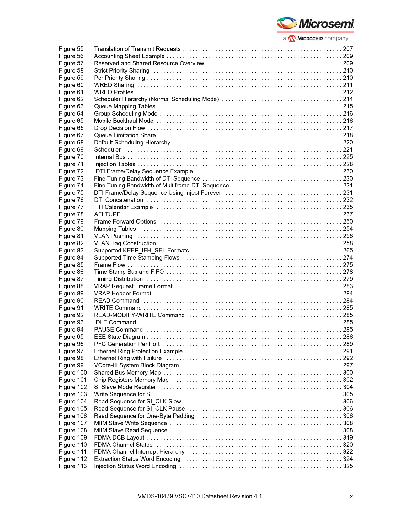 Línea de modelo para esta hoja de datos Versión de texto del documento link to page 224 link to page 226 link to page 226 link to page 227 link to page 227 link to page 228 link to page 229 link to page 231 link to page 232 link to page 233 link to page 233 link to page 234 link to page 235 link to page 237 link to page 238 link to page 242 link to page 245 link to page 247 link to page 247 link to page 248 link to page 248 link to page 249 link to page 252 link to page 254 link to page 267 link to page 271 link to page 273 link to page 275 link to page 282 link to page 291 link to page 292 link to page 295 link to page 296 link to page 300 link to page 301 link to page 301 link to page 302 link to page 302 link to page 302 link to page 302 link to page 303 link to page 306 link to page 308 link to page 309 link to page 314 link to page 317 link to page 319 link to page 321 link to page 322 link to page 323 link to page 323 link to page 323 link to page 325 link to page 325 link to page 336 link to page 337 link to page 339 link to page 341 link to page 342 Figure 55 Translation of Transmit Requests . 207 Figure 56 Accounting Sheet Example . 209 Figure 57 Reserved and Shared Resource Overview . 209 Figure 58 Strict Priority Sharing . 210 Figure 59 Per Priority Sharing . 210 Figure 60 WRED Sharing . 211 Figure 61 WRED Profiles . 212 Figure 62 Scheduler Hierarchy (Normal Scheduling Mode) . 214 Figure 63 Queue Mapping Tables . 215 Figure 64 Group Scheduling Mode . 216 Figure 65 Mobile Backhaul Mode . 216 Figure 66 Drop Decision Flow . 217 Figure 67 Queue Limitation Share . 218 Figure 68 Default Scheduling Hierarchy . 220 Figure 69 Scheduler . 221 Figure 70 Internal Bus . 225 Figure 71 Injection Tables . 228 Figure 72 DTI Frame/Delay Sequence Example . 230 Figure 73 Fine Tuning Bandwidth of DTI Sequence . 230 Figure 74 Fine Tuning Bandwidth of Multiframe DTI Sequence . 231 Figure 75 DTI Frame/Delay Sequence Using Inject Forever . 231 Figure 76 DTI Concatenation . 232 Figure 77 TTI Calendar Example . 235 Figure 78 AFI TUPE . 237 Figure 79 Frame Forward Options . 250 Figure 80 Mapping Tables . 254 Figure 81 VLAN Pushing . 256 Figure 82 VLAN Tag Construction . 258 Figure 83 Supported KEEP_IFH_SEL Formats . 265 Figure 84 Supported Time Stamping Flows . 274 Figure 85 Frame Flow . 275 Figure 86 Time Stamp Bus and FIFO . 278 Figure 87 Timing Distribution . 279 Figure 88 VRAP Request Frame Format . 283 Figure 89 VRAP Header Format . 284 Figure 90 READ Command . 284 Figure 91 WRITE Command . 285 Figure 92 READ-MODIFY-WRITE Command . 285 Figure 93 IDLE Command . 285 Figure 94 PAUSE Command . 285 Figure 95 EEE State Diagram . 286 Figure 96 PFC Generation Per Port . 289 Figure 97 Ethernet Ring Protection Example . 291 Figure 98 Ethernet Ring with Failure . 292 Figure 99 VCore-III System Block Diagram . 297 Figure 100 Shared Bus Memory Map . 300 Figure 101 Chip Registers Memory Map . 302 Figure 102 SI Slave Mode Register . 304 Figure 103 Write Sequence for SI . 305 Figure 104 Read Sequence for SI_CLK Slow . 306 Figure 105 Read Sequence for SI_CLK Pause . 306 Figure 106 Read Sequence for One-Byte Padding . 306 Figure 107 MIIM Slave Write Sequence . 308 Figure 108 MIIM Slave Read Sequence . 308 Figure 109 FDMA DCB Layout . 319 Figure 110 FDMA Channel States . 320 Figure 111 FDMA Channel Interrupt Hierarchy . 322 Figure 112 Extraction Status Word Encoding . 324 Figure 113 Injection Status Word Encoding . 325 VMDS-10479 VSC7410 Datasheet Revision 4.1 x Document Outline 1 Revision History 1.1 Revision 4.1 1.2 Revision 4.0 2 Product Overview 2.1 General Features 2.1.1 Layer 2 and Layer 3 Forwarding 2.1.2 Timing and Synchronization 2.1.3 Quality of Service (QoS) 2.1.4 Security 2.1.5 Management 2.1.6 Product Parameters 2.2 Applications 2.2.1 Wireless Backhaul 2.2.2 Small Cell Application 3 Functional Descriptions 3.1 Register Notations 3.2 Functional Overview 3.2.1 Frame Arrival in Ports and Port Modules 3.2.2 Basic Classification 3.2.3 Security and Control Protocol Classification 3.2.4 Policing 3.2.5 Layer 2 Forwarding 3.2.6 Layer 3 Forwarding 3.2.7 Shared Queue System and Hierarchical Scheduler 3.2.8 Rewriter and Frame Departure 3.2.9 CPU Port Module 3.2.10 Synchronous Ethernet and Precision Time Protocol (PTP) 3.2.11 CPU Subsystem 3.3 Frame Headers 3.3.1 Internal Frame Header Placement 3.3.2 Internal Frame Header Layout 3.3.3 VStaX Header 3.4 Port Numbering and Mappings 3.4.1 Supported SerDes Interfaces 3.4.2 Dual-Media Mode 3.4.3 Logical Port Numbers 3.5 SERDES1G 3.6 SERDES6G 3.7 Copper Transceivers 3.7.1 Register Access 3.7.2 Cat5 Twisted Pair Media Interface 3.7.3 Wake-On-LAN and SecureOn 3.7.4 Ethernet Inline Powered Devices 3.7.5 IEEE 802.3af PoE Support 3.7.6 ActiPHY™ Power Management 3.7.7 Testing Features 3.7.8 VeriPHY™ Cable Diagnostics 3.8 DEV1G and DEV2G5 Port Modules 3.8.1 MAC 3.8.2 Half-Duplex Mode 3.8.3 Physical Coding Sublayer (PCS) 3.8.4 Port Statistics 3.9 Assembler 3.9.1 Setting Up a Port in the Assembler 3.9.2 Setting Up a Port for Frame Injection 3.9.3 Setting Up MAC Control Sublayer PAUSE Frame Detection 3.9.4 Setting Up PFC 3.9.5 Setting Up Assembler Port Statistics 3.9.6 Setting Up the Loopback Path 3.10 Versatile Content-Aware Processor (VCAP) 3.10.1 Configuring VCAP 3.10.2 Wide VCAP Entries and Actions 3.10.3 Individual VCAPs 3.10.4 VCAP Programming Examples 3.11 Pipeline Points 3.11.1 Pipeline Definitions 3.12 Analyzer 3.12.1 Initializing the Analyzer 3.13 VCAP CLM Keys and Actions 3.13.1 Keys Overview 3.13.2 VCAP CLM X1 Key Details 3.13.3 VCAP CLM X2 Key Details 3.13.4 VCAP CLM X4 Key Details 3.13.5 VCAP CLM X8 Key Details 3.13.6 VCAP CLM X16 Key Details 3.13.7 VCAP CLM Actions 3.14 Analyzer Classifier 3.14.1 Basic Classifier 3.14.2 VCAP CLM Processing 3.14.3 QoS Mapping Table 3.14.4 Analyzer Classifier Diagnostics 3.15 VLAN and MSTP 3.15.1 Private VLAN 3.15.2 VLAN Pseudo Code 3.16 VCAP LPM: Keys and Action 3.16.1 VCAP LPM SGL_IP4 Key Details 3.16.2 VCAP LPM DBL_IP4 Key Detail