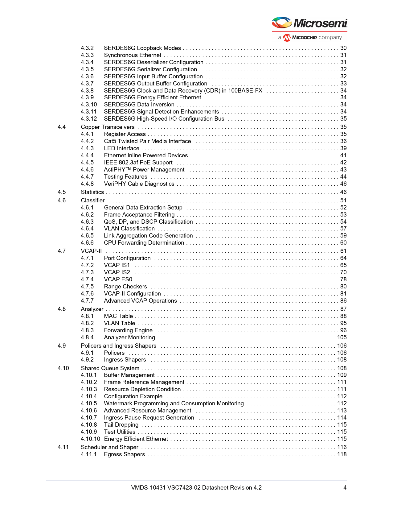 Línea de modelo para esta hoja de datos Versión de texto del documento link to page 59 link to page 60 link to page 60 link to page 61 link to page 61 link to page 62 link to page 63 link to page 63 link to page 63 link to page 63 link to page 64 link to page 64 link to page 64 link to page 65 link to page 68 link to page 70 link to page 71 link to page 72 link to page 73 link to page 75 link to page 75 link to page 80 link to page 81 link to page 82 link to page 83 link to page 86 link to page 88 link to page 89 link to page 90 link to page 93 link to page 94 link to page 99 link to page 107 link to page 109 link to page 110 link to page 115 link to page 116 link to page 117 link to page 124 link to page 125 link to page 134 link to page 135 link to page 135 link to page 137 link to page 137 link to page 138 link to page 140 link to page 140 link to page 141 link to page 141 link to page 142 link to page 143 link to page 144 link to page 144 link to page 144 link to page 145 link to page 147 4.3.2 SERDES6G Loopback Modes . 30 4.3.3 Synchronous Ethernet . 31 4.3.4 SERDES6G Deserializer Configuration . 31 4.3.5 SERDES6G Serializer Configuration . 32 4.3.6 SERDES6G Input Buffer Configuration . 32 4.3.7 SERDES6G Output Buffer Configuration . 33 4.3.8 SERDES6G Clock and Data Recovery (CDR) in 100BASE-FX . 34 4.3.9 SERDES6G Energy Efficient Ethernet . 34 4.3.10 SERDES6G Data Inversion . 34 4.3.11 SERDES6G Signal Detection Enhancements . 34 4.3.12 SERDES6G High-Speed I/O Configuration Bus . 35 4.4 Copper Transceivers . 35 4.4.1 Register Access . 35 4.4.2 Cat5 Twisted Pair Media Interface . 36 4.4.3 LED Interface . 39 4.4.4 Ethernet Inline Powered Devices . 41 4.4.5 IEEE 802.3af PoE Support . 42 4.4.6 ActiPHY™ Power Management . 43 4.4.7 Testing Features . 44 4.4.8 VeriPHY Cable Diagnostics . 46 4.5 Statistics . 46 4.6 Classifier . 51 4.6.1 General Data Extraction Setup . 52 4.6.2 Frame Acceptance Filtering . 53 4.6.3 QoS, DP, and DSCP Classification . 54 4.6.4 VLAN Classification . 57 4.6.5 Link Aggregation Code Generation . 59 4.6.6 CPU Forwarding Determination . 60 4.7 VCAP-II . 61 4.7.1 Port Configuration . 64 4.7.2 VCAP IS1 . 65 4.7.3 VCAP IS2 . 70 4.7.4 VCAP ES0 . 78 4.7.5 Range Checkers . 80 4.7.6 VCAP-II Configuration . 81 4.7.7 Advanced VCAP Operations . 86 4.8 Analyzer . 87 4.8.1 MAC Table . 88 4.8.2 VLAN Table . 95 4.8.3 Forwarding Engine . 96 4.8.4 Analyzer Monitoring . 105 4.9 Policers and Ingress Shapers . 106 4.9.1 Policers . 106 4.9.2 Ingress Shapers . 108 4.10 Shared Queue System . 108 4.10.1 Buffer Management . 109 4.10.2 Frame Reference Management . 111 4.10.3 Resource Depletion Condition . 111 4.10.4 Configuration Example . 112 4.10.5 Watermark Programming and Consumption Monitoring . 112 4.10.6 Advanced Resource Management . 113 4.10.7 Ingress Pause Request Generation . 114 4.10.8 Tail Dropping . 115 4.10.9 Test Utilities . 115 4.10.10 Energy Efficient Ethernet . 115 4.11 Scheduler and Shaper . 116 4.11.1 Egress Shapers . 118 VMDS-10431 VSC7423-02 Datasheet Revision 4.2 4 Document Outline 1 Revision History 1.1 Revision 4.2 1.2 Revision 4.1 1.3 Revision 4.0 2 Introduction 2.1 Register Notation 2.2 Standard References 2.2.1 Terms and Abbreviations 3 Product Overview 3.1 General Features 3.1.1 Layer 2 Switching 3.1.2 Multicast 3.1.3 Carrier Ethernet 3.1.4 Quality of Service 3.1.5 Security 3.1.6 Management 3.2 Applications 3.3 Related Products 3.3.1 Jaguar-1 and Lynx-1 3.4 Functional Overview 3.4.1 Frame Arrival 3.4.2 Basic and Advanced Frame Classification 3.4.3 VCAP-II Vitesse Content Aware Processor 3.4.4 Policing 3.4.5 Layer 2 Forwarding 3.4.6 Shared Queue System and Egress Scheduler 3.4.7 Rewriter and Frame Departure 3.4.8 CPU Port Module 3.4.9 Synchronous Ethernet and Precision Time Protocol 3.4.10 CPU System and Interfaces 4 Functional Descriptions 4.1 Port Modules 4.1.1 Port Module Numbering and Macro Connections 4.1.2 MAC 4.1.3 PCS 4.2 SERDES1G 4.2.1 SERDES1G Basic Configuration 4.2.2 SERDES1G Loopback Modes 4.2.3 Synchronous Ethernet 4.2.4 SERDES1G Deserializer Configuration 4.2.5 SERDES1G Serializer Configuration 4.2.6 SERDES1G Input Buffer Configuration 4.2.7 SERDES1G Output Buffer Configuration 4.2.8 SERDES1G Clock and Data Recovery (CDR) in 100BASE-FX 4.2.9 SERDES1G Energy Efficient Ethernet 4.2.10 SERDES1G Data Inversion 4.3 SERDES6G 4.3.1 SERDES6G Basic Configuration 4.3.2 SERDES6G Loopback Modes 4.3.3 Synchronous Ethernet 4.3.4 SERDES6G Deserializer Configuration 4.3.5 SERDES6G Serializer Configuration 4.3.6 SERDES6G Input Buffer Configuration 4.3.7 SERDES6G Output Buffer Configuration 4.3.8 SERDES6G Clock and Data Recovery (CDR) in 100BASE-FX 4.3.9 SERDES6G Energy Efficient Ethernet 4.3.10 SERDES6G Data Inversion 4.3.11 SERDES6G Signal Detection Enhancements 4.3.12 SERDES6G High-Speed I/O Configuration Bus 4.4 Copper Transceivers 4.4.1 Register Access 4.4.2 Cat5 Twisted Pair Media Interface 4.4.3 LED Interface 4.4.4 Ethernet Inline Powered Devices 4.4.5 IEEE 802.3af PoE Support 4.4.6 ActiPHY™ Power Management 4.4.7 Testing Features 4.4.8 VeriPHY Cable Diagnostics 4.5 Statistics 4.6 Classifier 4.6.1 General Data Extraction Setup 4.6.2 Frame Acceptance Filtering 4.6.3 QoS, DP, and DSCP Classification 4.6.4 VLAN Classification 4.6.5 Link Aggregation Code Generation 4.6.6 CPU Forwarding Determination 4.7 VCAP-II 4.7.1 Port Configuration 4.7.2 VCAP IS1 4.7.3 VCAP IS2 4.7.4 VCAP ES0 4.7.5 Range Checkers 4.7.6 VCAP-II Configuration 4.7.7 Advanced VCAP Operations 4.8 Analyzer 4.8.1 MAC Table 4.8.2 VLAN Table 4.8.3 Forwarding Engine 4.8.4 Analyzer Monitoring 4.9 Policers and Ingress Shapers 4.9.1 Policers 4.9.2 Ingress Shapers 4.10 Shared Queue System 4.10.1 Buffer Management 4.10.2 Frame Reference Management 4.10.3 Resource Depletion Condition 4.10.4 Configuration Example 4.10.5 Watermark Programming and Consumption Monitoring 4.10.6 Advanced Resource Management 4.10.7 Ingress Pause Request Generation 4.10.8 Tail Dropping 4.10.9 Test Utilities 4.10.10 Energy Ef