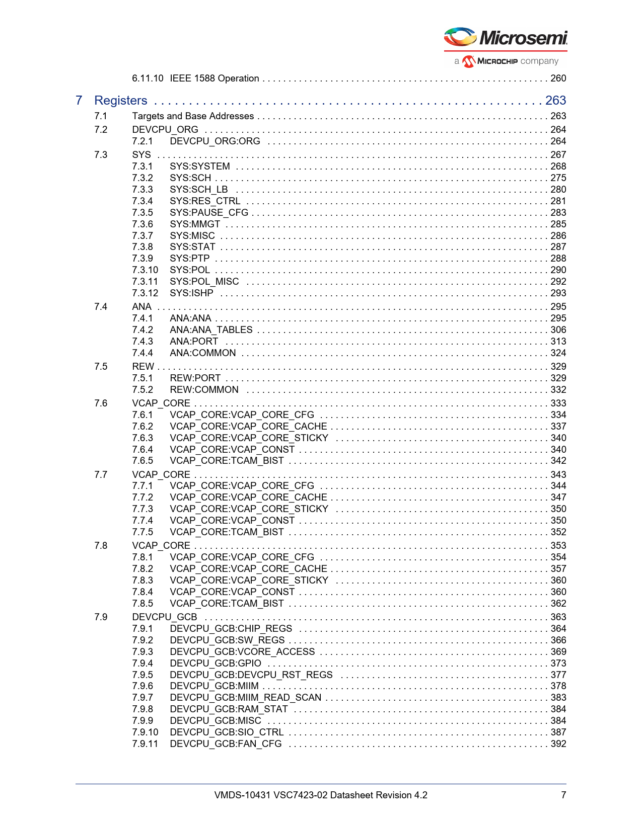Línea de modelo para esta hoja de datos Versión de texto del documento link to page 289 link to page 292 link to page 292 link to page 293 link to page 293 link to page 296 link to page 297 link to page 304 link to page 309 link to page 310 link to page 312 link to page 314 link to page 315 link to page 316 link to page 317 link to page 319 link to page 321 link to page 322 link to page 324 link to page 324 link to page 335 link to page 342 link to page 353 link to page 358 link to page 358 link to page 361 link to page 362 link to page 363 link to page 366 link to page 369 link to page 369 link to page 371 link to page 372 link to page 373 link to page 376 link to page 379 link to page 379 link to page 381 link to page 382 link to page 383 link to page 386 link to page 389 link to page 389 link to page 391 link to page 392 link to page 393 link to page 395 link to page 398 link to page 402 link to page 406 link to page 407 link to page 412 link to page 413 link to page 413 link to page 416 link to page 421 6.11.10 IEEE 1588 Operation . 260 7 Registers . 263 7.1 Targets and Base Addresses . 263 7.2 DEVCPU_ORG . 264 7.2.1 DEVCPU_ORG:ORG . 264 7.3 SYS . 267 7.3.1 SYS:SYSTEM . 268 7.3.2 SYS:SCH . 275 7.3.3 SYS:SCH_LB . 280 7.3.4 SYS:RES_CTRL . 281 7.3.5 SYS:PAUSE_CFG . 283 7.3.6 SYS:MMGT . 285 7.3.7 SYS:MISC . 286 7.3.8 SYS:STAT . 287 7.3.9 SYS:PTP . 288 7.3.10 SYS:POL . 290 7.3.11 SYS:POL_MISC . 292 7.3.12 SYS:ISHP . 293 7.4 ANA . 295 7.4.1 ANA:ANA . 295 7.4.2 ANA:ANA_TABLES . 306 7.4.3 ANA:PORT . 313 7.4.4 ANA:COMMON . 324 7.5 REW . 329 7.5.1 REW:PORT . 329 7.5.2 REW:COMMON . 332 7.6 VCAP_CORE . 333 7.6.1 VCAP_CORE:VCAP_CORE_CFG . 334 7.6.2 VCAP_CORE:VCAP_CORE_CACHE . 337 7.6.3 VCAP_CORE:VCAP_CORE_STICKY . 340 7.6.4 VCAP_CORE:VCAP_CONST . 340 7.6.5 VCAP_CORE:TCAM_BIST . 342 7.7 VCAP_CORE . 343 7.7.1 VCAP_CORE:VCAP_CORE_CFG . 344 7.7.2 VCAP_CORE:VCAP_CORE_CACHE . 347 7.7.3 VCAP_CORE:VCAP_CORE_STICKY . 350 7.7.4 VCAP_CORE:VCAP_CONST . 350 7.7.5 VCAP_CORE:TCAM_BIST . 352 7.8 VCAP_CORE . 353 7.8.1 VCAP_CORE:VCAP_CORE_CFG . 354 7.8.2 VCAP_CORE:VCAP_CORE_CACHE . 357 7.8.3 VCAP_CORE:VCAP_CORE_STICKY . 360 7.8.4 VCAP_CORE:VCAP_CONST . 360 7.8.5 VCAP_CORE:TCAM_BIST . 362 7.9 DEVCPU_GCB . 363 7.9.1 DEVCPU_GCB:CHIP_REGS . 364 7.9.2 DEVCPU_GCB:SW_REGS . 366 7.9.3 DEVCPU_GCB:VCORE_ACCESS . 369 7.9.4 DEVCPU_GCB:GPIO . 373 7.9.5 DEVCPU_GCB:DEVCPU_RST_REGS . 377 7.9.6 DEVCPU_GCB:MIIM . 378 7.9.7 DEVCPU_GCB:MIIM_READ_SCAN . 383 7.9.8 DEVCPU_GCB:RAM_STAT . 384 7.9.9 DEVCPU_GCB:MISC . 384 7.9.10 DEVCPU_GCB:SIO_CTRL . 387 7.9.11 DEVCPU_GCB:FAN_CFG . 392 VMDS-10431 VSC7423-02 Datasheet Revision 4.2 7 Document Outline 1 Revision History 1.1 Revision 4.2 1.2 Revision 4.1 1.3 Revision 4.0 2 Introduction 2.1 Register Notation 2.2 Standard References 2.2.1 Terms and Abbreviations 3 Product Overview 3.1 General Features 3.1.1 Layer 2 Switching 3.1.2 Multicast 3.1.3 Carrier Ethernet 3.1.4 Quality of Service 3.1.5 Security 3.1.6 Management 3.2 Applications 3.3 Related Products 3.3.1 Jaguar-1 and Lynx-1 3.4 Functional Overview 3.4.1 Frame Arrival 3.4.2 Basic and Advanced Frame Classification 3.4.3 VCAP-II Vitesse Content Aware Processor 3.4.4 Policing 3.4.5 Layer 2 Forwarding 3.4.6 Shared Queue System and Egress Scheduler 3.4.7 Rewriter and Frame Departure 3.4.8 CPU Port Module 3.4.9 Synchronous Ethernet and Precision Time Protocol 3.4.10 CPU System and Interfaces 4 Functional Descriptions 4.1 Port Modules 4.1.1 Port Module Numbering and Macro Connections 4.1.2 MAC 4.1.3 PCS 4.2 SERDES1G 4.2.1 SERDES1G Basic Configuration 4.2.2 SERDES1G Loopback Modes 4.2.3 Synchronous Ethernet 4.2.4 SERDES1G Deserializer Configuration 4.2.5 SERDES1G Serializer Configuration 4.2.6 SERDES1G Input Buffer Configuration 4.2.7 SERDES1G Output Buffer Configuration 4.2.8 SERDES1G Clock and Data Recovery (CDR) in 100BASE-FX 4.2.9 SERDES1G Energy Efficient Ethernet 4.2.10 SERDES1G Data Inversion 4.3 SERDES6G 4.3.1 SERDES6G Basic Configuration 4.3.2 SERDES6G Loopback Modes 4.3.3 Synchronous Ethernet 4.3.4 SERDES6G Deserializer Configuration 4.3.5 SERDES6G Serializer Configuration 4.3.6 SERDES6G Input Buffer Configuration 4.3.7 SERDES6G Output Buffer Configuration 4.3.8 SERDES6G Clock and Data Recovery (CDR) in 100BASE-FX 4.3.9 SERDES6G Energy Efficient Ethernet 4.3.10 SERDES6G Data Inversion 4.3.11 SERDES6G Signal Detection Enhancements 4.3.12 SERDES6G High-Speed I/O Configuration Bus 4.4 Copper Transceivers 4.4.1 Register Access 4.4.2 Cat5 Twisted Pair Media Interface 4.4.3 LED Interface 4.4.4 Ethernet Inline Powered Devices 4.4.5 IEEE 802.3af PoE Support 4.4.6 ActiPHY™ Power Management 4.4.7 Testing Features 4.4.8 VeriPHY Cable Diagnostics 4.5 Statistics 4.6 Classifier 4.6.1 General Data Extraction Setup 4.6.2 Frame Acceptance Filtering 4.6.3 QoS, DP, and DSCP Classification 4.6.4 VLAN Classification 4.6.5 Link Aggregation Code Generation 4.6.6 CPU Forwarding Determination 4.7 VCAP-II 4.7.1 Port Configuration 4.7.2 VCAP IS1 4.7.3 VCAP IS2 4.7.4 VCAP ES0 4.7.5 Range Checkers 4.7.6 VCAP-II Configuration 4.7.7 Advanced VCAP Operations 4.8 Analyzer 4.8.1 MAC Table 4.8.2 VLAN Table 4.8.3 Forwarding Engine 4.8.4 Analyzer Monitoring 4.9 Policers and Ingress Shapers 4.9.1 Policers 4.9.2 Ingress Shapers 4.10 Shared Queue System 4.10.1 Buffer Management 4.10.2 Frame Reference Management 4.10.3 Resource Depletion Condition 4.10.4 Configuration Example 4.10.5 Watermark Programming and Consumption Monitoring 4.10.6 Advanced Resource Management 4.10.7 Ingress Pause Request Generation 4.10.8 Tail Dropping 4.10.9 Test Utilities 4.10.10 Energy Efficient Ethernet 4.11 Scheduler and Shaper 4.11.1 Egress Shapers 4.11.2 Deficit Weighted Round Robin 4.11.3 Shaping and DWRR Scheduling Examples 4.12 Rewriter 4.12.1 VLAN Editing 4.12.2 DSCP Remarking 4.12.3 FCS Updating 4.12.4 CPU Extraction Header Insertion 4.13 CPU Port Module 4.13.1 Frame Extraction 4.13.2 Frame Injection 4.13.3 Network Processor Interface (NPI) 4.14 Layer 1 Timing 4.15 Hardware Timestamping 4