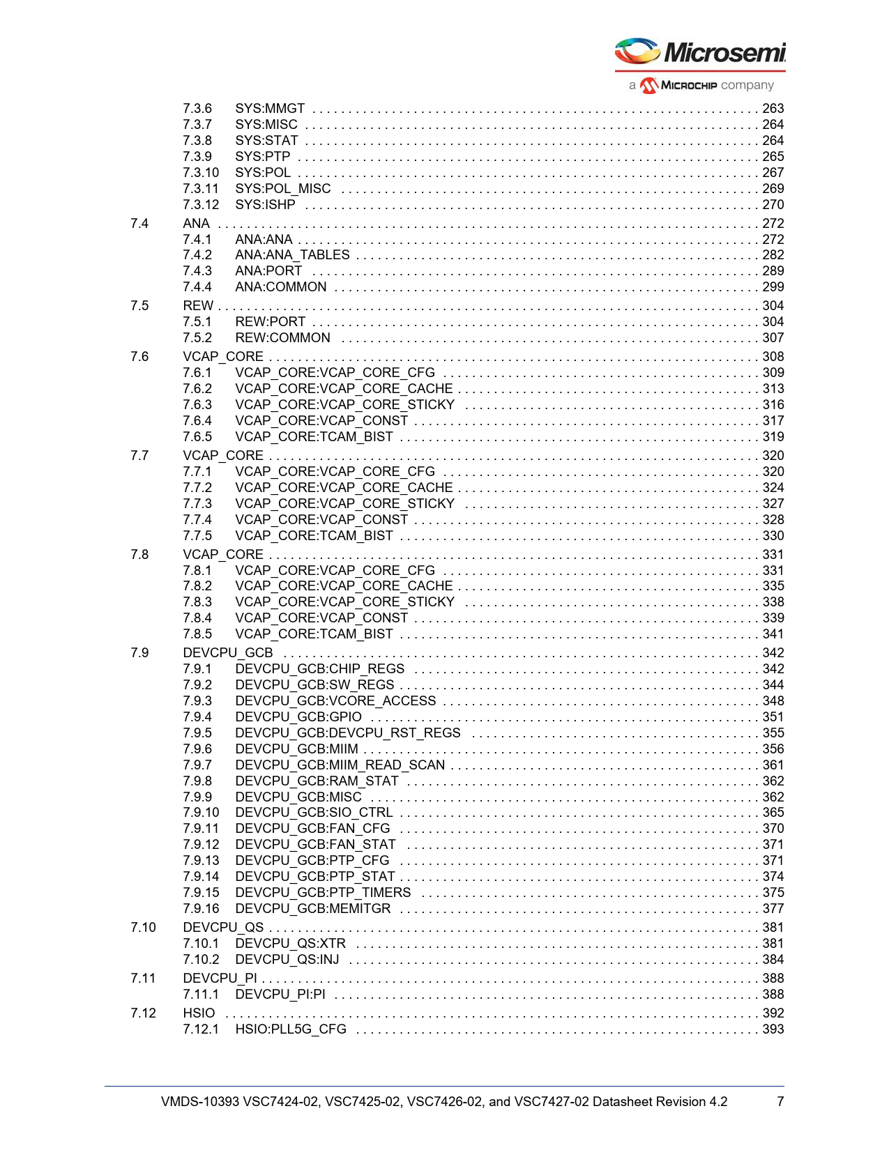 Línea de modelo para esta hoja de datos Versión de texto del documento link to page 293 link to page 294 link to page 294 link to page 295 link to page 297 link to page 299 link to page 300 link to page 302 link to page 302 link to page 312 link to page 319 link to page 329 link to page 334 link to page 334 link to page 337 link to page 338 link to page 339 link to page 343 link to page 346 link to page 347 link to page 349 link to page 350 link to page 350 link to page 354 link to page 357 link to page 358 link to page 360 link to page 361 link to page 361 link to page 365 link to page 368 link to page 369 link to page 371 link to page 372 link to page 372 link to page 374 link to page 378 link to page 381 link to page 385 link to page 386 link to page 391 link to page 392 link to page 392 link to page 395 link to page 400 link to page 401 link to page 401 link to page 404 link to page 405 link to page 407 link to page 411 link to page 411 link to page 414 link to page 418 link to page 418 link to page 422 link to page 423 7.3.6 SYS:MMGT . 263 7.3.7 SYS:MISC . 264 7.3.8 SYS:STAT . 264 7.3.9 SYS:PTP . 265 7.3.10 SYS:POL . 267 7.3.11 SYS:POL_MISC . 269 7.3.12 SYS:ISHP . 270 7.4 ANA . 272 7.4.1 ANA:ANA . 272 7.4.2 ANA:ANA_TABLES . 282 7.4.3 ANA:PORT . 289 7.4.4 ANA:COMMON . 299 7.5 REW . 304 7.5.1 REW:PORT . 304 7.5.2 REW:COMMON . 307 7.6 VCAP_CORE . 308 7.6.1 VCAP_CORE:VCAP_CORE_CFG . 309 7.6.2 VCAP_CORE:VCAP_CORE_CACHE . 313 7.6.3 VCAP_CORE:VCAP_CORE_STICKY . 316 7.6.4 VCAP_CORE:VCAP_CONST . 317 7.6.5 VCAP_CORE:TCAM_BIST . 319 7.7 VCAP_CORE . 320 7.7.1 VCAP_CORE:VCAP_CORE_CFG . 320 7.7.2 VCAP_CORE:VCAP_CORE_CACHE . 324 7.7.3 VCAP_CORE:VCAP_CORE_STICKY . 327 7.7.4 VCAP_CORE:VCAP_CONST . 328 7.7.5 VCAP_CORE:TCAM_BIST . 330 7.8 VCAP_CORE . 331 7.8.1 VCAP_CORE:VCAP_CORE_CFG . 331 7.8.2 VCAP_CORE:VCAP_CORE_CACHE . 335 7.8.3 VCAP_CORE:VCAP_CORE_STICKY . 338 7.8.4 VCAP_CORE:VCAP_CONST . 339 7.8.5 VCAP_CORE:TCAM_BIST . 341 7.9 DEVCPU_GCB . 342 7.9.1 DEVCPU_GCB:CHIP_REGS . 342 7.9.2 DEVCPU_GCB:SW_REGS . 344 7.9.3 DEVCPU_GCB:VCORE_ACCESS . 348 7.9.4 DEVCPU_GCB:GPIO . 351 7.9.5 DEVCPU_GCB:DEVCPU_RST_REGS . 355 7.9.6 DEVCPU_GCB:MIIM . 356 7.9.7 DEVCPU_GCB:MIIM_READ_SCAN . 361 7.9.8 DEVCPU_GCB:RAM_STAT . 362 7.9.9 DEVCPU_GCB:MISC . 362 7.9.10 DEVCPU_GCB:SIO_CTRL . 365 7.9.11 DEVCPU_GCB:FAN_CFG . 370 7.9.12 DEVCPU_GCB:FAN_STAT . 371 7.9.13 DEVCPU_GCB:PTP_CFG . 371 7.9.14 DEVCPU_GCB:PTP_STAT . 374 7.9.15 DEVCPU_GCB:PTP_TIMERS . 375 7.9.16 DEVCPU_GCB:MEMITGR . 377 7.10 DEVCPU_QS . 381 7.10.1 DEVCPU_QS:XTR . 381 7.10.2 DEVCPU_QS:INJ . 384 7.11 DEVCPU_PI . 388 7.11.1 DEVCPU_PI:PI . 388 7.12 HSIO . 392 7.12.1 HSIO:PLL5G_CFG . 393 VMDS-10393 VSC7424-02, VSC7425-02, VSC7426-02, and VSC7427-02 Datasheet Revision 4.2 7 Document Outline 1 Revision History 1.1 Revision 4.2 1.2 Revision 4.1 1.3 Revision 4.0 1.4 Revision 2.0 2 Introduction 2.1 Register Notation 2.2 Standard References 2.3 Terms and Abbreviations 3 Product Overview 3.1 General Features 3.1.1 Layer-2 Switching 3.1.2 Multicast 3.1.3 Quality of Service 3.1.4 Security 3.1.5 Management 3.2 Applications 3.3 Related Products 3.4 Functional Overview 3.4.1 Frame Arrival 3.4.2 Basic and Advanced Frame Classification 3.4.3 VCAP-II Vitesse Content Aware Processor 3.4.4 Policing 3.4.5 Layer-2 Forwarding 3.4.6 Shared Queue System and Egress Scheduler 3.4.7 Rewriter and Frame Departure 3.4.8 CPU Port Module 3.4.9 CPU System and Interfaces 4 Functional Descriptions 4.1 Port Modules 4.1.1 Port Module Numbering and Macro Connections 4.1.2 MAC 4.1.3 PCS 4.2 SERDES1G 4.2.1 SERDES1G Basic Configuration 4.2.2 SERDES1G Loopback Modes 4.2.3 SERDES1G Deserializer Configuration 4.2.4 SERDES1G Serializer Configuration 4.2.5 SERDES1G Input Buffer Configuration 4.2.6 SERDES1G Output Buffer Configuration 4.2.7 SERDES1G Clock and Data Recovery (CDR) in 100BASE-FX 4.2.8 SERDES1G Energy Efficient Ethernet 4.2.9 SERDES1G Data Inversion 4.3 SERDES6G 4.3.1 SERDES6G Basic Configuration 4.3.2 SERDES6G Loopback Modes 4.3.3 SERDES6G Deserializer Configuration 4.3.4 SERDES6G Serializer Configuration 4.3.5 SERDES6G Input Buffer Configuration 4.3.6 SERDES6G Output Buffer Configuration 4.3.7 SERDES6G Clock and Data Recovery (CDR) in 100BASE-FX 4.3.8 SERDES6G Energy Efficient Ethernet 4.3.9 SERDES6G Data Inversion 4.3.10 SERDES6G Signal Detection Enhancements 4.3.11 SERDES6G High-Speed I/O Configuration Bus 4.4 Copper Transceivers 4.4.1 Register Access 4.4.2 Cat5 Twisted Pair Media Interface 4.4.3 LED Interface 4.4.4 Ethernet Inline Powered Devices 4.4.5 IEEE 802.3af PoE Support 4.4.6 ActiPHY™ Power Management 4.4.7 Testing Features 4.4.8 VeriPHY™ Cable Diagnostics 4.5 Statistics 4.6 Classifier 4.6.1 General Data Extraction Setup 4.6.2 Frame Acceptance Filtering 4.6.3 QoS, DP, and DSCP Classification 4.6.4 VLAN Classification 4.6.5 Link Aggregation Code Generation 4.6.6 CPU Forwarding Determination 4.7 VCAP-II 4.7.1 Port Configuration 4.7.2 VCAP IS1 4.7.3 VCAP IS2 4.7.4 VCAP ES0 4.7.5 Range Checkers 4.7.6 VCAP-II Configuration 4.7.7 Advanced VCAP Operations 4.8 Analyzer 4.8.1 MAC Table 4.8.2 VLAN Table 4.8.3 Forwarding Engine 4.8.4 Analyzer Monitoring 4.9 Policers and Ingress Shapers 4.9.1 Policers 4.9.2 Ingress Shapers 4.10 Shared Queue System 4.10.1 Buffer Management 4.10.2 Frame Reference Management 4.10.3 Resource Depletion Condition 4.10.4 Configuration Example 4.10.5 Watermark Programming and Consumption Monitoring 4.10.6 Advanced Resource Management 4.10.7 Ingress Pause Request Generation 4.10.8 Tail Dropping 4.10.9 Test Utilities 4.10.10 Energy Efficient Ethernet 4.11 Scheduler and Shaper 4.11.1 Egress Shapers 4.11.2 Deficit Weighted Round Robin 4.11.3 Shaping and DWRR Scheduling Examples 4.12 Rewriter 4.12.1 VLAN Editing 4.12.2 DSCP Remarking 4.12.3 FCS Updating 4.12.4 CPU Extraction Header Insertion 4.13 CPU Port Module 4.13.1 Frame Extraction 4.13.2 Frame Injection 4.13.3 Network Processor Interface (NPI) 4.14 Hardware Timestamping for AVB 4.14.1 Timestamp Classification 4.14