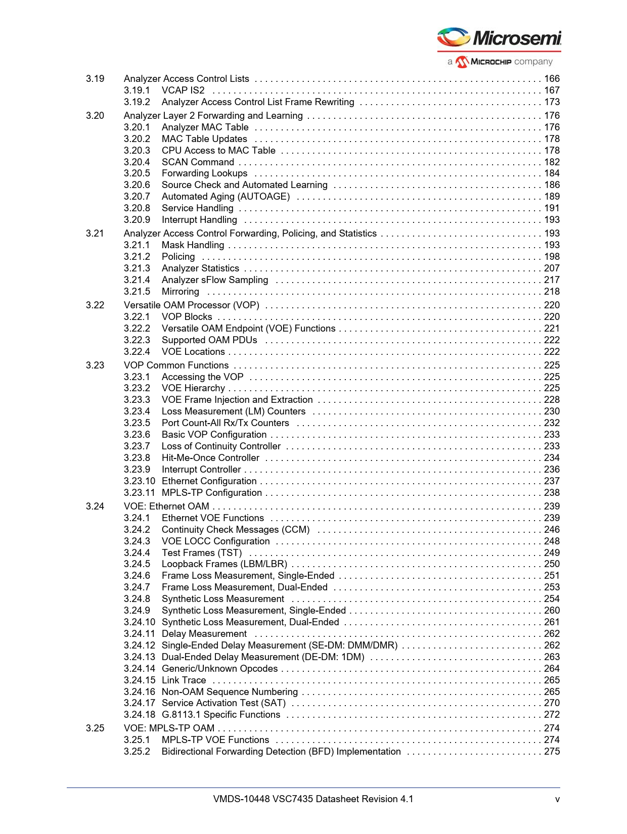 Línea de modelo para esta hoja de datos Versión de texto del documento link to page 185 link to page 186 link to page 192 link to page 195 link to page 195 link to page 197 link to page 197 link to page 201 link to page 203 link to page 205 link to page 208 link to page 210 link to page 212 link to page 212 link to page 212 link to page 217 link to page 226 link to page 236 link to page 237 link to page 239 link to page 239 link to page 240 link to page 241 link to page 241 link to page 244 link to page 244 link to page 244 link to page 247 link to page 249 link to page 251 link to page 252 link to page 252 link to page 253 link to page 255 link to page 256 link to page 257 link to page 258 link to page 258 link to page 265 link to page 267 link to page 268 link to page 269 link to page 270 link to page 272 link to page 273 link to page 279 link to page 280 link to page 281 link to page 281 link to page 282 link to page 283 link to page 284 link to page 284 link to page 289 link to page 291 link to page 293 link to page 293 link to page 294 3.19 Analyzer Access Control Lists . 166 3.19.1 VCAP IS2 . 167 3.19.2 Analyzer Access Control List Frame Rewriting . 173 3.20 Analyzer Layer 2 Forwarding and Learning . 176 3.20.1 Analyzer MAC Table . 176 3.20.2 MAC Table Updates . 178 3.20.3 CPU Access to MAC Table . 178 3.20.4 SCAN Command . 182 3.20.5 Forwarding Lookups . 184 3.20.6 Source Check and Automated Learning . 186 3.20.7 Automated Aging (AUTOAGE) . 189 3.20.8 Service Handling . 191 3.20.9 Interrupt Handling . 193 3.21 Analyzer Access Control Forwarding, Policing, and Statistics . 193 3.21.1 Mask Handling . 193 3.21.2 Policing . 198 3.21.3 Analyzer Statistics . 207 3.21.4 Analyzer sFlow Sampling . 217 3.21.5 Mirroring . 218 3.22 Versatile OAM Processor (VOP) . 220 3.22.1 VOP Blocks . 220 3.22.2 Versatile OAM Endpoint (VOE) Functions . 221 3.22.3 Supported OAM PDUs . 222 3.22.4 VOE Locations . 222 3.23 VOP Common Functions . 225 3.23.1 Accessing the VOP . 225 3.23.2 VOE Hierarchy . 225 3.23.3 VOE Frame Injection and Extraction . 228 3.23.4 Loss Measurement (LM) Counters . 230 3.23.5 Port Count-All Rx/Tx Counters . 232 3.23.6 Basic VOP Configuration . 233 3.23.7 Loss of Continuity Controller . 233 3.23.8 Hit-Me-Once Controller . 234 3.23.9 Interrupt Controller . 236 3.23.10 Ethernet Configuration . 237 3.23.11 MPLS-TP Configuration . 238 3.24 VOE: Ethernet OAM . 239 3.24.1 Ethernet VOE Functions . 239 3.24.2 Continuity Check Messages (CCM) . 246 3.24.3 VOE LOCC Configuration . 248 3.24.4 Test Frames (TST) . 249 3.24.5 Loopback Frames (LBM/LBR) . 250 3.24.6 Frame Loss Measurement, Single-Ended . 251 3.24.7 Frame Loss Measurement, Dual-Ended . 253 3.24.8 Synthetic Loss Measurement . 254 3.24.9 Synthetic Loss Measurement, Single-Ended . 260 3.24.10 Synthetic Loss Measurement, Dual-Ended . 261 3.24.11 Delay Measurement . 262 3.24.12 Single-Ended Delay Measurement (SE-DM: DMM/DMR) . 262 3.24.13 Dual-Ended Delay Measurement (DE-DM: 1DM) . 263 3.24.14 Generic/Unknown Opcodes . 264 3.24.15 Link Trace . 265 3.24.16 Non-OAM Sequence Numbering . 265 3.24.17 Service Activation Test (SAT) . 270 3.24.18 G.8113.1 Specific Functions . 272 3.25 VOE: MPLS-TP OAM . 274 3.25.1 MPLS-TP VOE Functions . 274 3.25.2 Bidirectional Forwarding Detection (BFD) Implementation . 275 VMDS-10448 VSC7435 Datasheet Revision 4.1 v Document Outline 1 Revision History 1.1 Revision 4.1 1.2 Revision 4.0 2 Product Overview 2.1 General Features 2.1.1 Layer 2 and Layer 3 Forwarding 2.1.2 Carrier Ethernet Support 2.1.3 Timing and Synchronization 2.1.4 Quality of Service 2.1.5 Security 2.1.6 Management 2.1.7 Product Parameters 2.2 Applications 2.2.1 Wireless Backhaul 2.2.2 Network Interface Device (NID) 2.2.3 Carrier Ethernet Switch with MPLS-TP 2.2.4 Small Cell Application 3 Functional Descriptions 3.1 Register Notations 3.2 Functional Overview 3.2.1 Frame Arrival in Ports and Port Modules 3.2.2 Basic Classification 3.2.3 Virtualized Service Aware Architecture (ViSAA™) 3.2.4 Security and Control Protocol Classification 3.2.5 Policing 3.2.6 Layer 2 Forwarding 3.2.7 Layer 3 Forwarding 3.2.8 Shared Queue System and Hierarchical Scheduler 3.2.9 Rewriter and Frame Departure 3.2.10 CPU Port Module 3.2.11 Synchronous Ethernet and Precision Time Protocol (PTP) 3.2.12 Ethernet and MPLS OAM 3.2.13 CPU Subsystem 3.3 Frame Headers 3.3.1 Internal Frame Header Placement 3.3.2 Internal Frame Header Layout 3.3.3 VStaX Header 3.4 Port Numbering and Mappings 3.4.1 Supported SerDes Interfaces 3.4.2 Dual-Media Mode 3.4.3 Logical Port Numbers 3.5 SERDES1G 3.6 SERDES6G 3.7 Copper Transceivers 3.7.1 Register Access 3.7.2 Cat5 Twisted Pair Media Interface 3.7.3 Wake-On-LAN and SecureOn 3.7.4 Ethernet Inline Powered Devices 3.7.5 IEEE 802.3af PoE Support 3.7.6 ActiPHY™ Power Management 3.7.7 Testing Features 3.7.8 VeriPHY™ Cable Diagnostics 3.8 DEV1G and DEV2G5 Port Modules 3.8.1 MAC 3.8.2 Half-Duplex Mode 3.8.3 Physical Coding Sublayer (PCS) 3.8.4 Port Statistics 3.9 Assembler 3.9.1 Setting Up a Port in the Assembler 3.9.2 Setting Up a Port for Frame Injection 3.9.3 Setting Up MAC Control Sublayer PAUSE Frame Detection 3.9.4 Setting Up PFC 3.9.5 Setting Up Assembler Port Statistics 3.9.6 Setting Up the Loopback Path 3.10 Versatile Content-Aware Processor (VCAP) 3.10.1 Configuring VCAP 3.10.2 Wide VCAP Entries and Actions 3.10.3 Individual VCAPs 3.10.4 VCAP Programming Examples 3.11 Pipeline Points 3.11.1 Pipeline Definitions 3.12 Analyzer 3.12.1 Initializing the Analyzer 3.13 VCAP CLM Keys and Actions 3.13.1 Keys Overview 3.13.2 VCAP CLM X1 Key Details 3.13.3 VCAP CLM X2 Key Details 3.13.4 VCAP CLM X4 Key Details 3.13.5 VCAP CLM X8 Key Details 3.13.6 VCAP CLM X16 Key Details 3.13.7 VCAP CLM Actions 3.14 Analyzer Classifier 3.14.1 Basic Classifier 3.14.2 VCAP CLM Processing 3.14.3 QoS Mapping Table 3.14.4 Ingress Protection Table (IPT) 3.14.5 Layer 2 Control Protocol Processing 3.14.6 Y.1731 Ethernet MIP 3.14.7 Analyzer Classifier Diagnostics 3.15 VLA