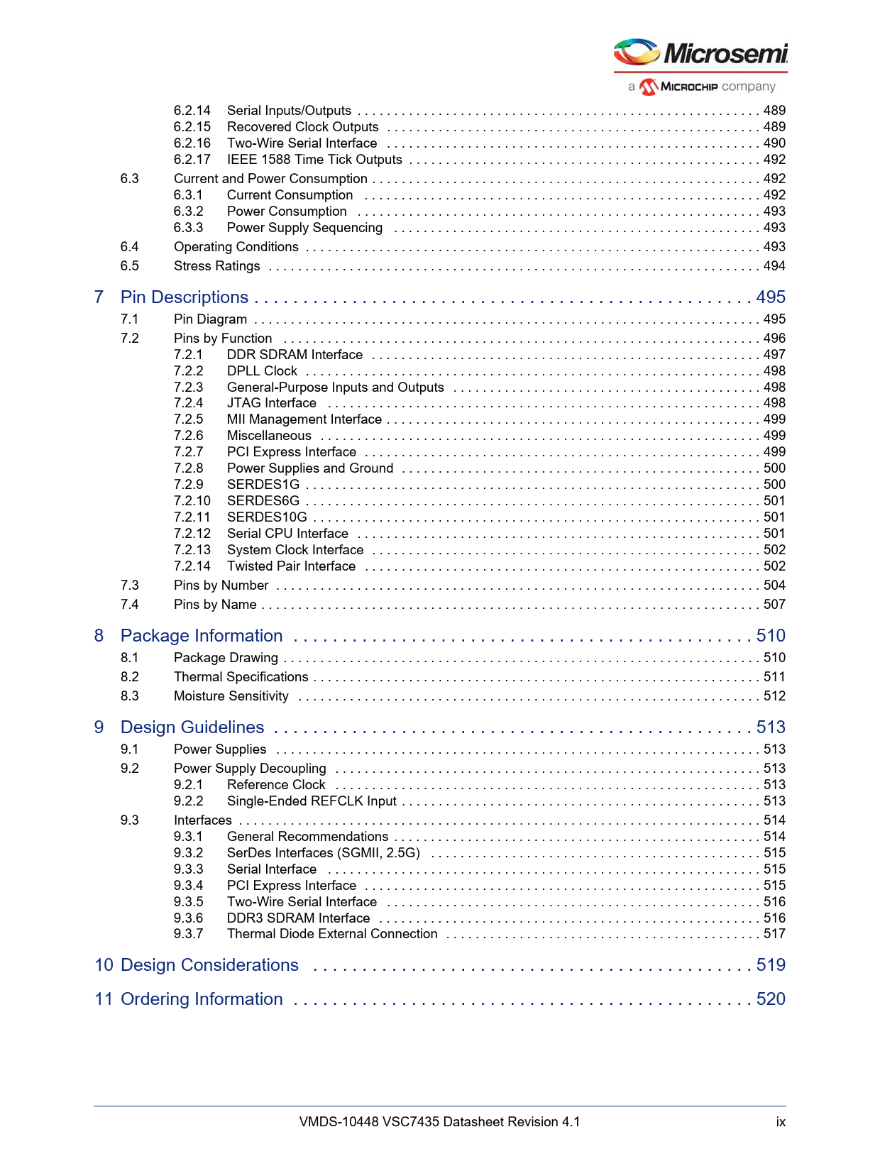 Línea de modelo para esta hoja de datos Versión de texto del documento link to page 508 link to page 508 link to page 509 link to page 511 link to page 511 link to page 511 link to page 512 link to page 512 link to page 512 link to page 513 link to page 514 link to page 514 link to page 515 link to page 516 link to page 517 link to page 517 link to page 517 link to page 518 link to page 518 link to page 518 link to page 519 link to page 519 link to page 520 link to page 520 link to page 520 link to page 521 link to page 521 link to page 523 link to page 526 link to page 529 link to page 529 link to page 530 link to page 531 link to page 532 link to page 532 link to page 532 link to page 532 link to page 532 link to page 533 link to page 533 link to page 534 link to page 534 link to page 534 link to page 535 link to page 535 link to page 536 link to page 538 link to page 539 6.2.14 Serial Inputs/Outputs . 489 6.2.15 Recovered Clock Outputs . 489 6.2.16 Two-Wire Serial Interface . 490 6.2.17 IEEE 1588 Time Tick Outputs . 492 6.3 Current and Power Consumption . 492 6.3.1 Current Consumption . 492 6.3.2 Power Consumption . 493 6.3.3 Power Supply Sequencing . 493 6.4 Operating Conditions . 493 6.5 Stress Ratings . 494 7 Pin Descriptions . 495 7.1 Pin Diagram . 495 7.2 Pins by Function . 496 7.2.1 DDR SDRAM Interface . 497 7.2.2 DPLL Clock . 498 7.2.3 General-Purpose Inputs and Outputs . 498 7.2.4 JTAG Interface . 498 7.2.5 MII Management Interface . 499 7.2.6 Miscellaneous . 499 7.2.7 PCI Express Interface . 499 7.2.8 Power Supplies and Ground . 500 7.2.9 SERDES1G . 500 7.2.10 SERDES6G . 501 7.2.11 SERDES10G . 501 7.2.12 Serial CPU Interface . 501 7.2.13 System Clock Interface . 502 7.2.14 Twisted Pair Interface . 502 7.3 Pins by Number . 504 7.4 Pins by Name . 507 8 Package Information . 510 8.1 Package Drawing . 510 8.2 Thermal Specifications . 511 8.3 Moisture Sensitivity . 512 9 Design Guidelines . 513 9.1 Power Supplies . 513 9.2 Power Supply Decoupling . 513 9.2.1 Reference Clock . 513 9.2.2 Single-Ended REFCLK Input . 513 9.3 Interfaces . 514 9.3.1 General Recommendations . 514 9.3.2 SerDes Interfaces (SGMII, 2.5G) . 515 9.3.3 Serial Interface . 515 9.3.4 PCI Express Interface . 515 9.3.5 Two-Wire Serial Interface . 516 9.3.6 DDR3 SDRAM Interface . 516 9.3.7 Thermal Diode External Connection . 517 10 Design Considerations . 519 11 Ordering Information . 520 VMDS-10448 VSC7435 Datasheet Revision 4.1 ix Document Outline 1 Revision History 1.1 Revision 4.1 1.2 Revision 4.0 2 Product Overview 2.1 General Features 2.1.1 Layer 2 and Layer 3 Forwarding 2.1.2 Carrier Ethernet Support 2.1.3 Timing and Synchronization 2.1.4 Quality of Service 2.1.5 Security 2.1.6 Management 2.1.7 Product Parameters 2.2 Applications 2.2.1 Wireless Backhaul 2.2.2 Network Interface Device (NID) 2.2.3 Carrier Ethernet Switch with MPLS-TP 2.2.4 Small Cell Application 3 Functional Descriptions 3.1 Register Notations 3.2 Functional Overview 3.2.1 Frame Arrival in Ports and Port Modules 3.2.2 Basic Classification 3.2.3 Virtualized Service Aware Architecture (ViSAA™) 3.2.4 Security and Control Protocol Classification 3.2.5 Policing 3.2.6 Layer 2 Forwarding 3.2.7 Layer 3 Forwarding 3.2.8 Shared Queue System and Hierarchical Scheduler 3.2.9 Rewriter and Frame Departure 3.2.10 CPU Port Module 3.2.11 Synchronous Ethernet and Precision Time Protocol (PTP) 3.2.12 Ethernet and MPLS OAM 3.2.13 CPU Subsystem 3.3 Frame Headers 3.3.1 Internal Frame Header Placement 3.3.2 Internal Frame Header Layout 3.3.3 VStaX Header 3.4 Port Numbering and Mappings 3.4.1 Supported SerDes Interfaces 3.4.2 Dual-Media Mode 3.4.3 Logical Port Numbers 3.5 SERDES1G 3.6 SERDES6G 3.7 Copper Transceivers 3.7.1 Register Access 3.7.2 Cat5 Twisted Pair Media Interface 3.7.3 Wake-On-LAN and SecureOn 3.7.4 Ethernet Inline Powered Devices 3.7.5 IEEE 802.3af PoE Support 3.7.6 ActiPHY™ Power Management 3.7.7 Testing Features 3.7.8 VeriPHY™ Cable Diagnostics 3.8 DEV1G and DEV2G5 Port Modules 3.8.1 MAC 3.8.2 Half-Duplex Mode 3.8.3 Physical Coding Sublayer (PCS) 3.8.4 Port Statistics 3.9 Assembler 3.9.1 Setting Up a Port in the Assembler 3.9.2 Setting Up a Port for Frame Injection 3.9.3 Setting Up MAC Control Sublayer PAUSE Frame Detection 3.9.4 Setting Up PFC 3.9.5 Setting Up Assembler Port Statistics 3.9.6 Setting Up the Loopback Path 3.10 Versatile Content-Aware Processor (VCAP) 3.10.1 Configuring VCAP 3.10.2 Wide VCAP Entries and Actions 3.10.3 Individual VCAPs 3.10.4 VCAP Programming Examples 3.11 Pipeline Points 3.11.1 Pipeline Definitions 3.12 Analyzer 3.12.1 Initializing the Analyzer 3.13 VCAP CLM Keys and Actions 3.13.1 Keys Overview 3.13.2 VCAP CLM X1 Key Details 3.13.3 VCAP CLM X2 Key Details 3.13.4 VCAP CLM X4 Key Details 3.13.5 VCAP CLM X8 Key Details 3.13.6 VCAP CLM X16 Key Details 3.13.7 VCAP CLM Actions 3.14 Analyzer Classifier 3.14.1 Basic Classifier 3.14.2 VCAP CLM Processing 3.14.3 QoS Mapping Table 3.14.4 Ingress Protection Table (IPT) 3.14.5 Layer 2 Control Protocol Processing 3.14.6 Y.1731 Ethernet MIP 3.14.7 Analyzer Classifier Diagnostics 3.15 VLAN and MSTP 3.15.1 Private VLAN 3.15.2 VLAN Pseudo Code 3.16 VCAP LPM: Keys and Action 3.16.1 VCAP LPM SGL_IP4 Key Details 3.16.2 VCAP LPM DBL_IP4 Key Details 3.16.3 VCAP LPM SGL_IP6 Key Details 3.16.4 VCAP LPM DBL_IP6 Key Details 3.16.5 VCAP LPM Actions 3.17 IP Processing 3.17.1 IP Source/Destination Guard 3.17.2 IP Routing 3.17.3 Statistics 3.17.4 IGMP/MLD Snooping Switch 3.18 VCAP IS2 Keys and Actions 3.18.1 VCAP IS2 Keys 3.18.2 VCAP IS2 Actions 3.19 Analyzer Access Control Lists 3.19.1 VCAP IS2 3.19.2 Analyzer Access Control List Frame Rewriting 3.20 Analyzer Layer 2 Forwarding and Learning 3.20.1 Analyzer MAC Table 3.20.2 MAC Table Updates 3.20.3 CPU Access to MAC Table 3.20.4 SCAN Command 3.20.5 Forwarding Lookups 3.20.6 Source Check and Automated Learning 3.20.7 Automated Aging (AUTOAGE) 3.20.8 Service Handling 3.20.9 Interrupt Handling 3.21 Analyzer Access Control Forwarding, Policing, 