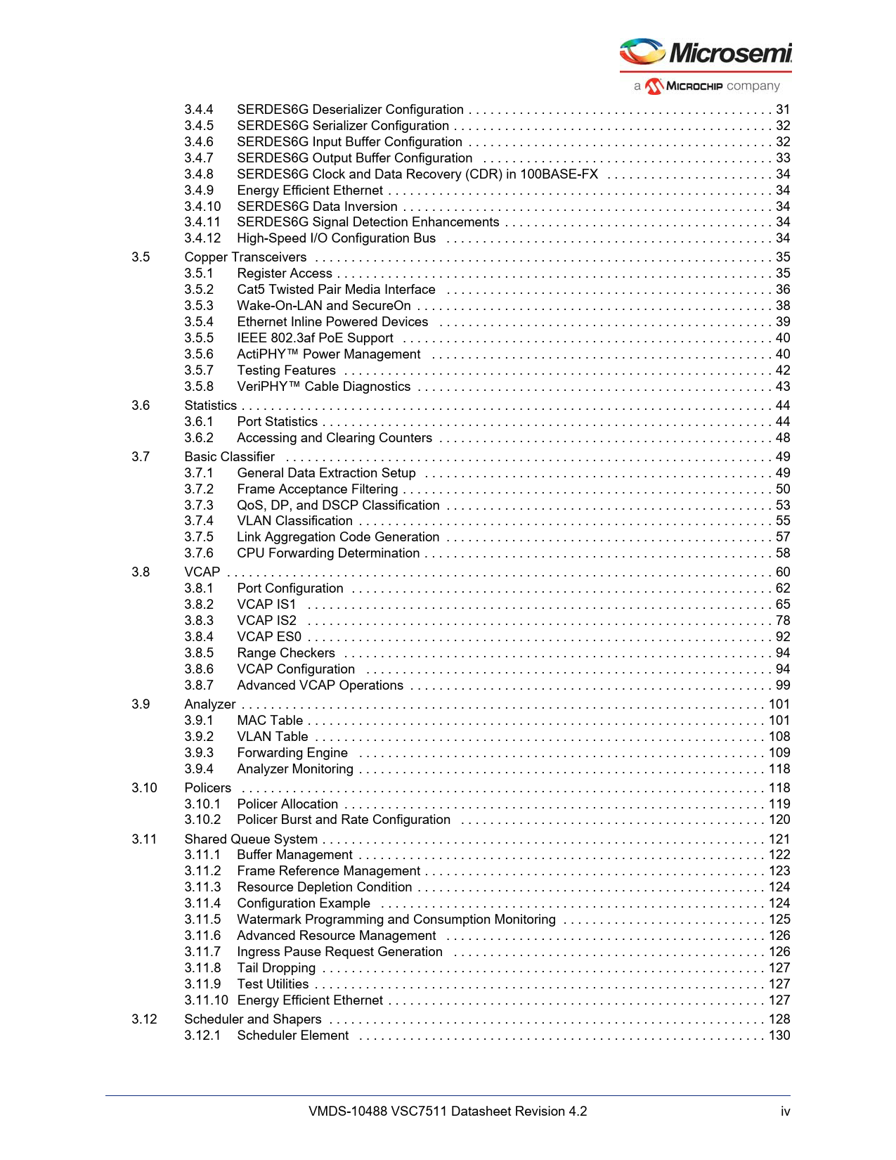 Línea de modelo para esta hoja de datos Versión de texto del documento link to page 46 link to page 47 link to page 47 link to page 48 link to page 49 link to page 49 link to page 49 link to page 49 link to page 49 link to page 50 link to page 50 link to page 51 link to page 53 link to page 54 link to page 55 link to page 55 link to page 57 link to page 58 link to page 59 link to page 59 link to page 63 link to page 64 link to page 64 link to page 65 link to page 68 link to page 70 link to page 72 link to page 73 link to page 75 link to page 77 link to page 80 link to page 93 link to page 107 link to page 109 link to page 109 link to page 114 link to page 116 link to page 116 link to page 123 link to page 124 link to page 133 link to page 133 link to page 134 link to page 135 link to page 136 link to page 137 link to page 138 link to page 139 link to page 139 link to page 140 link to page 141 link to page 141 link to page 142 link to page 142 link to page 142 link to page 143 link to page 145 3.4.4 SERDES6G Deserializer Configuration . 31 3.4.5 SERDES6G Serializer Configuration . 32 3.4.6 SERDES6G Input Buffer Configuration . 32 3.4.7 SERDES6G Output Buffer Configuration . 33 3.4.8 SERDES6G Clock and Data Recovery (CDR) in 100BASE-FX . 34 3.4.9 Energy Efficient Ethernet . 34 3.4.10 SERDES6G Data Inversion . 34 3.4.11 SERDES6G Signal Detection Enhancements . 34 3.4.12 High-Speed I/O Configuration Bus . 34 3.5 Copper Transceivers . 35 3.5.1 Register Access . 35 3.5.2 Cat5 Twisted Pair Media Interface . 36 3.5.3 Wake-On-LAN and SecureOn . 38 3.5.4 Ethernet Inline Powered Devices . 39 3.5.5 IEEE 802.3af PoE Support . 40 3.5.6 ActiPHY™ Power Management . 40 3.5.7 Testing Features . 42 3.5.8 VeriPHY™ Cable Diagnostics . 43 3.6 Statistics . 44 3.6.1 Port Statistics . 44 3.6.2 Accessing and Clearing Counters . 48 3.7 Basic Classifier . 49 3.7.1 General Data Extraction Setup . 49 3.7.2 Frame Acceptance Filtering . 50 3.7.3 QoS, DP, and DSCP Classification . 53 3.7.4 VLAN Classification . 55 3.7.5 Link Aggregation Code Generation . 57 3.7.6 CPU Forwarding Determination . 58 3.8 VCAP . 60 3.8.1 Port Configuration . 62 3.8.2 VCAP IS1 . 65 3.8.3 VCAP IS2 . 78 3.8.4 VCAP ES0 . 92 3.8.5 Range Checkers . 94 3.8.6 VCAP Configuration . 94 3.8.7 Advanced VCAP Operations . 99 3.9 Analyzer . 101 3.9.1 MAC Table . 101 3.9.2 VLAN Table . 108 3.9.3 Forwarding Engine . 109 3.9.4 Analyzer Monitoring . 118 3.10 Policers . 118 3.10.1 Policer Allocation . 119 3.10.2 Policer Burst and Rate Configuration . 120 3.11 Shared Queue System . 121 3.11.1 Buffer Management . 122 3.11.2 Frame Reference Management . 123 3.11.3 Resource Depletion Condition . 124 3.11.4 Configuration Example . 124 3.11.5 Watermark Programming and Consumption Monitoring . 125 3.11.6 Advanced Resource Management . 126 3.11.7 Ingress Pause Request Generation . 126 3.11.8 Tail Dropping . 127 3.11.9 Test Utilities . 127 3.11.10 Energy Efficient Ethernet . 127 3.12 Scheduler and Shapers . 128 3.12.1 Scheduler Element . 130 VMDS-10488 VSC7511 Datasheet Revision 4.2 iv Document Outline 1 Revision History 1.1 Revision 4.2 1.2 Revision 4.1 1.3 Revision 4.0 1.4 Revision 2.1 1.5 Revision 2.0 2 Product Overview 2.1 General Features 2.1.1 Layer 2 Switching 2.1.2 Layer 2 Multicast 2.1.3 Quality of Service 2.1.4 Security 2.1.5 Management 2.1.6 Product Parameters 2.2 Applications 2.3 Functional Overview 2.3.1 Frame Arrival 2.3.2 Basic and Advanced Frame Classification 2.3.3 Versatile Content Aware Processor (VCAP) 2.3.4 Policing 2.3.5 Layer-2 Forwarding 2.3.6 Shared Queue System and Egress Scheduler 2.3.7 Rewriter and Frame Departure 2.3.8 CPU Port Module 2.3.9 Synchronous Ethernet and Precision Time Protocol 2.3.10 CPU System and Interfaces 3 Functional Descriptions 3.1 Port Numbering and Mappings 3.1.1 Supported SerDes Interfaces 3.1.2 PCIe Mode 3.1.3 Logical Port Numbers 3.2 Port Modules 3.2.1 MAC 3.2.2 PCS 3.3 SERDES1G 3.3.1 SERDES1G Basic Configuration 3.3.2 SERDES1G Loopback Modes 3.3.3 Synchronous Ethernet 3.3.4 SERDES1G Deserializer Configuration 3.3.5 SERDES1G Serializer Configuration 3.3.6 SERDES1G Input Buffer Configuration 3.3.7 SERDES1G Output Buffer Configuration 3.3.8 SERDES1G Clock and Data Recovery (CDR) in 100BASE-FX 3.3.9 Energy Efficient Ethernet 3.3.10 SERDES1G Data Inversion 3.4 SERDES6G 3.4.1 SERDES6G Basic Configuration 3.4.2 SERDES6G Loopback Modes 3.4.3 Synchronous Ethernet 3.4.4 SERDES6G Deserializer Configuration 3.4.5 SERDES6G Serializer Configuration 3.4.6 SERDES6G Input Buffer Configuration 3.4.7 SERDES6G Output Buffer Configuration 3.4.8 SERDES6G Clock and Data Recovery (CDR) in 100BASE-FX 3.4.9 Energy Efficient Ethernet 3.4.10 SERDES6G Data Inversion 3.4.11 SERDES6G Signal Detection Enhancements 3.4.12 High-Speed I/O Configuration Bus 3.5 Copper Transceivers 3.5.1 Register Access 3.5.2 Cat5 Twisted Pair Media Interface 3.5.3 Wake-On-LAN and SecureOn 3.5.4 Ethernet Inline Powered Devices 3.5.5 IEEE 802.3af PoE Support 3.5.6 ActiPHY™ Power Management 3.5.7 Testing Features 3.5.8 VeriPHY™ Cable Diagnostics 3.6 Statistics 3.6.1 Port Statistics 3.6.2 Accessing and Clearing Counters 3.7 Basic Classifier 3.7.1 General Data Extraction Setup 3.7.2 Frame Acceptance Filtering 3.7.3 QoS, DP, and DSCP Classification 3.7.4 VLAN Classification 3.7.5 Link Aggregation Code Generation 3.7.6 CPU Forwarding Determination 3.8 VCAP 3.8.1 Port Configuration 3.8.2 VCAP IS1 3.8.3 VCAP IS2 3.8.4 VCAP ES0 3.8.5 Range Checkers 3.8.6 VCAP Configuration 3.8.7 Advanced VCAP Operations 3.9 Analyzer 3.9.1 MAC Table 3.9.2 VLAN Table 3.9.3 Forwarding Engine 3.9.4 Analyzer Monitoring 3.10 Policers 3.10.1 Policer Allocation 3.10.2 Policer Burst and Rate Configuration 3.11 Shared Queue System 3.11.1 Buffer Management 3.11.2 Frame Reference Management 3.11.3 Resource Depletion Condition 3.11.4 Configuration Example 3.11.5 Watermark Programming and Consumption Monitoring 3.11.6 Advanced Resource Management 3.11.7 Ingress Pause Request Generation 3.11.8 Tail Dr