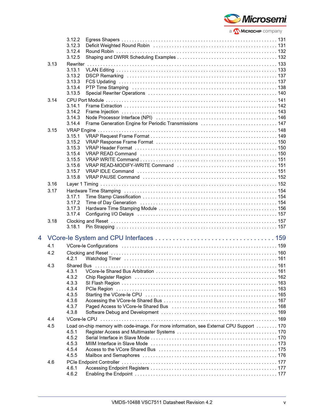 link to page 146 link to page 146 link to page 147 link to page 147 link to page 148 link to page 148 link to page 152 link to page 152 link to page 153 link to page 155 link to page 156 link to page 157 link to page 158 link to page 161 link to page 162 link to page 163 link to page 164 link to page 165 link to page 165 link to page 165 link to page 166 link to page 166 link to page 166 link to page 167 link to page 167 link to page 169 link to page 169 link to page 169 link to page 171 link to page 172 link to page 172 link to page 172 link to page 174 link to page 174 link to page 175 link to page 176 link to page 176 link to page 176 link to page 177 link to page 178 link to page 178 link to page 180 link to page 182 link to page 183 link to page 184 link to page 184 link to page 185 link to page 185 link to page 185 link to page 188 link to page 190 link to page 191 link to page 192 link to page 192 link to page 192 3.12.2 Egress Shapers . 131 3.12.3 Deficit Weighted Round Robin . 131 3.12.4 Round Robin . 132 3.12.5 Shaping and DWRR Scheduling Examples . 132 3.13 Rewriter . 133 3.13.1 VLAN Editing . 133 3.13.2 DSCP Remarking . 137 3.13.3 FCS Updating . 137 3.13.4 PTP Time Stamping . 138 3.13.5 Special Rewriter Operations . 140 3.14 CPU Port Module . 141 3.14.1 Frame Extraction . 142 3.14.2 Frame Injection . 143 3.14.3 Node Processor Interface (NPI) . 146 3.14.4 Frame Generation Engine for Periodic Transmissions . 147 3.15 VRAP Engine . 148 3.15.1 VRAP Request Frame Format . 149 3.15.2 VRAP Response Frame Format . 150 3.15.3 VRAP Header Format . 150 3.15.4 VRAP READ Command . 150 3.15.5 VRAP WRITE Command . 151 3.15.6 VRAP READ-MODIFY-WRITE Command . 151 3.15.7 VRAP IDLE Command . 151 3.15.8 VRAP PAUSE Command . 152 3.16 Layer 1 Timing . 152 3.17 Hardware Time Stamping . 154 3.17.1 Time Stamp Classification . 154 3.17.2 Time of Day Generation . 154 3.17.3 Hardware Time Stamping Module . 156 3.17.4 Configuring I/O Delays . 157 3.18 Clocking and Reset . 157 3.18.1 Pin Strapping . 157 4 VCore-Ie System and CPU Interfaces . 159 4.1 VCore-Ie Configurations . 159 4.2 Clocking and Reset . 160 4.2.1 Watchdog Timer . 161 4.3 Shared Bus . 161 4.3.1 VCore-Ie Shared Bus Arbitration . 161 4.3.2 Chip Register Region . 162 4.3.3 SI Flash Region . 163 4.3.4 PCIe Region . 163 4.3.5 Starting the VCore-Ie CPU . 165 4.3.6 Accessing the VCore-Ie Shared Bus . 167 4.3.7 Paged Access to VCore-Ie Shared Bus . 168 4.3.8 Software Debug and Development . 169 4.4 VCore-Ie CPU . 169 4.5 Load on-chip memory with code-image. For more information, see External CPU Support . 170 4.5.1 Register Access and Multimaster Systems . 170 4.5.2 Serial Interface in Slave Mode . 170 4.5.3 MIIM Interface in Slave Mode . 173 4.5.4 Access to the VCore Shared Bus . 175 4.5.5 Mailbox and Semaphores . 176 4.6 PCIe Endpoint Controller . 177 4.6.1 Accessing Endpoint Registers . 177 4.6.2 Enabling the Endpoint . 177 VMDS-10488 VSC7511 Datasheet Revision 4.2 v Document Outline 1 Revision History 1.1 Revision 4.2 1.2 Revision 4.1 1.3 Revision 4.0 1.4 Revision 2.1 1.5 Revision 2.0 2 Product Overview 2.1 General Features 2.1.1 Layer 2 Switching 2.1.2 Layer 2 Multicast 2.1.3 Quality of Service 2.1.4 Security 2.1.5 Management 2.1.6 Product Parameters 2.2 Applications 2.3 Functional Overview 2.3.1 Frame Arrival 2.3.2 Basic and Advanced Frame Classification 2.3.3 Versatile Content Aware Processor (VCAP) 2.3.4 Policing 2.3.5 Layer-2 Forwarding 2.3.6 Shared Queue System and Egress Scheduler 2.3.7 Rewriter and Frame Departure 2.3.8 CPU Port Module 2.3.9 Synchronous Ethernet and Precision Time Protocol 2.3.10 CPU System and Interfaces 3 Functional Descriptions 3.1 Port Numbering and Mappings 3.1.1 Supported SerDes Interfaces 3.1.2 PCIe Mode 3.1.3 Logical Port Numbers 3.2 Port Modules 3.2.1 MAC 3.2.2 PCS 3.3 SERDES1G 3.3.1 SERDES1G Basic Configuration 3.3.2 SERDES1G Loopback Modes 3.3.3 Synchronous Ethernet 3.3.4 SERDES1G Deserializer Configuration 3.3.5 SERDES1G Serializer Configuration 3.3.6 SERDES1G Input Buffer Configuration 3.3.7 SERDES1G Output Buffer Configuration 3.3.8 SERDES1G Clock and Data Recovery (CDR) in 100BASE-FX 3.3.9 Energy Efficient Ethernet 3.3.10 SERDES1G Data Inversion 3.4 SERDES6G 3.4.1 SERDES6G Basic Configuration 3.4.2 SERDES6G Loopback Modes 3.4.3 Synchronous Ethernet 3.4.4 SERDES6G Deserializer Configuration 3.4.5 SERDES6G Serializer Configuration 3.4.6 SERDES6G Input Buffer Configuration 3.4.7 SERDES6G Output Buffer Configuration 3.4.8 SERDES6G Clock and Data Recovery (CDR) in 100BASE-FX 3.4.9 Energy Efficient Ethernet 3.4.10 SERDES6G Data Inversion 3.4.11 SERDES6G Signal Detection Enhancements 3.4.12 High-Speed I/O Configuration Bus 3.5 Copper Transceivers 3.5.1 Register Access 3.5.2 Cat5 Twisted Pair Media Interface 3.5.3 Wake-On-LAN and SecureOn 3.5.4 Ethernet Inline Powered Devices 3.5.5 IEEE 802.3af PoE Support 3.5.6 ActiPHY™ Power Management 3.5.7 Testing Features 3.5.8 VeriPHY™ Cable Diagnostics 3.6 Statistics 3.6.1 Port Statistics 3.6.2 Accessing and Clearing Counters 3.7 Basic Classifier 3.7.1 General Data Extraction Setup 3.7.2 Frame Acceptance Filtering 3.7.3 QoS, DP, and DSCP Classification 3.7.4 VLAN Classification 3.7.5 Link Aggregation Code Generation 3.7.6 CPU Forwarding Determination 3.8 VCAP 3.8.1 Port Configuration 3.8.2 VCAP IS1 3.8.3 VCAP IS2 3.8.4 VCAP ES0 3.8.5 Range Checkers 3.8.6 VCAP Configuration 3.8.7 Advanced VCAP Operations 3.9 Analyzer 3.9.1 MAC Table 3.9.2 VLAN Table 3.9.3 Forwarding Engine 3.9.4 Analyzer Monitoring 3.10 Policers 3.10.1 Policer Allocation 3.10.2 Policer Burst and Rate Configuration 3.11 Shared Queue System 3.11.1 Buffer Management 3.11.2 Frame Reference Management 3.11.3 Resource Depletion Condition 3.11.4 Configuration Example 3.11.5 Watermark Programming and Consumption Monitoring 3.11.6 Advanced Resource Management 3.11.7 Ingress Pause Request Generation 3.11.8 Tail Dropping 3.11.9 Test Utilities 3.11.10 Energy Efficient Ethernet 3.12 Scheduler and Shapers 3.12.1 Sch