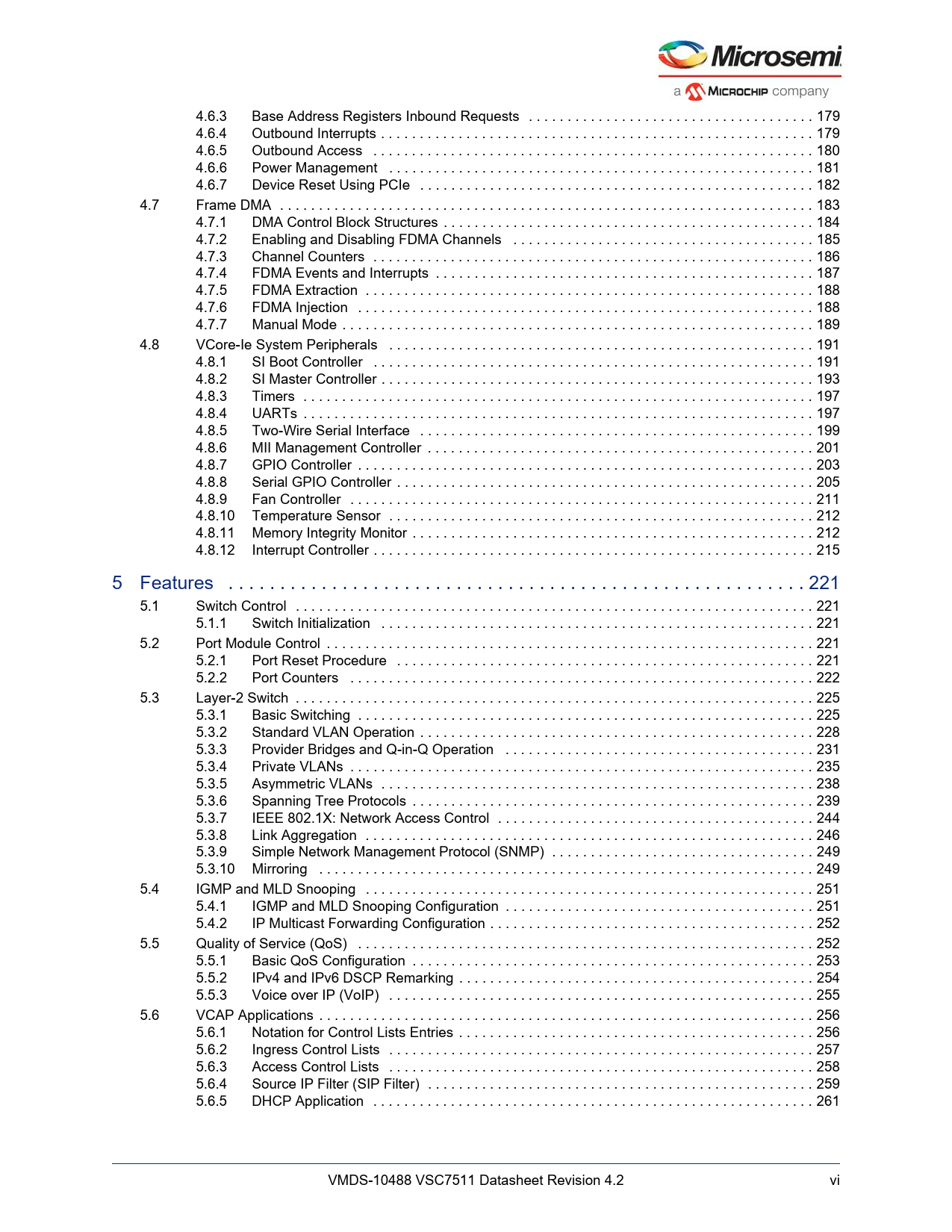 Línea de modelo para esta hoja de datos Versión de texto del documento link to page 194 link to page 194 link to page 195 link to page 196 link to page 197 link to page 198 link to page 199 link to page 200 link to page 201 link to page 202 link to page 203 link to page 203 link to page 204 link to page 206 link to page 206 link to page 208 link to page 212 link to page 212 link to page 214 link to page 216 link to page 218 link to page 220 link to page 226 link to page 227 link to page 227 link to page 230 link to page 236 link to page 236 link to page 236 link to page 236 link to page 236 link to page 237 link to page 240 link to page 240 link to page 243 link to page 246 link to page 250 link to page 253 link to page 254 link to page 259 link to page 261 link to page 264 link to page 264 link to page 266 link to page 266 link to page 267 link to page 267 link to page 268 link to page 269 link to page 270 link to page 271 link to page 271 link to page 272 link to page 273 link to page 274 link to page 276 4.6.3 Base Address Registers Inbound Requests . 179 4.6.4 Outbound Interrupts . 179 4.6.5 Outbound Access . 180 4.6.6 Power Management . 181 4.6.7 Device Reset Using PCIe . 182 4.7 Frame DMA . 183 4.7.1 DMA Control Block Structures . 184 4.7.2 Enabling and Disabling FDMA Channels . 185 4.7.3 Channel Counters . 186 4.7.4 FDMA Events and Interrupts . 187 4.7.5 FDMA Extraction . 188 4.7.6 FDMA Injection . 188 4.7.7 Manual Mode . 189 4.8 VCore-Ie System Peripherals . 191 4.8.1 SI Boot Controller . 191 4.8.2 SI Master Controller . 193 4.8.3 Timers . 197 4.8.4 UARTs . 197 4.8.5 Two-Wire Serial Interface . 199 4.8.6 MII Management Controller . 201 4.8.7 GPIO Controller . 203 4.8.8 Serial GPIO Controller . 205 4.8.9 Fan Controller . 211 4.8.10 Temperature Sensor . 212 4.8.11 Memory Integrity Monitor . 212 4.8.12 Interrupt Controller . 215 5 Features . 221 5.1 Switch Control . 221 5.1.1 Switch Initialization . 221 5.2 Port Module Control . 221 5.2.1 Port Reset Procedure . 221 5.2.2 Port Counters . 222 5.3 Layer-2 Switch . 225 5.3.1 Basic Switching . 225 5.3.2 Standard VLAN Operation . 228 5.3.3 Provider Bridges and Q-in-Q Operation . 231 5.3.4 Private VLANs . 235 5.3.5 Asymmetric VLANs . 238 5.3.6 Spanning Tree Protocols . 239 5.3.7 IEEE 802.1X: Network Access Control . 244 5.3.8 Link Aggregation . 246 5.3.9 Simple Network Management Protocol (SNMP) . 249 5.3.10 Mirroring . 249 5.4 IGMP and MLD Snooping . 251 5.4.1 IGMP and MLD Snooping Configuration . 251 5.4.2 IP Multicast Forwarding Configuration . 252 5.5 Quality of Service (QoS) . 252 5.5.1 Basic QoS Configuration . 253 5.5.2 IPv4 and IPv6 DSCP Remarking . 254 5.5.3 Voice over IP (VoIP) . 255 5.6 VCAP Applications . 256 5.6.1 Notation for Control Lists Entries . 256 5.6.2 Ingress Control Lists . 257 5.6.3 Access Control Lists . 258 5.6.4 Source IP Filter (SIP Filter) . 259 5.6.5 DHCP Application . 261 VMDS-10488 VSC7511 Datasheet Revision 4.2 vi Document Outline 1 Revision History 1.1 Revision 4.2 1.2 Revision 4.1 1.3 Revision 4.0 1.4 Revision 2.1 1.5 Revision 2.0 2 Product Overview 2.1 General Features 2.1.1 Layer 2 Switching 2.1.2 Layer 2 Multicast 2.1.3 Quality of Service 2.1.4 Security 2.1.5 Management 2.1.6 Product Parameters 2.2 Applications 2.3 Functional Overview 2.3.1 Frame Arrival 2.3.2 Basic and Advanced Frame Classification 2.3.3 Versatile Content Aware Processor (VCAP) 2.3.4 Policing 2.3.5 Layer-2 Forwarding 2.3.6 Shared Queue System and Egress Scheduler 2.3.7 Rewriter and Frame Departure 2.3.8 CPU Port Module 2.3.9 Synchronous Ethernet and Precision Time Protocol 2.3.10 CPU System and Interfaces 3 Functional Descriptions 3.1 Port Numbering and Mappings 3.1.1 Supported SerDes Interfaces 3.1.2 PCIe Mode 3.1.3 Logical Port Numbers 3.2 Port Modules 3.2.1 MAC 3.2.2 PCS 3.3 SERDES1G 3.3.1 SERDES1G Basic Configuration 3.3.2 SERDES1G Loopback Modes 3.3.3 Synchronous Ethernet 3.3.4 SERDES1G Deserializer Configuration 3.3.5 SERDES1G Serializer Configuration 3.3.6 SERDES1G Input Buffer Configuration 3.3.7 SERDES1G Output Buffer Configuration 3.3.8 SERDES1G Clock and Data Recovery (CDR) in 100BASE-FX 3.3.9 Energy Efficient Ethernet 3.3.10 SERDES1G Data Inversion 3.4 SERDES6G 3.4.1 SERDES6G Basic Configuration 3.4.2 SERDES6G Loopback Modes 3.4.3 Synchronous Ethernet 3.4.4 SERDES6G Deserializer Configuration 3.4.5 SERDES6G Serializer Configuration 3.4.6 SERDES6G Input Buffer Configuration 3.4.7 SERDES6G Output Buffer Configuration 3.4.8 SERDES6G Clock and Data Recovery (CDR) in 100BASE-FX 3.4.9 Energy Efficient Ethernet 3.4.10 SERDES6G Data Inversion 3.4.11 SERDES6G Signal Detection Enhancements 3.4.12 High-Speed I/O Configuration Bus 3.5 Copper Transceivers 3.5.1 Register Access 3.5.2 Cat5 Twisted Pair Media Interface 3.5.3 Wake-On-LAN and SecureOn 3.5.4 Ethernet Inline Powered Devices 3.5.5 IEEE 802.3af PoE Support 3.5.6 ActiPHY™ Power Management 3.5.7 Testing Features 3.5.8 VeriPHY™ Cable Diagnostics 3.6 Statistics 3.6.1 Port Statistics 3.6.2 Accessing and Clearing Counters 3.7 Basic Classifier 3.7.1 General Data Extraction Setup 3.7.2 Frame Acceptance Filtering 3.7.3 QoS, DP, and DSCP Classification 3.7.4 VLAN Classification 3.7.5 Link Aggregation Code Generation 3.7.6 CPU Forwarding Determination 3.8 VCAP 3.8.1 Port Configuration 3.8.2 VCAP IS1 3.8.3 VCAP IS2 3.8.4 VCAP ES0 3.8.5 Range Checkers 3.8.6 VCAP Configuration 3.8.7 Advanced VCAP Operations 3.9 Analyzer 3.9.1 MAC Table 3.9.2 VLAN Table 3.9.3 Forwarding Engine 3.9.4 Analyzer Monitoring 3.10 Policers 3.10.1 Policer Allocation 3.10.2 Policer Burst and Rate Configuration 3.11 Shared Queue System 3.11.1 Buffer Management 3.11.2 Frame Reference Management 3.11.3 Resource Depletion Condition 3.11.4 Configuration Example 3.11.5 Watermark Programming and Consumption Monitoring 3.11.6 Advanced Resource Management 3.11.7 Ingress Pause Request Generation 3.11.8 Tail Dropping 3.11.9 Test Utilities 3.11.10 Energy Efficient Ethernet 3.12 Scheduler and Shapers 3.12.1 Scheduler Element