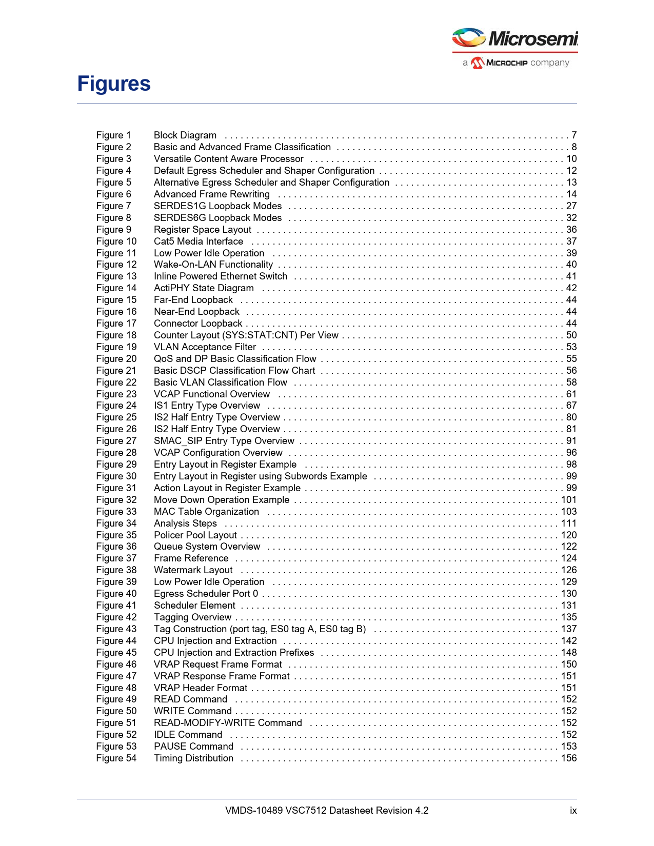 Figure 1 Block Diagram . 7 Figure 2 Basic and Advanced Frame Classification . 8 Figure 3 Versatile Content Aware Processor . 10 Figure 4 Default Egress Scheduler and Shaper Configuration . 12 Figure 5 Alternative Egress Scheduler and Shaper Configuration . 13 Figure 6 Advanced Frame Rewriting . 14 Figure 7 SERDES1G Loopback Modes . 27 Figure 8 SERDES6G Loopback Modes . 32 Figure 9 Register Space Layout . 36 Figure 10 Cat5 Media Interface . 37 Figure 11 Low Power Idle Operation . 39 Figure 12 Wake-On-LAN Functionality . 40 Figure 13 Inline Powered Ethernet Switch . 41 Figure 14 ActiPHY State Diagram . 42 Figure 15 Far-End Loopback . 44 Figure 16 Near-End Loopback . 44 Figure 17 Connector Loopback . 44 Figure 18 Counter Layout (SYS:STAT:CNT) Per View . 50 Figure 19 VLAN Acceptance Filter . 53 Figure 20 QoS and DP Basic Classification Flow . 55 Figure 21 Basic DSCP Classification Flow Chart . 56 Figure 22 Basic VLAN Classification Flow . 58 Figure 23 VCAP Functional Overview . 61 Figure 24 IS1 Entry Type Overview . 67 Figure 25 IS2 Half Entry Type Overview . 80 Figure 26 IS2 Half Entry Type Overview . 81 Figure 27 SMAC_SIP Entry Type Overview . 91 Figure 28 VCAP Configuration Overview . 96 Figure 29 Entry Layout in Register Example . 98 Figure 30 Entry Layout in Register using Subwords Example . 99 Figure 31 Action Layout in Register Example . 99 Figure 32 Move Down Operation Example . 101 Figure 33 MAC Table Organization . 103 Figure 34 Analysis Steps . 111 Figure 35 Policer Pool Layout . 120 Figure 36 Queue System Overview . 122 Figure 37 Frame Reference . 124 Figure 38 Watermark Layout . 126 Figure 39 Low Power Idle Operation . 129 Figure 40 Egress Scheduler Port 0 . 130 Figure 41 Scheduler Element . 131 Figure 42 Tagging Overview . 135 Figure 43 Tag Construction (port tag, ES0 tag A, ES0 tag B) . 137 Figure 44 CPU Injection and Extraction . 142 Figure 45 CPU Injection and Extraction Prefixes . 148 Figure 46 VRAP Request Frame Format . 150 Figure 47 VRAP Response Frame Format . 151 Figure 48 VRAP Header Format . 151 Figure 49 READ Command . 152 Figure 50 WRITE Command . 152 Figure 51 READ-MODIFY-WRITE Command . 152 Figure 52 IDLE Command . 152 Figure 53 PAUSE Command . 153 Figure 54 Timing Distribution . 156 VMDS-10489 VSC7512 Datasheet Revision 4.2 ix Document Outline 1 Revision History 1.1 Revision 4.2 1.2 Revision 4.1 1.3 Revision 4.0 1.4 Revision 2.1 1.5 Revision 2.0 2 Product Overview 2.1 General Features 2.1.1 Layer 2 Switching 2.1.2 Layer 2 Multicast 2.1.3 Quality of Service 2.1.4 Security 2.1.5 Management 2.1.6 Product Parameters 2.2 Applications 2.3 Functional Overview 2.3.1 Frame Arrival 2.3.2 Basic and Advanced Frame Classification 2.3.3 Versatile Content Aware Processor (VCAP) 2.3.4 Policing 2.3.5 Layer-2 Forwarding 2.3.6 Shared Queue System and Egress Scheduler 2.3.7 Rewriter and Frame Departure 2.3.8 CPU Port Module 2.3.9 Synchronous Ethernet and Precision Time Protocol 2.3.10 CPU System and Interfaces 3 Functional Descriptions 3.1 Port Numbering and Mappings 3.1.1 Supported SerDes Interfaces 3.1.2 QSGMII 3.1.3 Miscellaneous Port Muxing 3.1.4 PCIe Mode 3.1.5 Logical Port Numbers 3.2 Port Modules 3.2.1 MAC 3.2.2 PCS 3.3 SERDES1G 3.3.1 SERDES1G Basic Configuration 3.3.2 SERDES1G Loopback Modes 3.3.3 Synchronous Ethernet 3.3.4 SERDES1G Deserializer Configuration 3.3.5 SERDES1G Serializer Configuration 3.3.6 SERDES1G Input Buffer Configuration 3.3.7 SERDES1G Output Buffer Configuration 3.3.8 SERDES1G Clock and Data Recovery (CDR) in 100BASE-FX 3.3.9 Energy Efficient Ethernet 3.3.10 SERDES1G Data Inversion 3.4 SERDES6G 3.4.1 SERDES6G Basic Configuration 3.4.2 SERDES6G Loopback Modes 3.4.3 Synchronous Ethernet 3.4.4 SERDES6G Deserializer Configuration 3.4.5 SERDES6G Serializer Configuration 3.4.6 SERDES6G Input Buffer Configuration 3.4.7 SERDES6G Output Buffer Configuration 3.4.8 SERDES6G Clock and Data Recovery (CDR) in 100BASE-FX 3.4.9 Energy Efficient Ethernet 3.4.10 SERDES6G Data Inversion 3.4.11 SERDES6G Signal Detection Enhancements 3.4.12 High-Speed I/O Configuration Bus 3.5 Copper Transceivers 3.5.1 Register Access 3.5.2 Cat5 Twisted Pair Media Interface 3.5.3 Wake-On-LAN and SecureOn 3.5.4 Ethernet Inline Powered Devices 3.5.5 IEEE 802.3af PoE Support 3.5.6 ActiPHY™ Power Management 3.5.7 Testing Features 3.5.8 VeriPHY™ Cable Diagnostics 3.6 Statistics 3.6.1 Port Statistics 3.6.2 Accessing and Clearing Counters 3.7 Basic Classifier 3.7.1 General Data Extraction Setup 3.7.2 Frame Acceptance Filtering 3.7.3 QoS, DP, and DSCP Classification 3.7.4 VLAN Classification 3.7.5 Link Aggregation Code Generation 3.7.6 CPU Forwarding Determination 3.8 VCAP 3.8.1 Port Configuration 3.8.2 VCAP IS1 3.8.3 VCAP IS2 3.8.4 VCAP ES0 3.8.5 Range Checkers 3.8.6 VCAP Configuration 3.8.7 Advanced VCAP Operations 3.9 Analyzer 3.9.1 MAC Table 3.9.2 VLAN Table 3.9.3 Forwarding Engine 3.9.4 Analyzer Monitoring 3.10 Policers 3.10.1 Policer Allocation 3.10.2 Policer Burst and Rate Configuration 3.11 Shared Queue System 3.11.1 Buffer Management 3.11.2 Frame Reference Management 3.11.3 Resource Depletion Condition 3.11.4 Configuration Example 3.11.5 Watermark Programming and Consumption Monitoring 3.11.6 Advanced Resource Management 3.11.7 Ingress Pause Request Generation 3.11.8 Tail Dropping 3.11.9 Test Utilities 3.11.10 Energy Efficient Ethernet 3.12 Scheduler and Shapers 3.12.1 Scheduler Element 3.12.2 Egress Shapers 3.12.3 Deficit Weighted Round Robin 3.12.4 Round Robin 3.12.5 Shaping and DWRR Scheduling Examples 3.13 Rewriter 3.13.1 VLAN Editing 3.13.2 DSCP Remarking 3.13.3 FCS Updating 3.13.4 PTP Time Stamping 3.13.5 Special Rewriter Operations 3.14 CPU Port Module 3.14.1 Frame Extraction 3.14.2 Frame Injection 3.14.3 Node Processor Interface (NPI) 3.14.4 Frame Generation Engine for Periodic Transmissions 3.15 VRAP Engine 3.15.1 VRAP Request Frame Format 3.15.2 VRAP Response Frame Format 3.15.3 VRAP Header Format 3.15.4 VRAP READ Command 3.15.5 VRAP WRITE Command 3.15.6 VRAP READ-MODIFY-WRITE