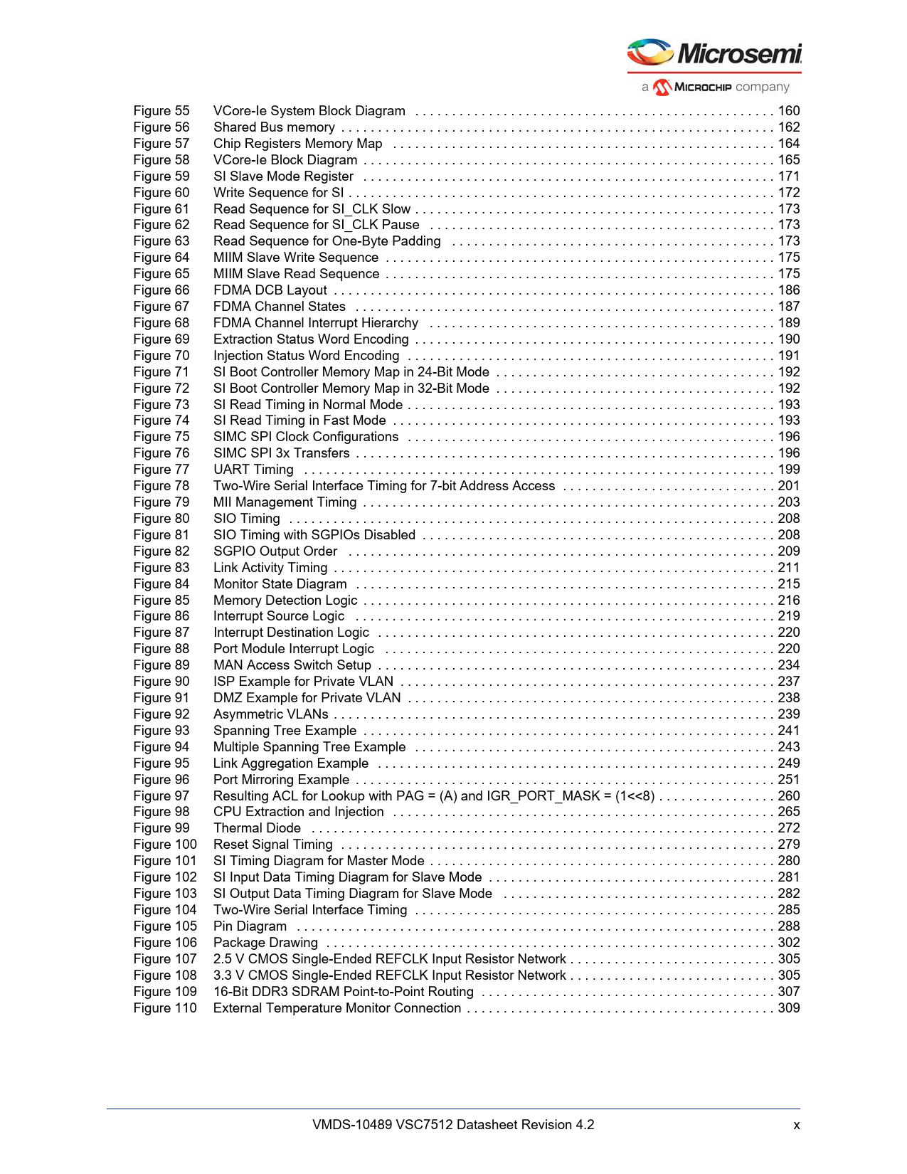 Línea de modelo para esta hoja de datos Versión de texto del documento link to page 175 link to page 177 link to page 179 link to page 180 link to page 186 link to page 187 link to page 188 link to page 188 link to page 188 link to page 190 link to page 190 link to page 201 link to page 202 link to page 204 link to page 205 link to page 206 link to page 207 link to page 207 link to page 208 link to page 208 link to page 211 link to page 211 link to page 214 link to page 216 link to page 218 link to page 223 link to page 223 link to page 224 link to page 226 link to page 230 link to page 231 link to page 234 link to page 235 link to page 235 link to page 249 link to page 252 link to page 253 link to page 254 link to page 256 link to page 258 link to page 264 link to page 266 link to page 275 link to page 280 link to page 287 link to page 294 link to page 295 link to page 296 link to page 297 link to page 300 link to page 303 link to page 317 link to page 320 link to page 320 link to page 322 link to page 324 Figure 55 VCore-Ie System Block Diagram . 160 Figure 56 Shared Bus memory . 162 Figure 57 Chip Registers Memory Map . 164 Figure 58 VCore-Ie Block Diagram . 165 Figure 59 SI Slave Mode Register . 171 Figure 60 Write Sequence for SI . 172 Figure 61 Read Sequence for SI_CLK Slow . 173 Figure 62 Read Sequence for SI_CLK Pause . 173 Figure 63 Read Sequence for One-Byte Padding . 173 Figure 64 MIIM Slave Write Sequence . 175 Figure 65 MIIM Slave Read Sequence . 175 Figure 66 FDMA DCB Layout . 186 Figure 67 FDMA Channel States . 187 Figure 68 FDMA Channel Interrupt Hierarchy . 189 Figure 69 Extraction Status Word Encoding . 190 Figure 70 Injection Status Word Encoding . 191 Figure 71 SI Boot Controller Memory Map in 24-Bit Mode . 192 Figure 72 SI Boot Controller Memory Map in 32-Bit Mode . 192 Figure 73 SI Read Timing in Normal Mode . 193 Figure 74 SI Read Timing in Fast Mode . 193 Figure 75 SIMC SPI Clock Configurations . 196 Figure 76 SIMC SPI 3x Transfers . 196 Figure 77 UART Timing . 199 Figure 78 Two-Wire Serial Interface Timing for 7-bit Address Access . 201 Figure 79 MII Management Timing . 203 Figure 80 SIO Timing . 208 Figure 81 SIO Timing with SGPIOs Disabled . 208 Figure 82 SGPIO Output Order . 209 Figure 83 Link Activity Timing . 211 Figure 84 Monitor State Diagram . 215 Figure 85 Memory Detection Logic . 216 Figure 86 Interrupt Source Logic . 219 Figure 87 Interrupt Destination Logic . 220 Figure 88 Port Module Interrupt Logic . 220 Figure 89 MAN Access Switch Setup . 234 Figure 90 ISP Example for Private VLAN . 237 Figure 91 DMZ Example for Private VLAN . 238 Figure 92 Asymmetric VLANs . 239 Figure 93 Spanning Tree Example . 241 Figure 94 Multiple Spanning Tree Example . 243 Figure 95 Link Aggregation Example . 249 Figure 96 Port Mirroring Example . 251 Figure 97 Resulting ACL for Lookup with PAG = (A) and IGR_PORT_MASK = (1<<8) . 260 Figure 98 CPU Extraction and Injection . 265 Figure 99 Thermal Diode . 272 Figure 100 Reset Signal Timing . 279 Figure 101 SI Timing Diagram for Master Mode . 280 Figure 102 SI Input Data Timing Diagram for Slave Mode . 281 Figure 103 SI Output Data Timing Diagram for Slave Mode . 282 Figure 104 Two-Wire Serial Interface Timing . 285 Figure 105 Pin Diagram . 288 Figure 106 Package Drawing . 302 Figure 107 2.5 V CMOS Single-Ended REFCLK Input Resistor Network . 305 Figure 108 3.3 V CMOS Single-Ended REFCLK Input Resistor Network . 305 Figure 109 16-Bit DDR3 SDRAM Point-to-Point Routing . 307 Figure 110 External Temperature Monitor Connection . 309 VMDS-10489 VSC7512 Datasheet Revision 4.2 x Document Outline 1 Revision History 1.1 Revision 4.2 1.2 Revision 4.1 1.3 Revision 4.0 1.4 Revision 2.1 1.5 Revision 2.0 2 Product Overview 2.1 General Features 2.1.1 Layer 2 Switching 2.1.2 Layer 2 Multicast 2.1.3 Quality of Service 2.1.4 Security 2.1.5 Management 2.1.6 Product Parameters 2.2 Applications 2.3 Functional Overview 2.3.1 Frame Arrival 2.3.2 Basic and Advanced Frame Classification 2.3.3 Versatile Content Aware Processor (VCAP) 2.3.4 Policing 2.3.5 Layer-2 Forwarding 2.3.6 Shared Queue System and Egress Scheduler 2.3.7 Rewriter and Frame Departure 2.3.8 CPU Port Module 2.3.9 Synchronous Ethernet and Precision Time Protocol 2.3.10 CPU System and Interfaces 3 Functional Descriptions 3.1 Port Numbering and Mappings 3.1.1 Supported SerDes Interfaces 3.1.2 QSGMII 3.1.3 Miscellaneous Port Muxing 3.1.4 PCIe Mode 3.1.5 Logical Port Numbers 3.2 Port Modules 3.2.1 MAC 3.2.2 PCS 3.3 SERDES1G 3.3.1 SERDES1G Basic Configuration 3.3.2 SERDES1G Loopback Modes 3.3.3 Synchronous Ethernet 3.3.4 SERDES1G Deserializer Configuration 3.3.5 SERDES1G Serializer Configuration 3.3.6 SERDES1G Input Buffer Configuration 3.3.7 SERDES1G Output Buffer Configuration 3.3.8 SERDES1G Clock and Data Recovery (CDR) in 100BASE-FX 3.3.9 Energy Efficient Ethernet 3.3.10 SERDES1G Data Inversion 3.4 SERDES6G 3.4.1 SERDES6G Basic Configuration 3.4.2 SERDES6G Loopback Modes 3.4.3 Synchronous Ethernet 3.4.4 SERDES6G Deserializer Configuration 3.4.5 SERDES6G Serializer Configuration 3.4.6 SERDES6G Input Buffer Configuration 3.4.7 SERDES6G Output Buffer Configuration 3.4.8 SERDES6G Clock and Data Recovery (CDR) in 100BASE-FX 3.4.9 Energy Efficient Ethernet 3.4.10 SERDES6G Data Inversion 3.4.11 SERDES6G Signal Detection Enhancements 3.4.12 High-Speed I/O Configuration Bus 3.5 Copper Transceivers 3.5.1 Register Access 3.5.2 Cat5 Twisted Pair Media Interface 3.5.3 Wake-On-LAN and SecureOn 3.5.4 Ethernet Inline Powered Devices 3.5.5 IEEE 802.3af PoE Support 3.5.6 ActiPHY™ Power Management 3.5.7 Testing Features 3.5.8 VeriPHY™ Cable Diagnostics 3.6 Statistics 3.6.1 Port Statistics 3.6.2 Accessing and Clearing Counters 3.7 Basic Classifier 3.7.1 General Data Extraction Setup 3.7.2 Frame Acceptance Filtering 3.7.3 QoS, DP, and DSCP Classification 3.7.4 VLAN Classification 3.7.5 Link Aggregation Code Generation 3.7.6 CPU Forwarding Determination 3.8 VCAP 3.8.1 Port Configuration 3.8.2 VCAP IS1 3.